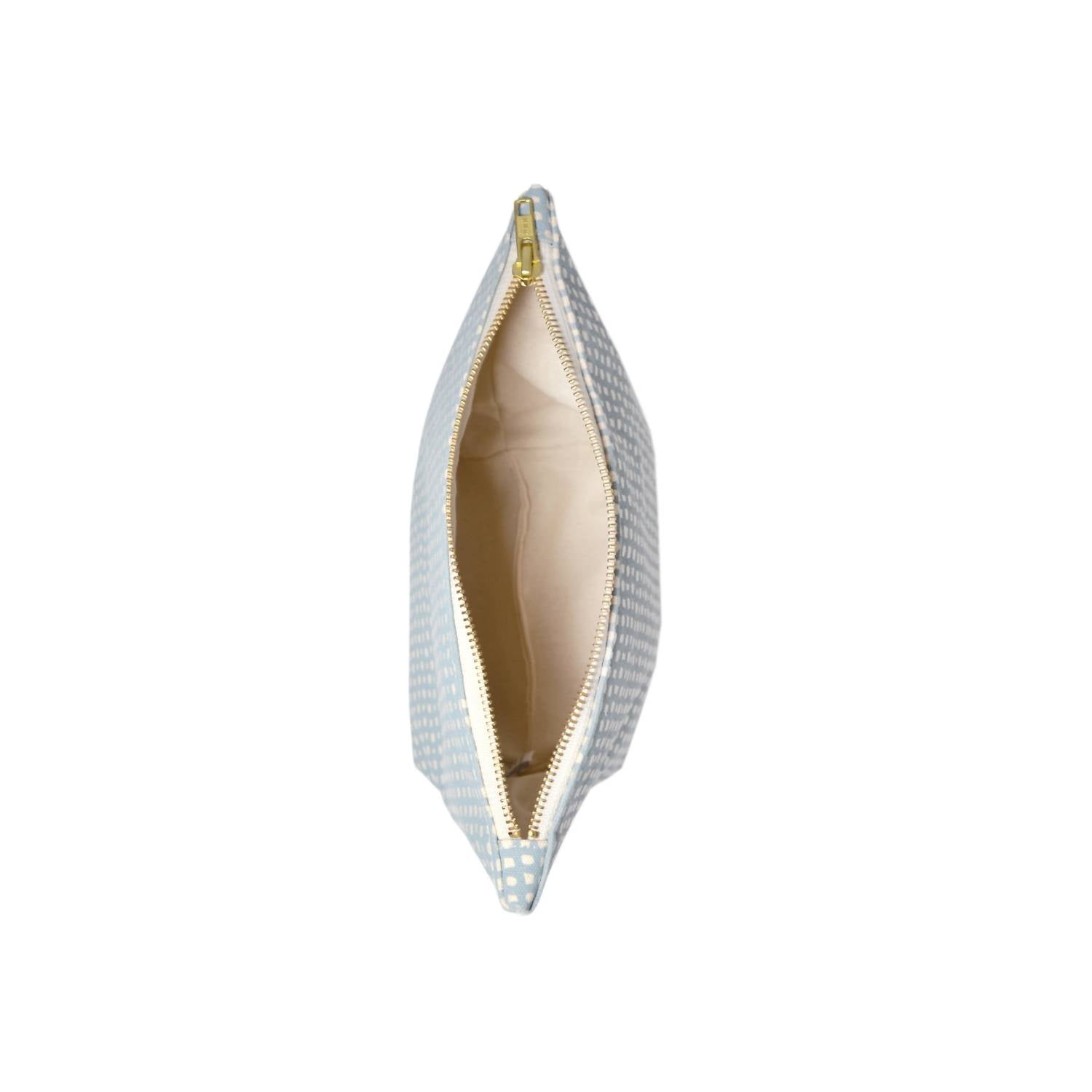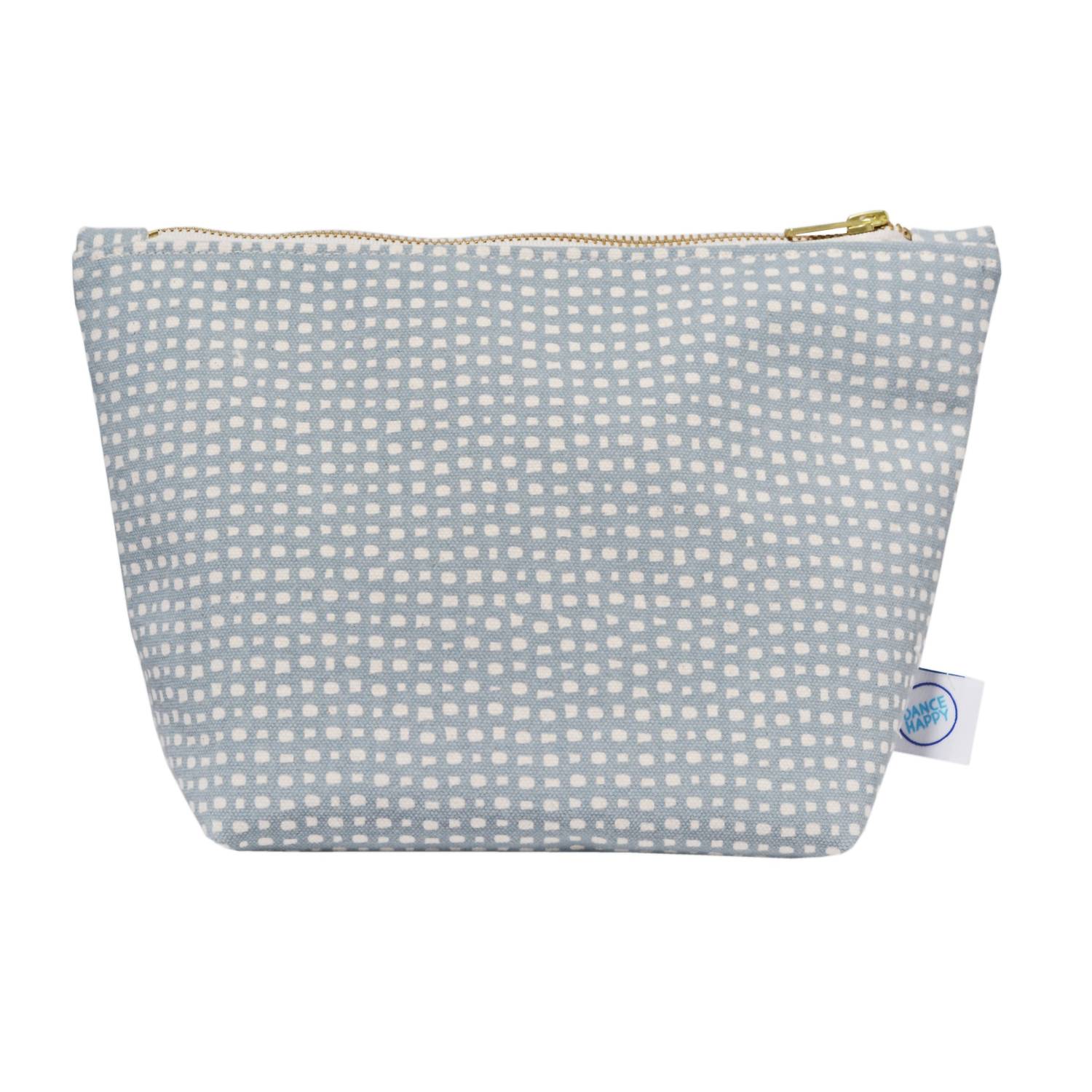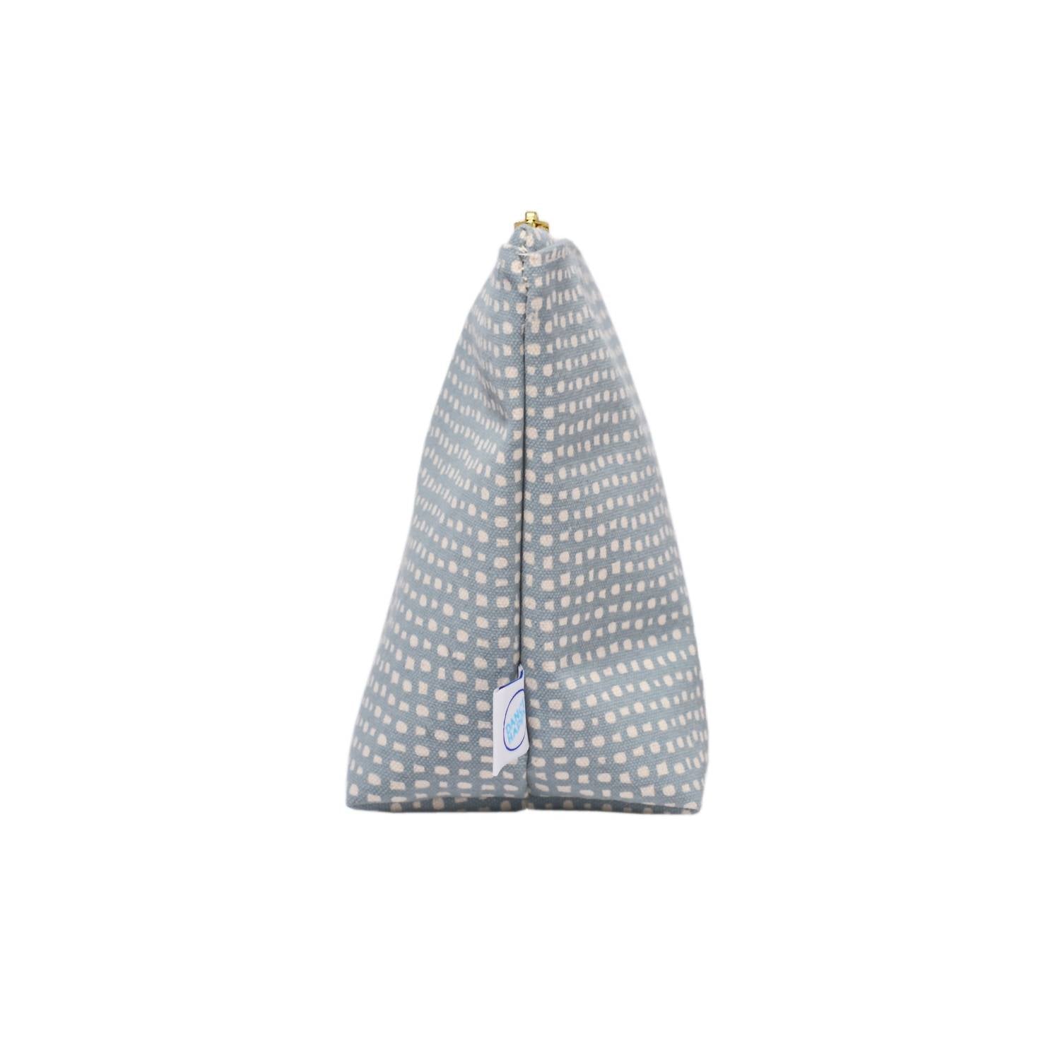 A bolsa de maquiagem perfeita para todos os seus itens essenciais. Um acessório chique confeccionado em lona de algodão de 425 g, com um padrão circular desenhado à mão e serigrafado em azul-aço. Forrada com algodão orgânico, esta bolsa mede aproximadamente 27,5 cm x 18,7 cm e tem um fundo reforçado de 10 cm, proporcionando amplo espaço para seus itens essenciais sem sobrecarregar sua mala. Um zíper de latão oferece um fechamento seguro, e cada bolsa é única, com a disposição do padrão variando ligeiramente. Feita à mão nos EUA, esta bolsa ecologicamente correta requer lavagem apenas à mão, sendo a limpeza localizada a preferida, e deve ser mantida livre de alvejantes.