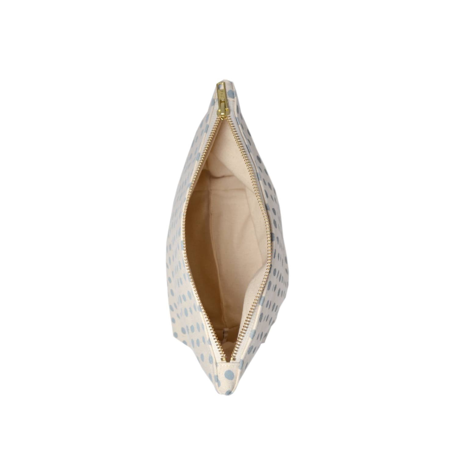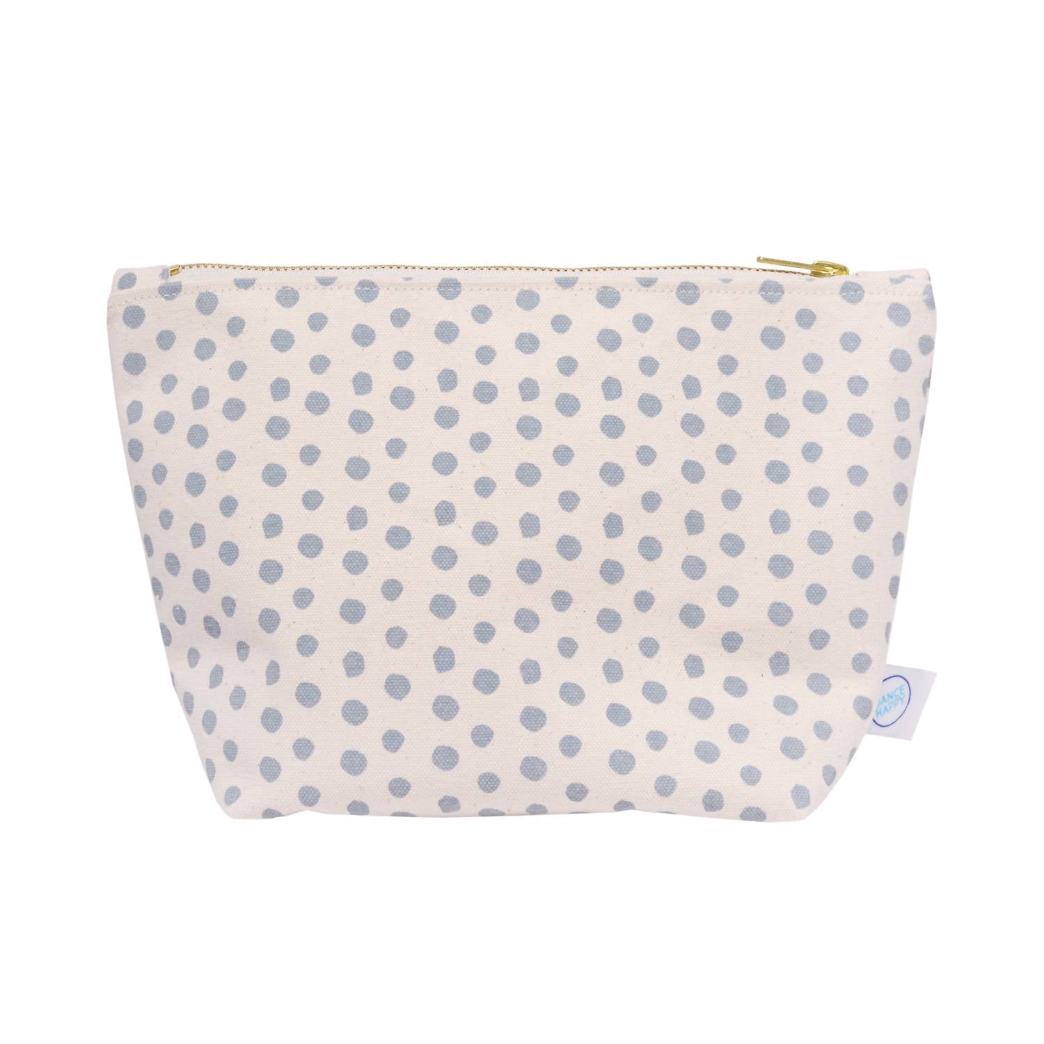 A bolsa de maquiagem mais legal que cabe tudo o que você precisa. Um acessório chique e prático em bege com padrão de bolinhas azul-aço. Confeccionada em lona de algodão durável de 425 g e forrada com algodão orgânico, esta bolsa possui fecho de zíper de latão. Medindo aproximadamente 27,5 cm x 18,7 cm com fundo reforçado de 10 cm, oferece amplo espaço sem ser volumosa. Feita à mão nos EUA, é ecologicamente correta, com tinta atóxica, e requer lavagem apenas à mão, sendo preferível a limpeza localizada.