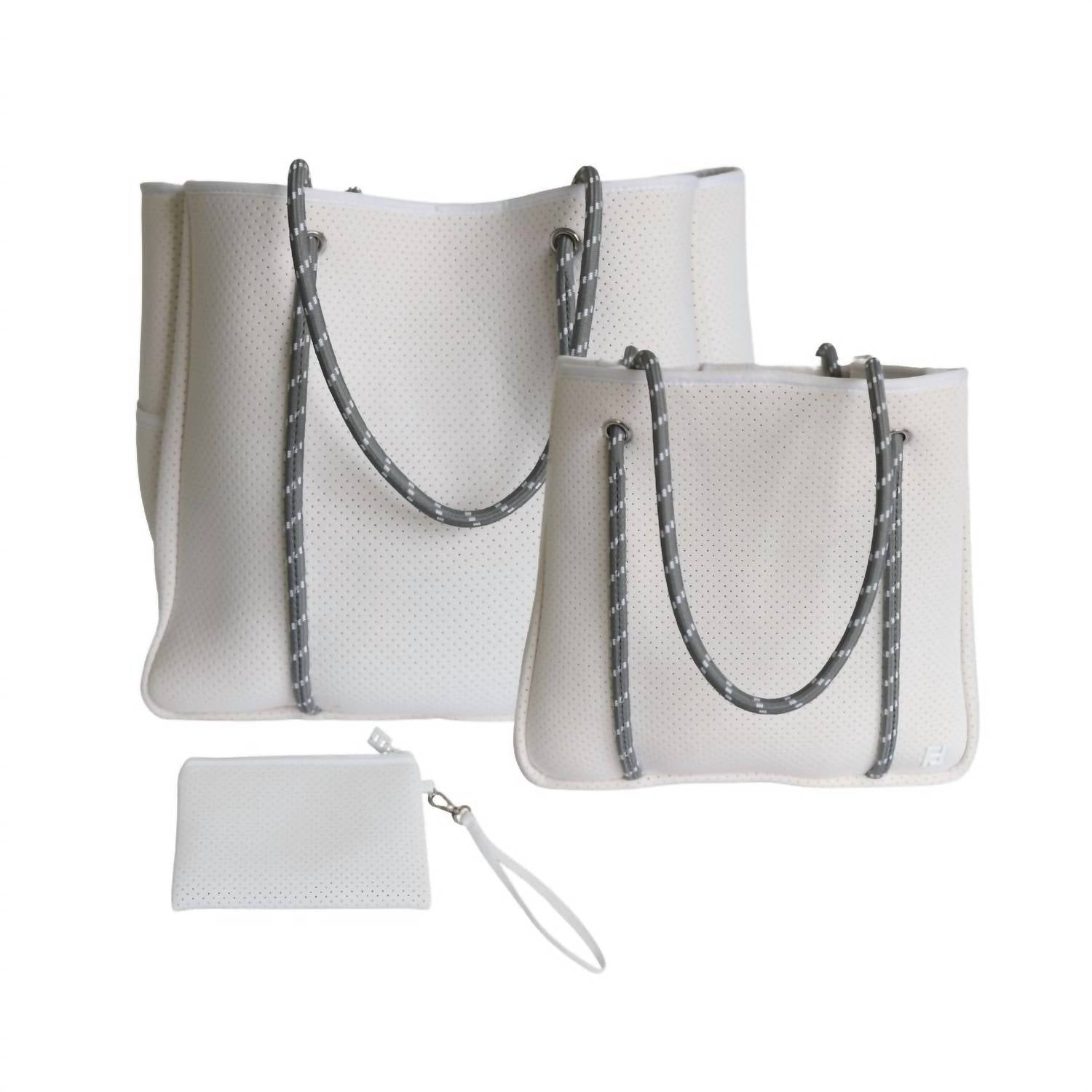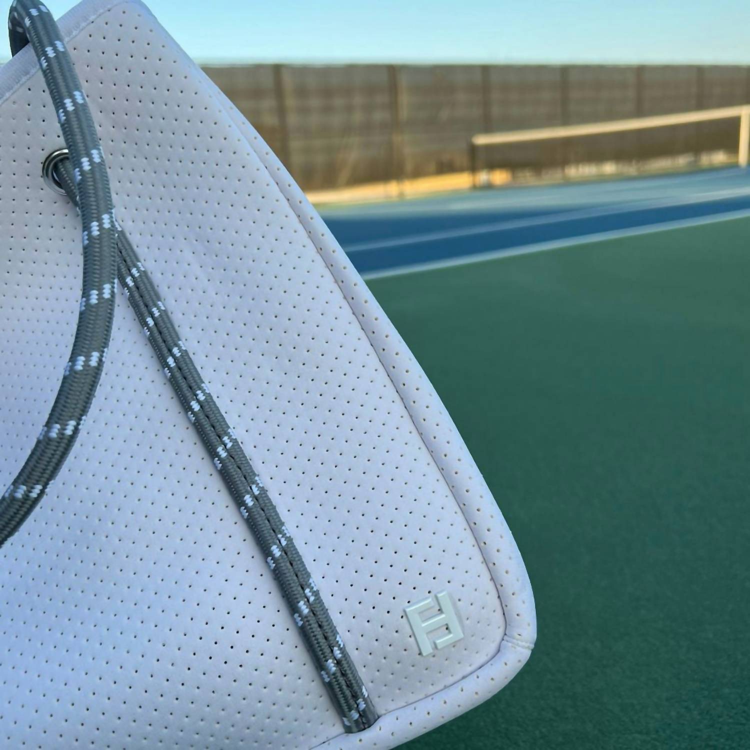 A bolsa tote multifuncional da estação. Entre no clima de férias com esta bolsa tote de tamanho perfeito, o acessório perfeito para dias de praia, festas na piscina ou jantares ao pôr do sol. Melhore sua experiência com pickleball com a Bolsa Tote Feminina Courtside Small Pickleball Paddle da Five Love, uma combinação perfeita de estilo e praticidade. Feita de neoprene durável, esta bolsa branca tem dimensões impressionantes de 33 cm de comprimento x 30 cm de altura x 18 cm de largura. Ela possui sete compartimentos internos, proporcionando amplo espaço para duas raquetes, e inclui bolsos externos para fácil acesso a itens essenciais, como uma garrafa de água e um celular. O material resistente à água, o design minimalista e os detalhes em ferragens prateadas a tornam a escolha ideal para aventuras dentro e fora das quadras.