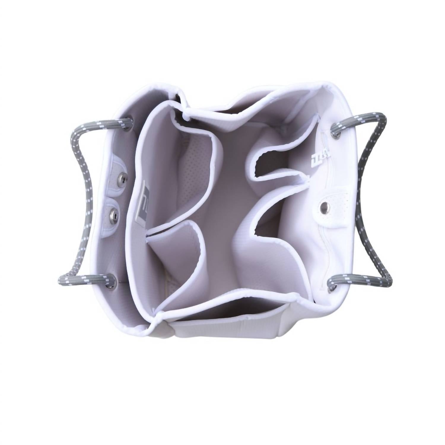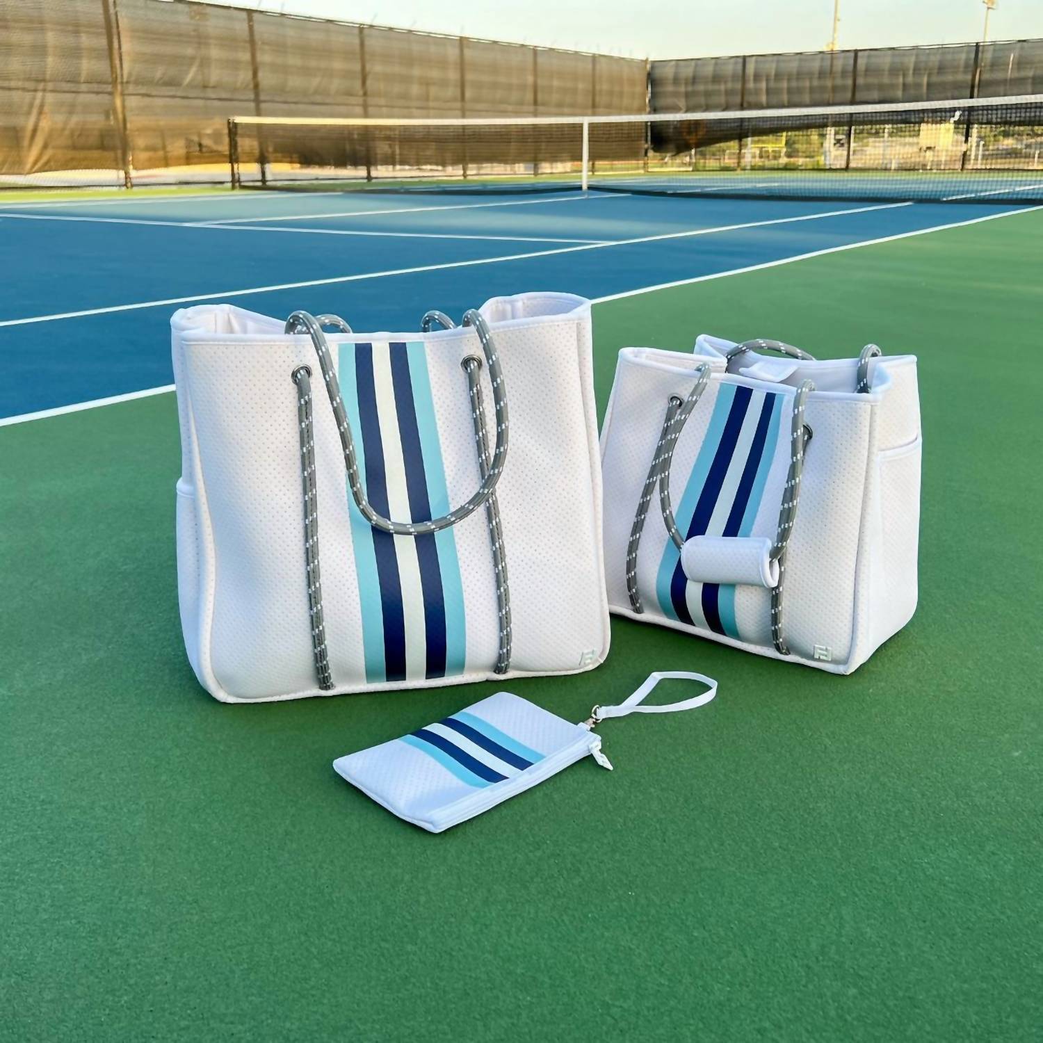 A bolsa perfeita para levar na mala e levar para o seu próximo fim de semana ou férias na praia! Seu design clássico nunca sai de moda e você vai querer usá-la estação após estação. Apresentamos a Bolsa Tote Feminina Courtside Small para Raquete de Pickleball da Five Love, um acessório chique na cor branca com listras azuis. Confeccionada em neoprene, esta bolsa possui fundo removível para maior durabilidade e proteção. Seu interior espaçoso acomoda até duas raquetes de pickleball e inclui bolsos adicionais para itens essenciais. Para facilitar a manutenção, ela pode ser lavada na máquina em um ciclo suave e frio. Dimensões: 33 cm C x 30 cm A x 18 cm L.