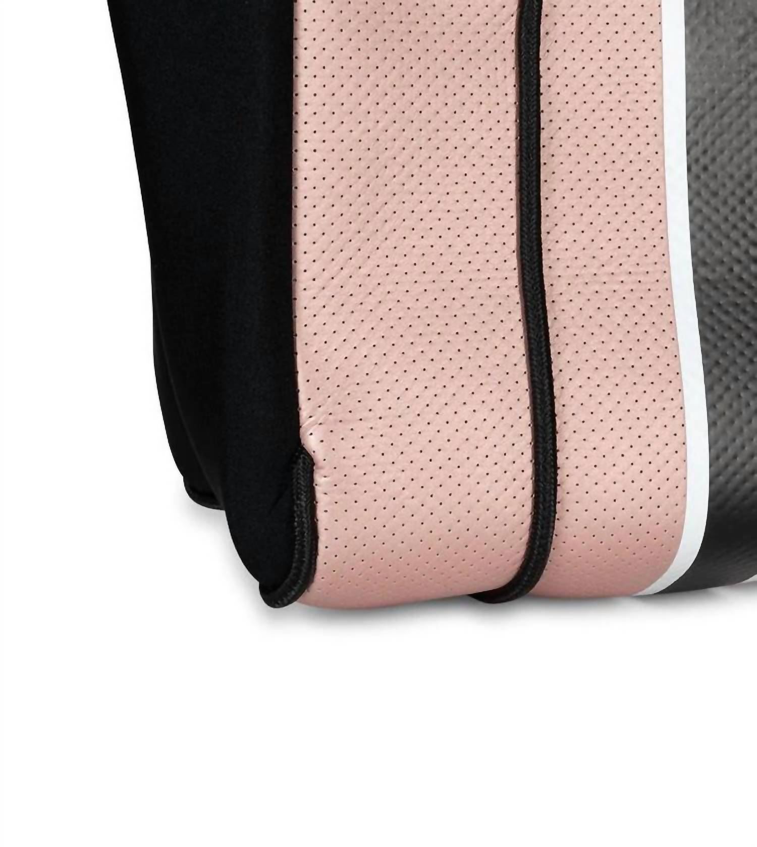 The carry-all tote bag of the season. Get in vacation mode with this perfectly sized tote bag that is the perfect accessory for beach days, pool parties, or sunset dinners. This neoprene tote is the perfect blend of style and functionality. Ultra light weight. Side panels expand for a phantom shape or snap in for a streamline look. Removable hard bottom liner and wristlet pouch.