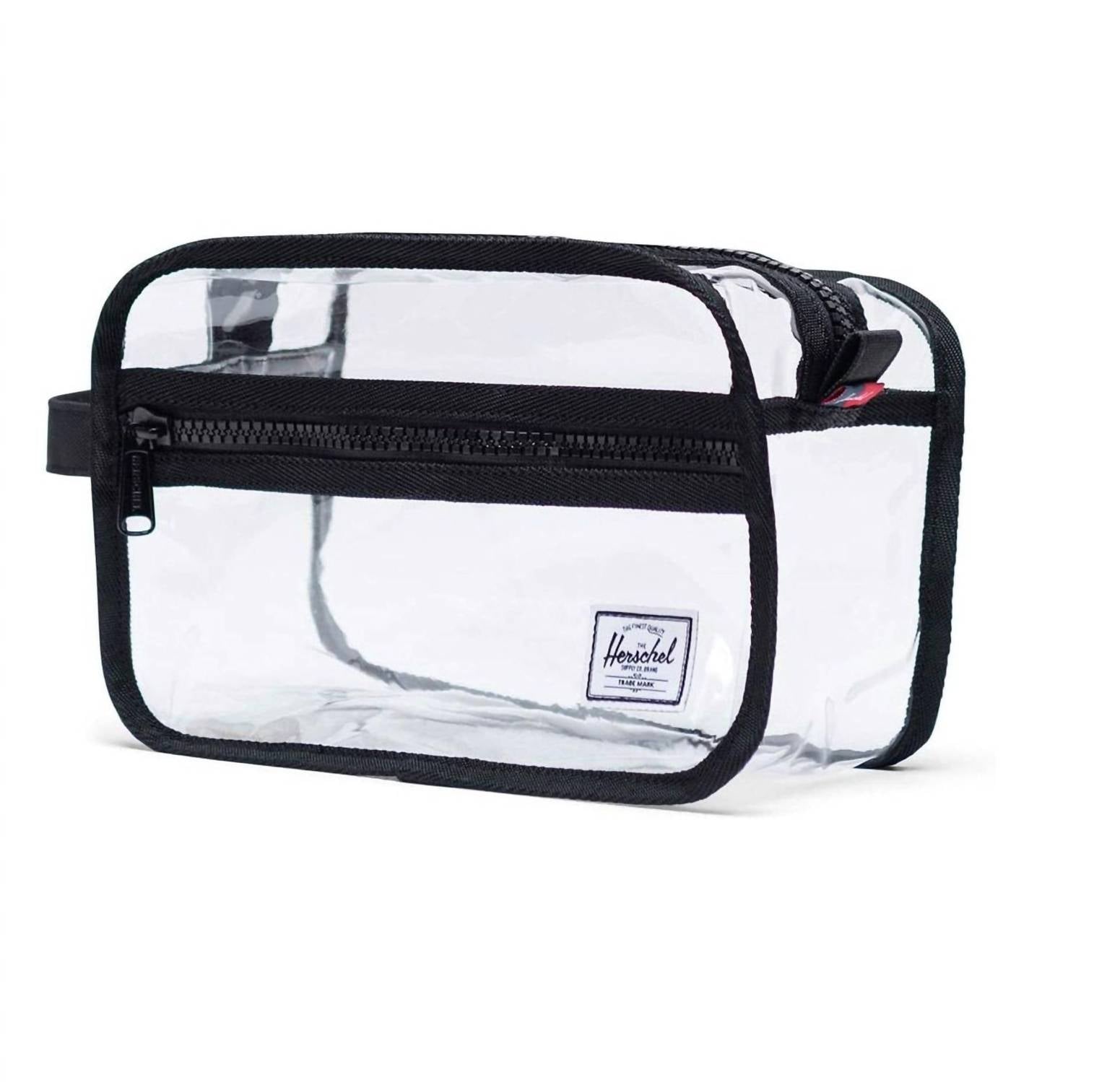 The perfect makeup bag for all your essentials. Discover the Clear Chapter Bag by Herschel, a stylish and functional accessory perfect for organizing your essentials. Featuring a transparent design for easy visibility, it measures 6 inches in height, 9.5 inches in width, and 4.5 inches in depth. Elevate your travel or everyday organization with this chic cosmetic bag in a sleek black and clear color scheme.