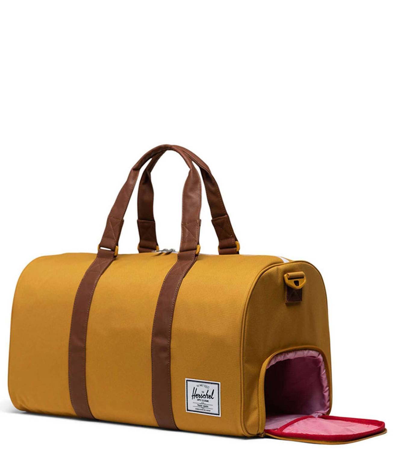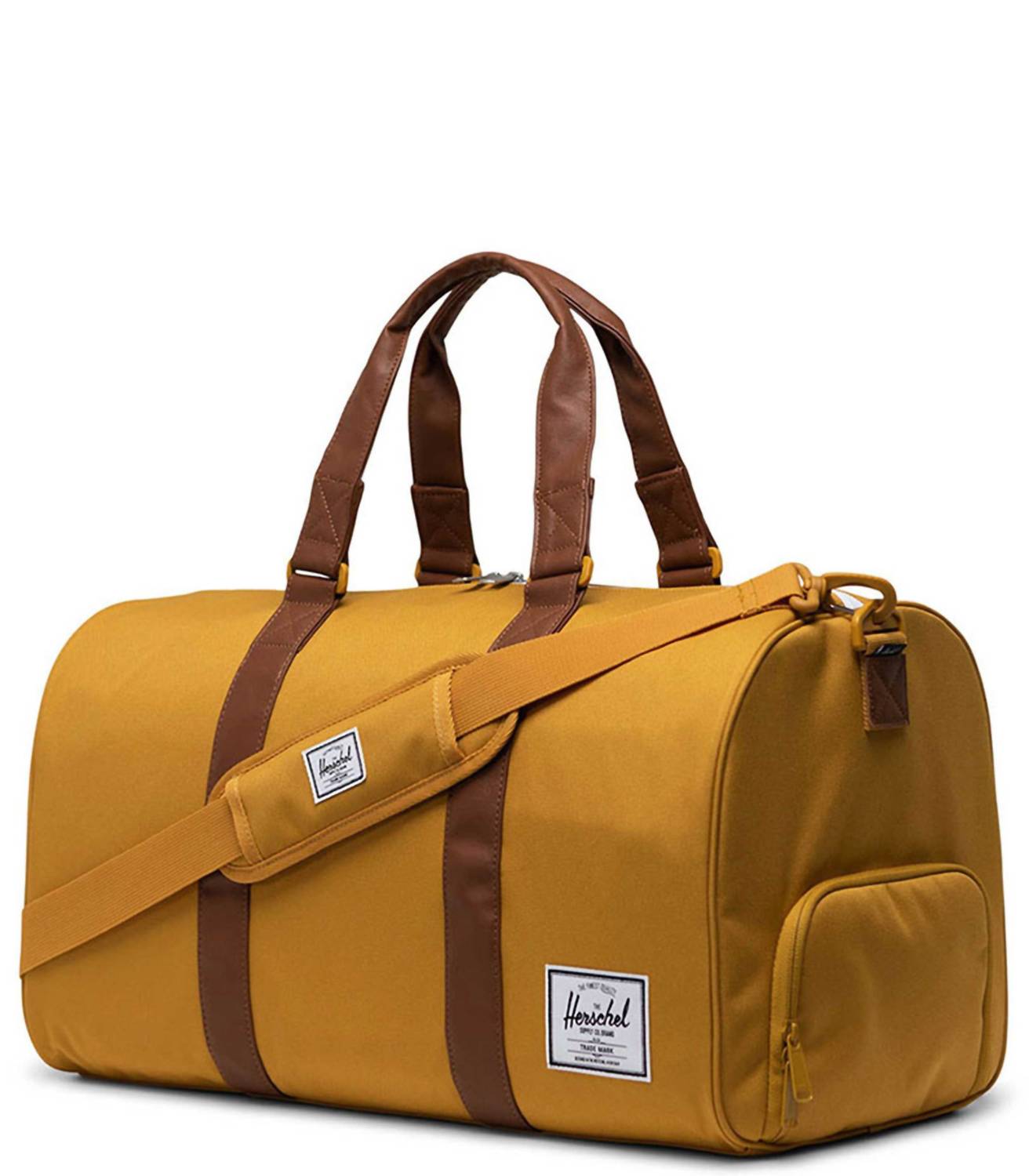 Introducing the Novel Duffel Bag by Herschel in the Arrowwood/Chicory Coffee colorway, expertly crafted from 100% recycled 600D polyester. This bag features a waterproof zippered closure, ensuring your essentials stay protected, along with thoughtful details like a signature shoe compartment and a side sleeve pocket. Its low profile vegan leather handles and removable webbing shoulder strap with EVA padding offer comfortable carrying options. Enjoy additional functionality with the zippered internal mesh pocket and Put Yourself Out There™ internal label.