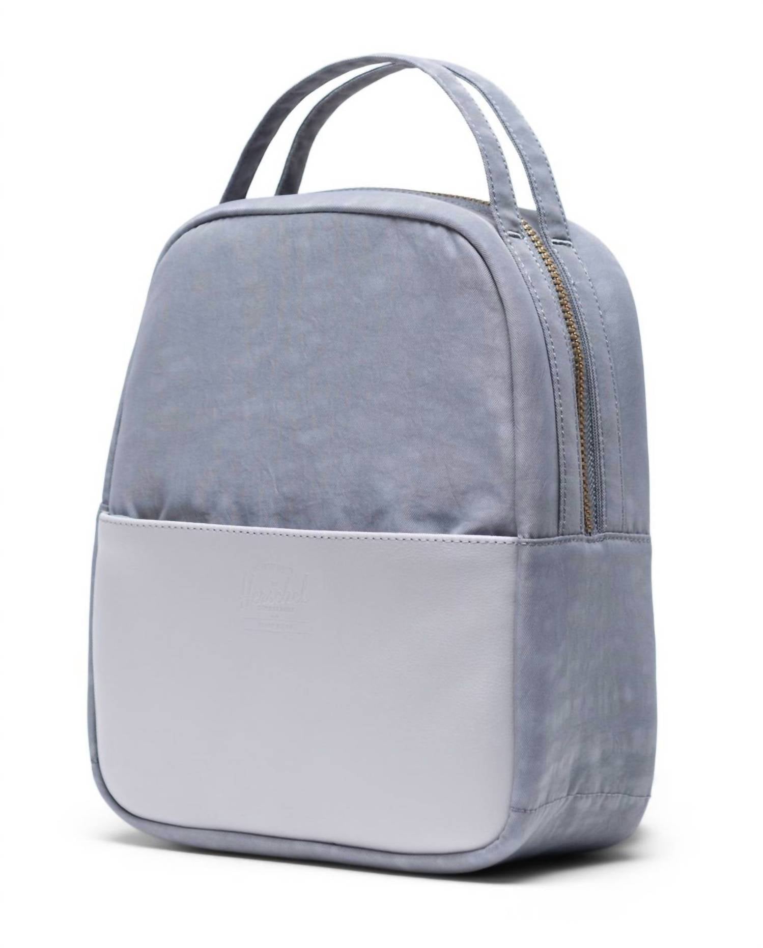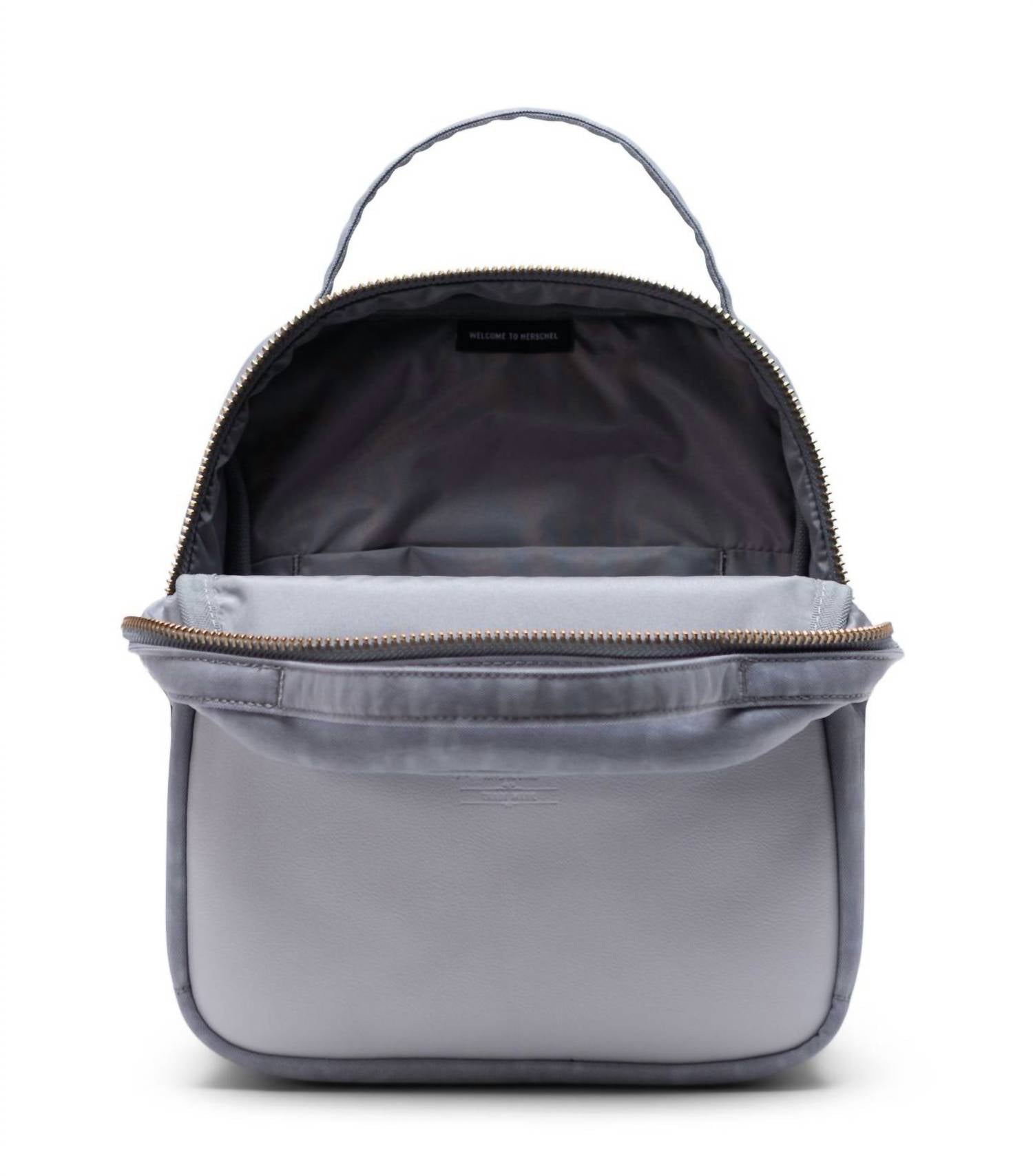 Introducing the Orion Mini Backpack by Herschel, a stylish and functional accessory perfect for daily use. With its dimensions of approximately 22 cm in width, 26 cm in height, and 9 cm in depth, it offers a volume of about 5 liters and weighs approximately 350 grams. This backpack, crafted from 100% polyester, features a Sharkskin gray color and is designed with two 19 cm carrying handles and adjustable shoulder straps ranging from 70 cm to 90 cm. It includes a spacious main compartment with a slip pocket, a front hidden zip pocket, a padded back, and a reinforced base, all secured with a two-way zipper closure.