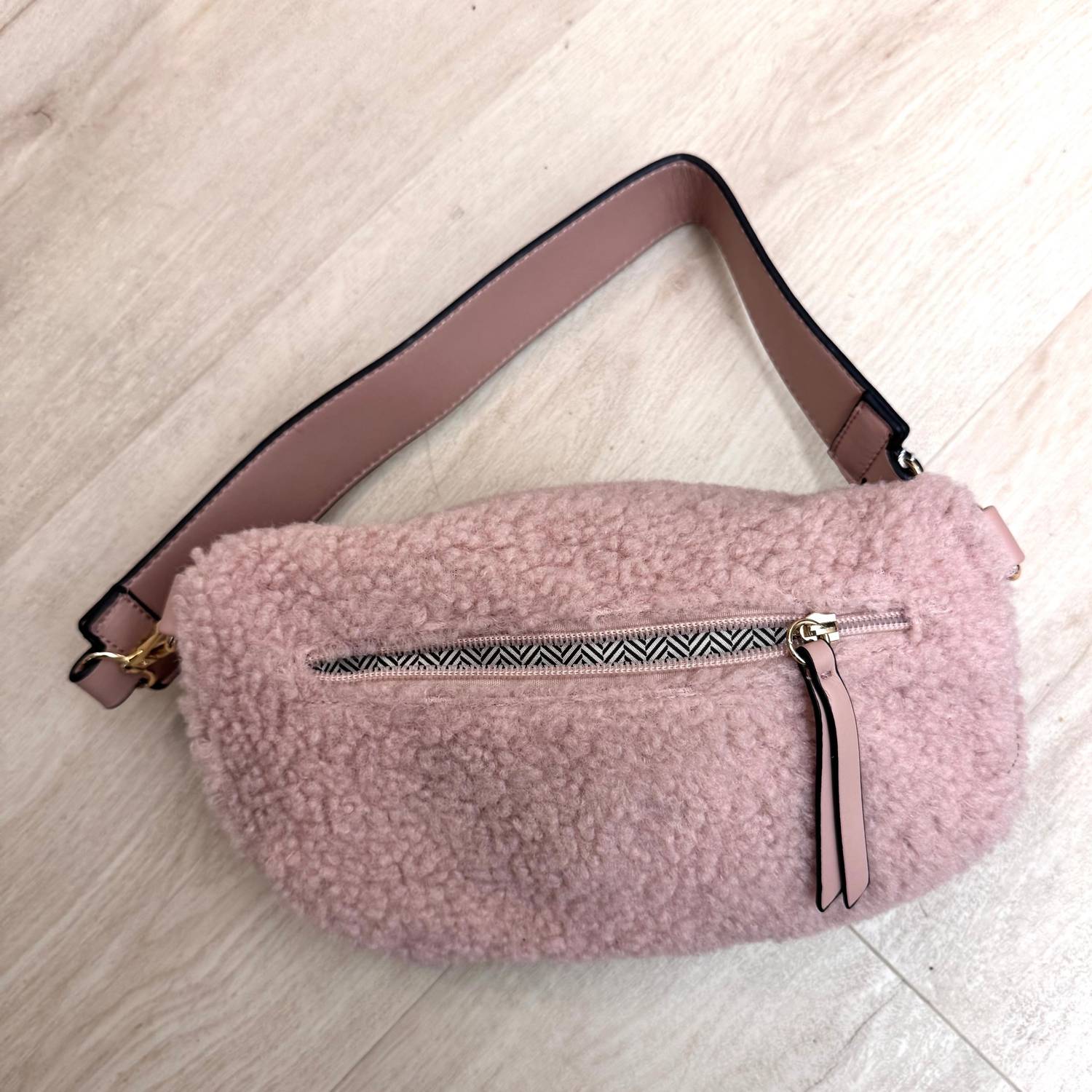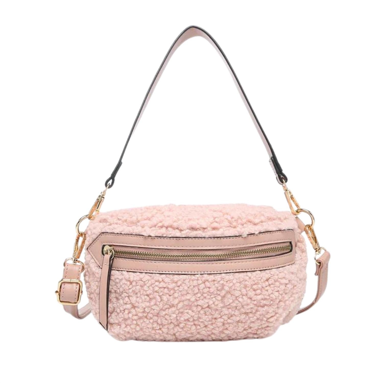 Uma versão casual e fofa da bolsa tiracolo favorita de todos. Conheça a Bolsa Conversível Brookie Sherpa da Jen & Co., uma bolsa transversal rosa chique confeccionada em poliéster aconchegante. Ela possui uma alça de ombro vegana removível medindo 48 cm x 3,8 cm e inclui uma alça ajustável que varia de 74 cm a 120 cm de comprimento e 1,9 cm de largura. Um elegante fecho de zíper dourado na frente é complementado por um bolso traseiro com zíper dourado, perfeito para guardar itens essenciais. Com dimensões de 28 cm de comprimento x 15 cm de largura, esta bolsa também oferece organização prática com um bolso interno traseiro com zíper e dois bolsos frontais para cartões.