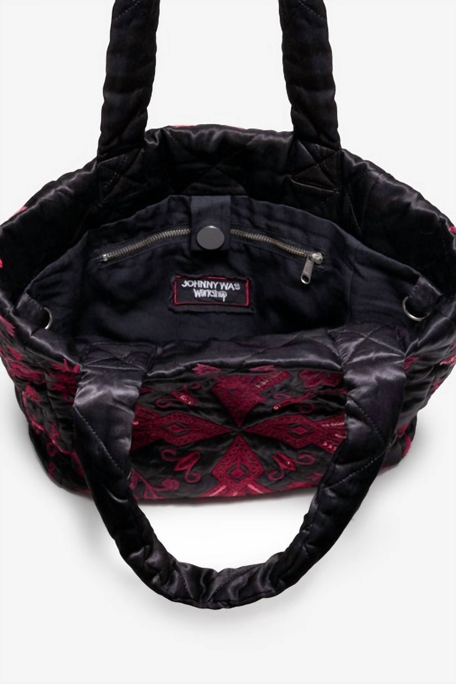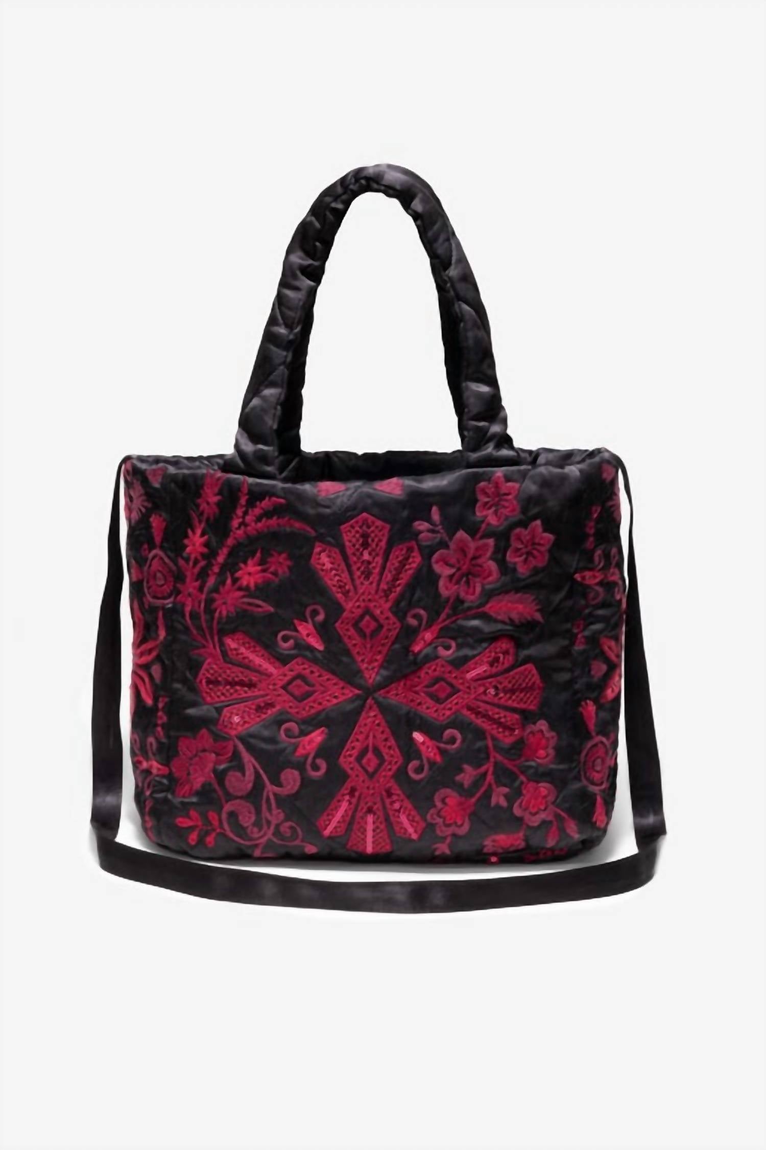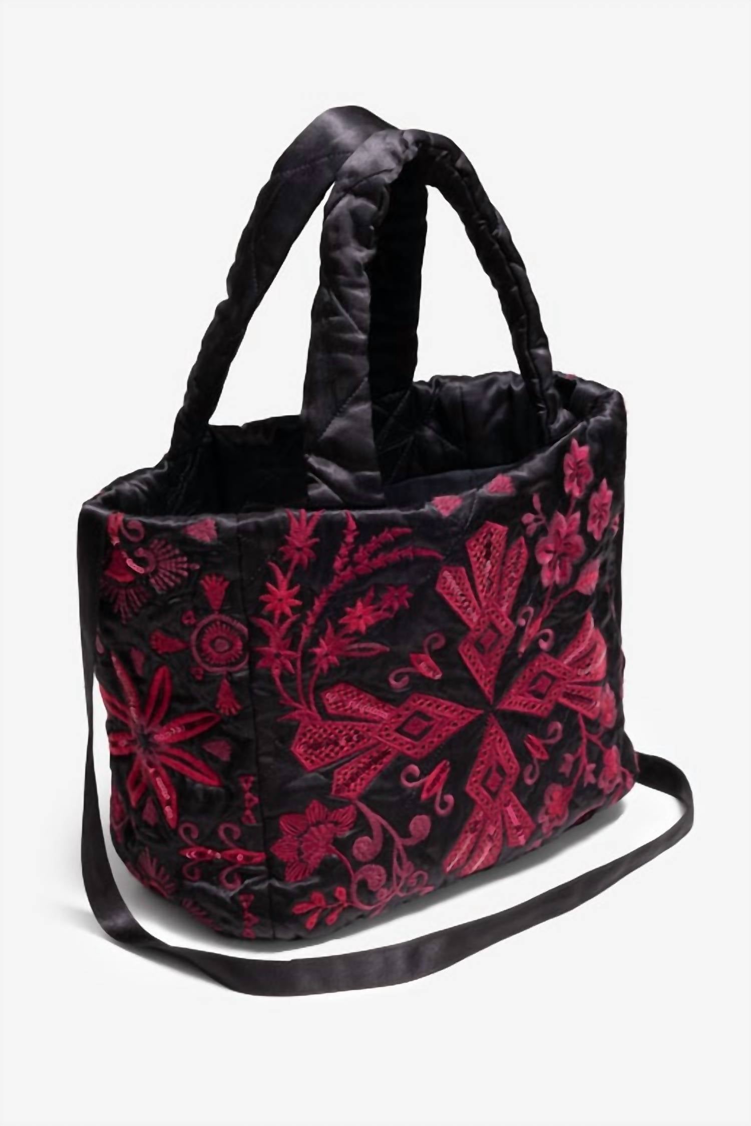 A Bolsa Tote Annalina Quilted é igualmente única e eclética. Ousadamente adornada com bordados complexos em tons de vermelho e rosa, esta bolsa leve acolchoada possui duas alças superiores. Possui um bolso interno e fecho de botão de pressão. Combine um visual neutro com um toque de cor vibrante.