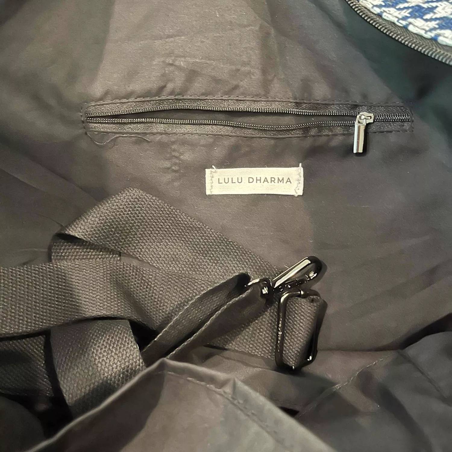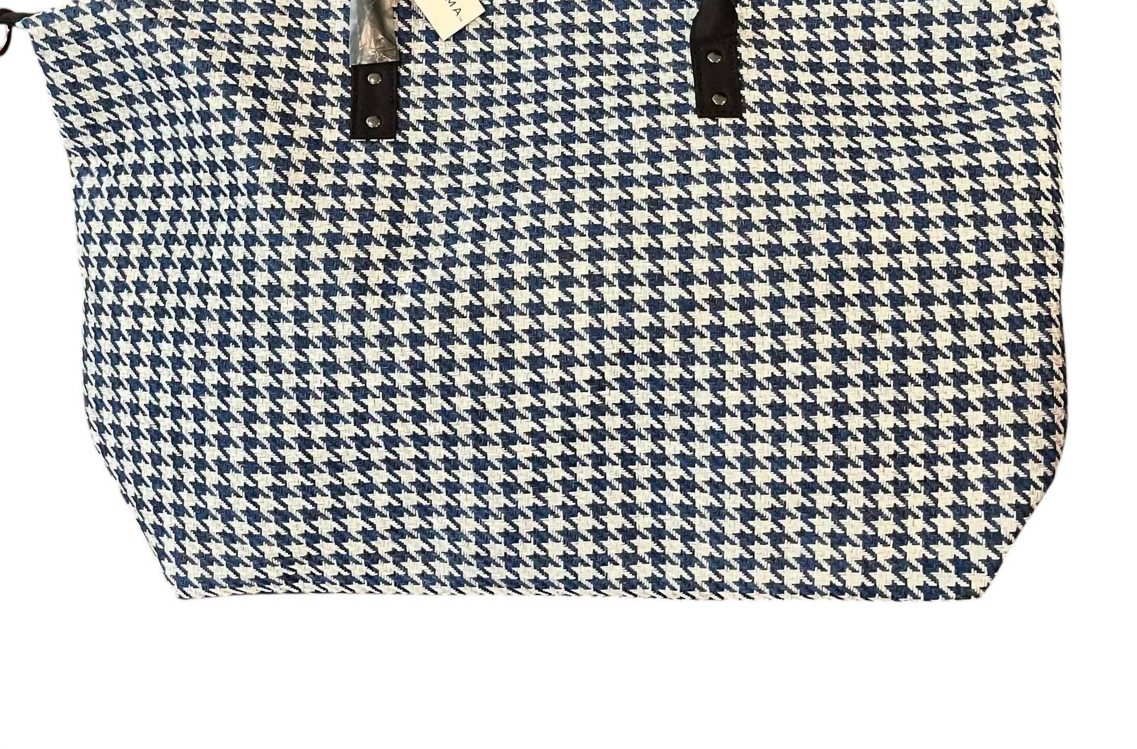 The carry-all tote bag of the season. Get in vacation mode with this perfectly sized tote bag that is the perfect accessory for beach days, pool parties, or sunset dinners. The Travel Size Weekender Bag by Lulu Dharma combines style and functionality for your travel needs. With its blue houndstooth pattern, this tote is crafted from a durable polyester and cotton blend, ensuring both quality and elegance. Perfect for weekend adventures or quick getaways. Enhance your travel experience with this chic and practical accessory.