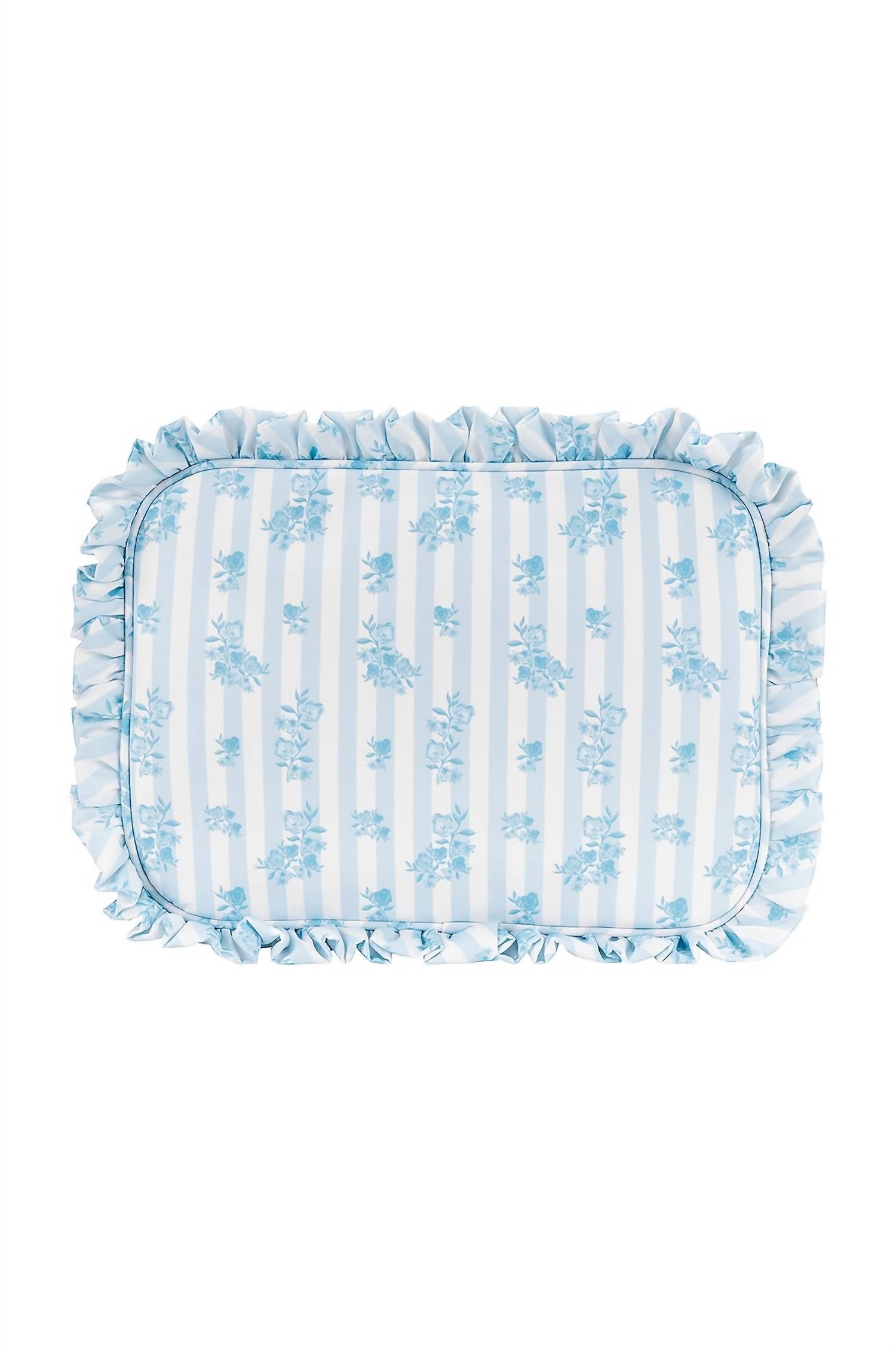 The perfect makeup bag for all your essentials. Introducing the High Tea Ruffle Pouch by Stoney Clover Lane, an exquisite accessory in the charming Fine China print. Crafted from nylon, this bag showcases delicate florals, ruffles, and bows with gold-tone hardware for a chic touch. It features a top zipper closure with a stylish logo charm pull, providing easy access to your essentials. With dimensions of 11 inches in width, 5 inches in depth, and 8 inches in height, it's perfect as a clutch, travel pouch, or purse organizer.