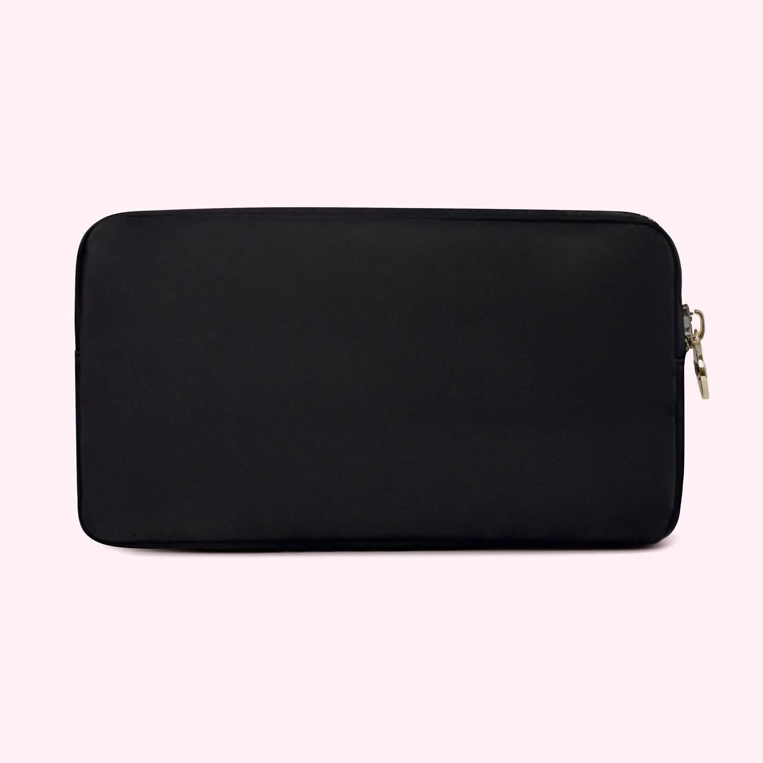 Feita em nylon resistente, esta bolsa preta possui um fecho de zíper superior seguro e detalhes em dourado marcantes. Projetada com atenção meticulosa aos detalhes, oferece um interior forrado para proteção extra. Com dimensões de 24 cm de largura, 13 cm de altura e 5 cm de profundidade, é ideal para transportar maquiagem, lanches, carregadores ou material escolar.