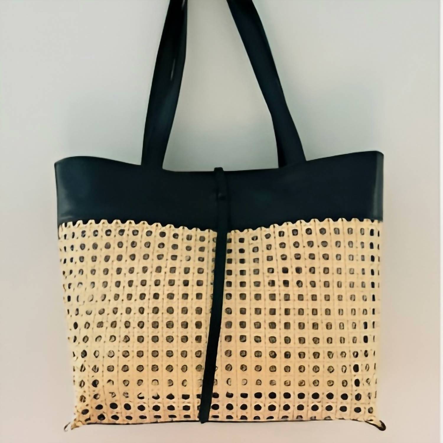 The carry-all tote bag of the season. Get in vacation mode with this perfectly sized tote bag that is the perfect accessory for beach days, pool parties, or sunset dinners. Introducing the Cane Weave Tote Medium Leather Trim Bag by The Winding Road, crafted with sustainably harvested rattan and stylish black leather trim. Handwoven in Indonesia, this tote measures 13 x 10.5 x 5 inches, offering ample space for your essentials. Its unique design and natural materials make it both eco-friendly and visually appealing, perfect for any outfit.