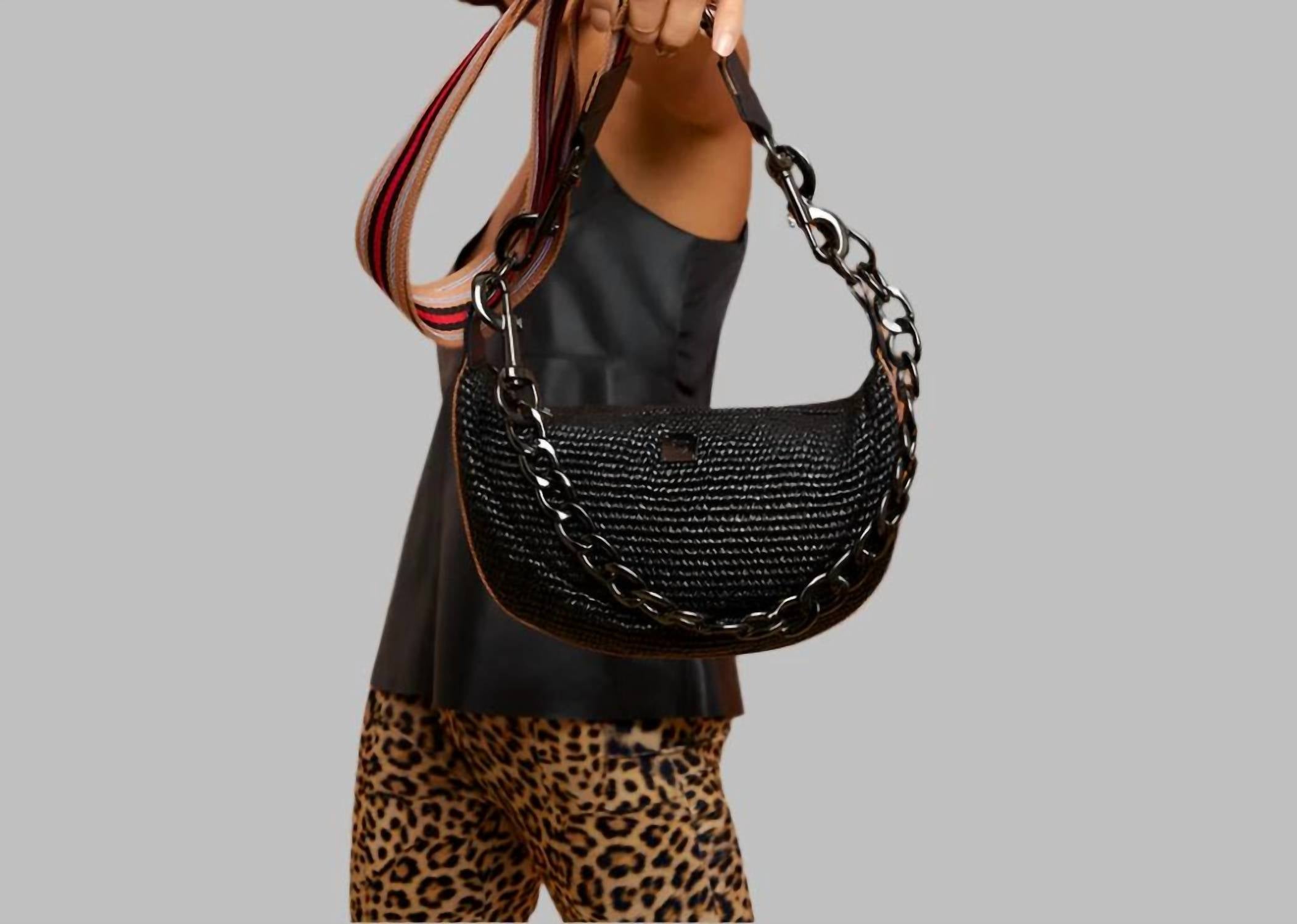 A bolsa transversal é uma tendência que veio para ficar e nós amamos especialmente esse estilo. Eleve seus acessórios com a Bolsa Transversal Raffia Tiny Dancer da THINK ROYLN. Confeccionada com material 100% poliéster e estrutura elegante em ráfia, esta bolsa versátil está disponível em um tom preto atemporal e mede 25 cm de largura, 5 cm de profundidade e 16,5 cm de altura. O design apresenta uma placa com o logotipo, detalhes em tecido listrado e vem com duas alças removíveis: uma alça de corrente de metal com 23 cm de comprimento e uma alça transversal ajustável que se estende de 70 cm a 106 cm. Perfeita para o dia a dia e a noite, esta bolsa permite alternar facilmente entre uma configuração transversal alta ou baixa e uma alça de ombro.
