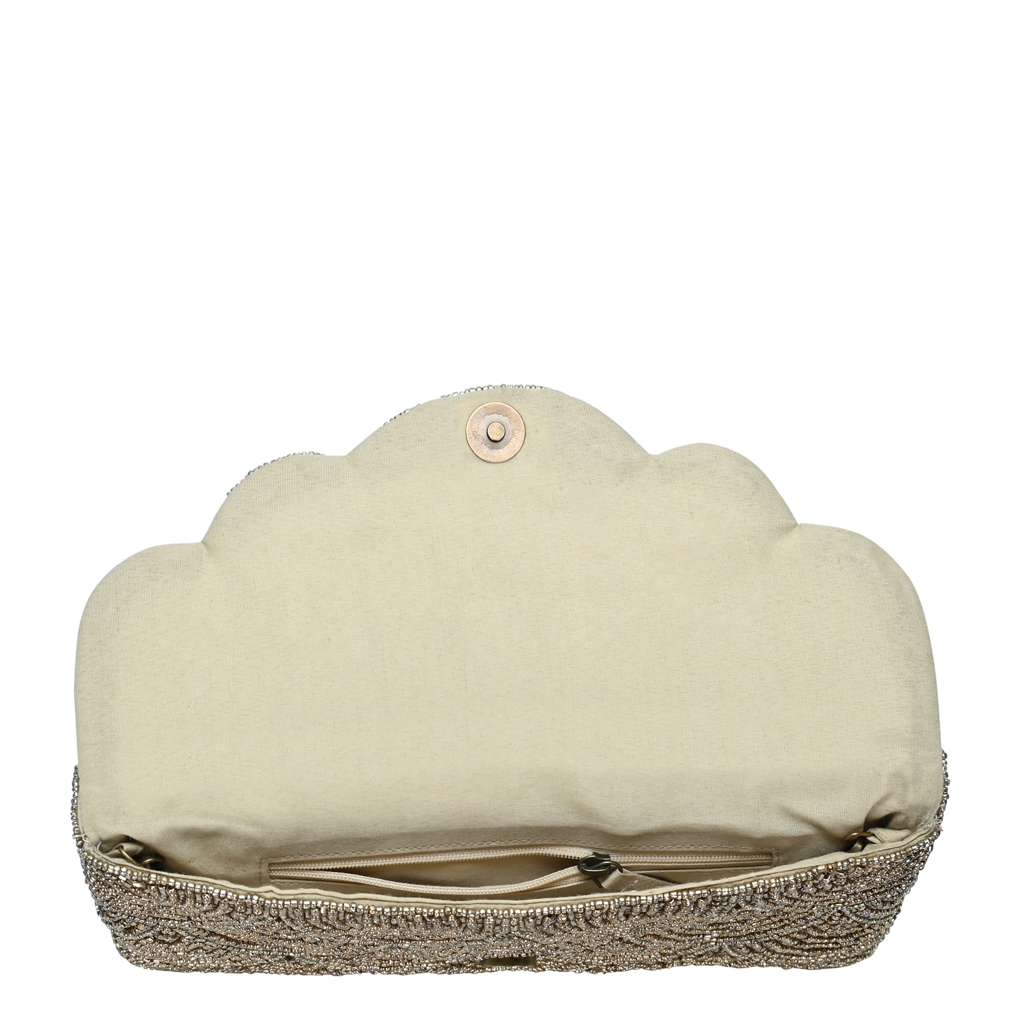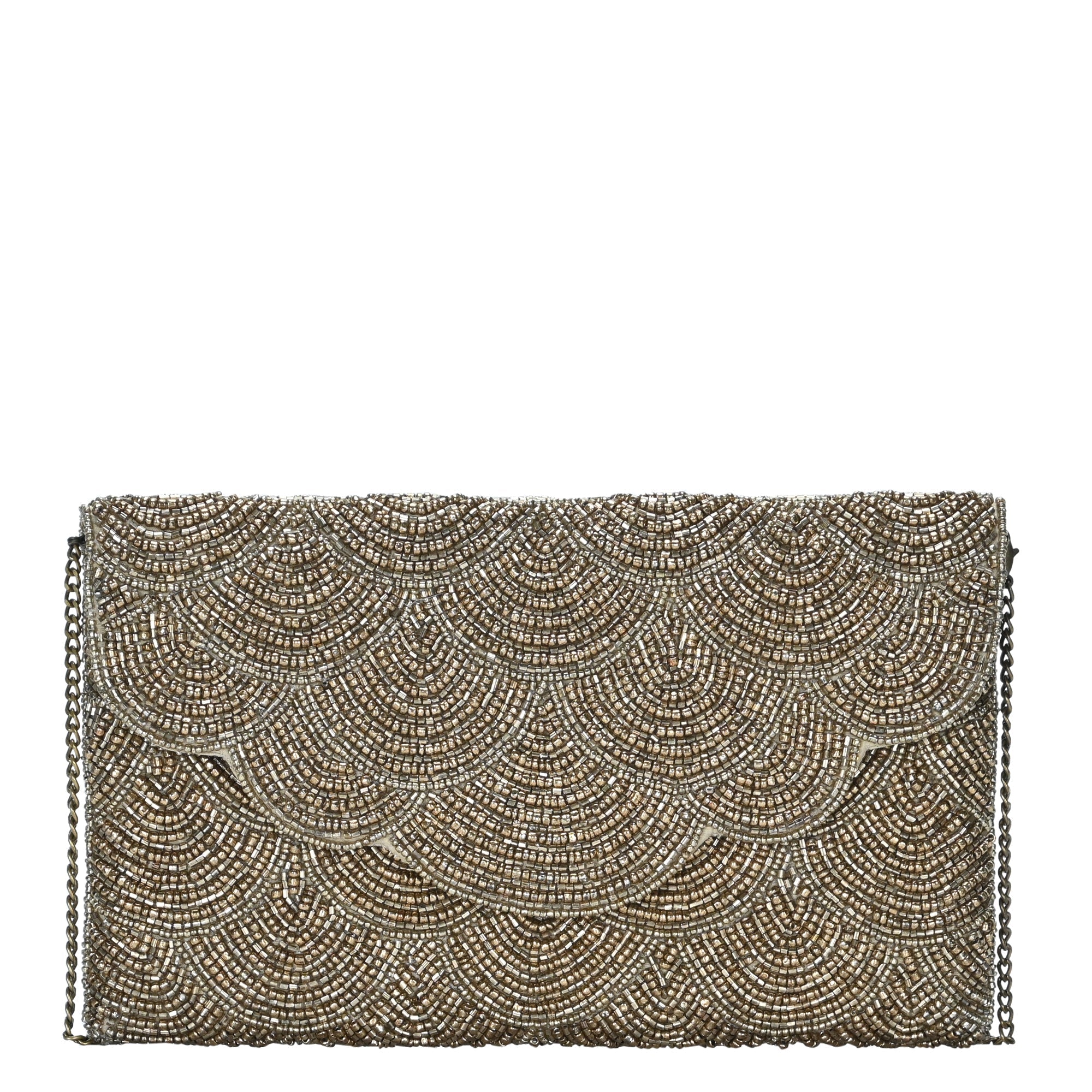 Lustrous glass seed beads embellish this captivating creation. A soft, scalloped flap adds a romantic finish. Accessorize your look for any special occasion!