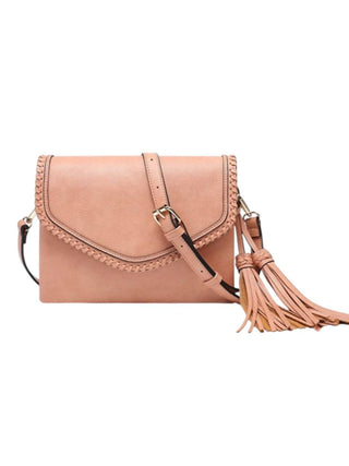 Jen & Co. - Bolsa transversal feminina com aba coral, ponto de chicote e borla