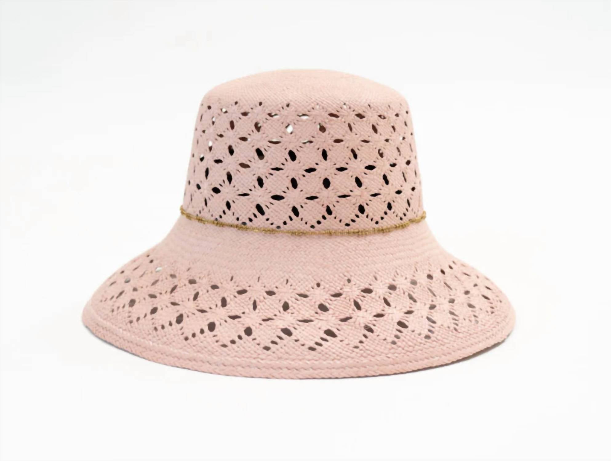 Enhance your collection with the Freya Women's Carnation Hat, a blush bucket hat capturing timeless elegance in a daisy pattern. Carefully hand-woven from Paja Toquilla straw, this masterpiece features a delicate gold-toned brass chain. Crafted to exhibit natural beauty, it is available in sizes Small/Medium (55 cm - 57 cm) or Large (58 cm - 59 cm). Originating from a bespoke craftsmanship process, this hat makes a luxurious addition to any wardrobe.