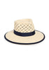 Introducing the Women's Marigold Hat by Freya, a sophisticated accessory in natural and navy. This hat features an intricately woven crown with a diamond-shaped vented pattern, complemented by a solid weave brim. A navy grosgrain ribbon trim adds a touch of elegance around the base and edge. Available in sizes Small/Medium (55-57cm) and Medium/Large (58-59cm).