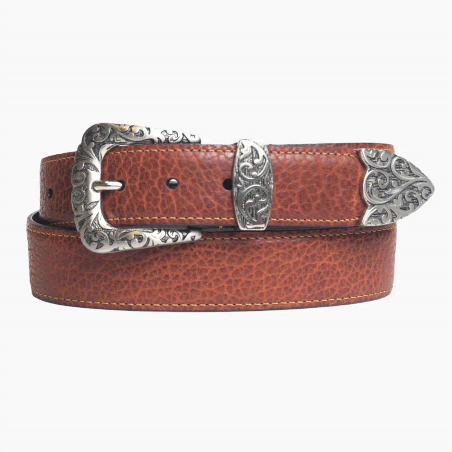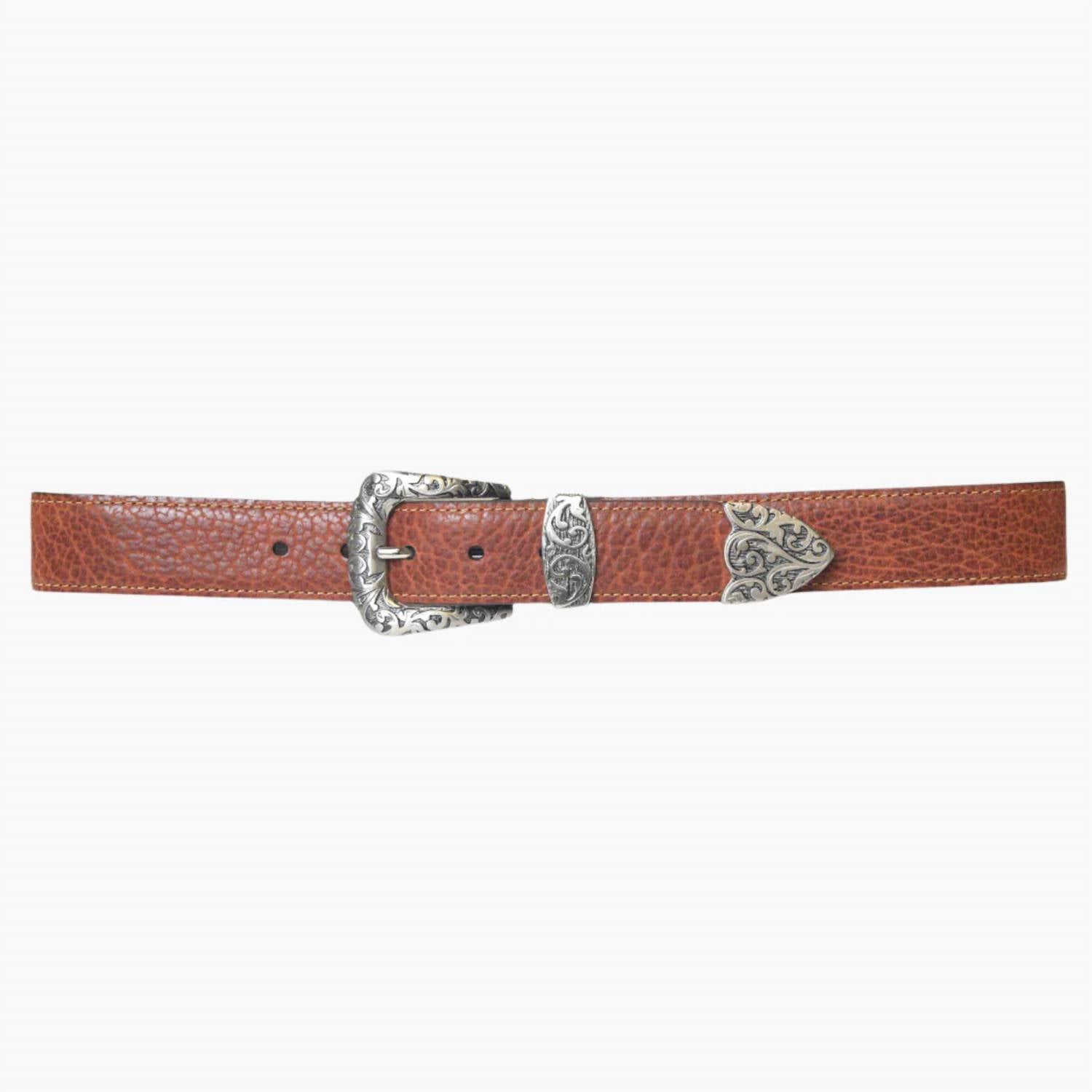 Apresentamos o Cinto Feminino Vintage Bison Leather Primrose USA da Lejon Leather Goods em um tom quente de amendoim. Este cinto é feito de couro legítimo de bisão americano com uma textura única e desgastada, além de ser forrado com couro de flor integral para maior durabilidade. Mede 40 mm de largura (1,57 polegadas) e vem com uma fivela com acabamento em níquel polido, complementada por uma borda plana pintada à mão e costuras com detalhes em tom. Fabricado nos EUA, este cinto possui cinco furos, cada um com espaçamento de 2,5 cm para um ajuste perfeito.