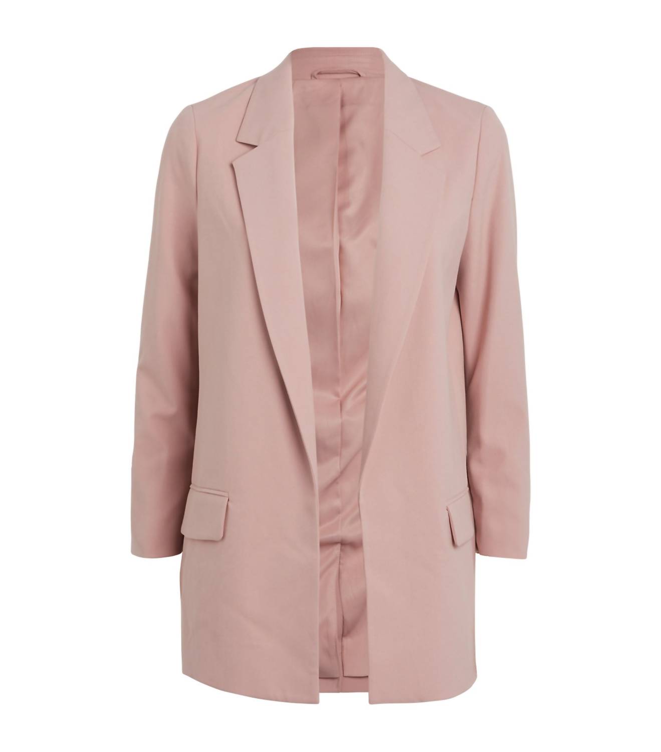 Meet the Aleida Long Sleeve Dusty Tri Blazer by AllSaints, a timeless piece that blends menswear inspiration with feminine flair. Sleeve Length: Long Sleeve. Composition: 63% recycled polyester, 33% viscose, 4% elastane. Material: Polyester. Garment Length: 29". Closure Type: None. Care Instructions: Hand wash and dry flat. With its open front and notched lapels, this blazer, crafted in a dusty pink hue, is the perfect layering staple. Indulge in sophistication with its lined interior and classic collar, ideal for everyday elegance.