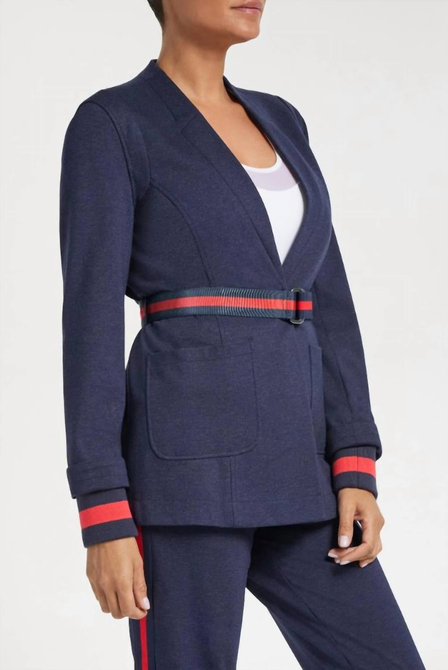 Product Description Elevate your everyday ensemble with the Reyna jacket. This sophisticated piece adds timeless modern style to your wardrobe with its unique navy textured fabric, contrasting inner cuffs and detachable belt. This jacket brings European design with classic lines to any outfit with unbeatable Anatomie comfort, fit, packability and wrinkle resistance. Relaxed fit Stitched faux blazer lapel Long sleeves with contrasting inner cuffs Detachable navy/red striped contrasting belt One-button closure Two front patch pockets Length hits at the low hip Textured ponte fabric Style: AB3721PO Color: Texture Navy Fabric and Care 51% Rayon/33% Polyester/11% Nylon/5% Elastane Lining 100% Polyester Remove belt before washing Machine wash cold delicate cycle Do not bleach Do not tumble dry Iron at low temperature if needed Or dry clean