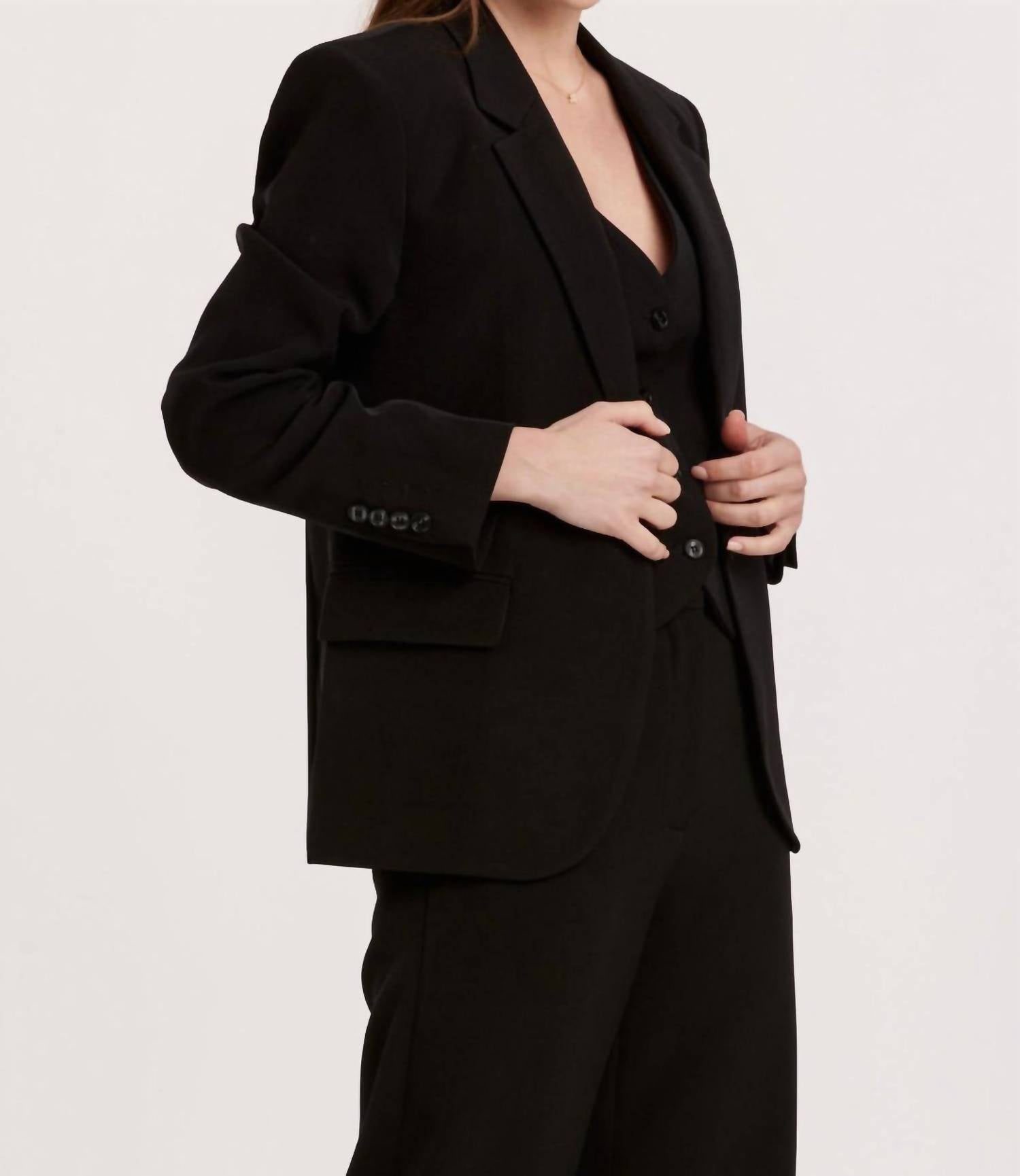The Another Love Baylor Blazer in Black is a modern essential that blends tailored sophistication with everyday versatility. Featuring a notch collar, stand collar detail, front darts, and a center back slit, this blazer is designed to flatter with a clean, structured silhouette. Long sleeves and flap pockets add classic polish, while the solid woven fabric offers a smooth, standard fit. Crafted from a comfortable blend of 95% polyester and 5% spandex, and fully lined with 100% polyester, it ensures both durability and ease of movement. Whether you're dressing up for work or layering it over a casual look, the Baylor Blazer delivers effortless style with a refined edge.