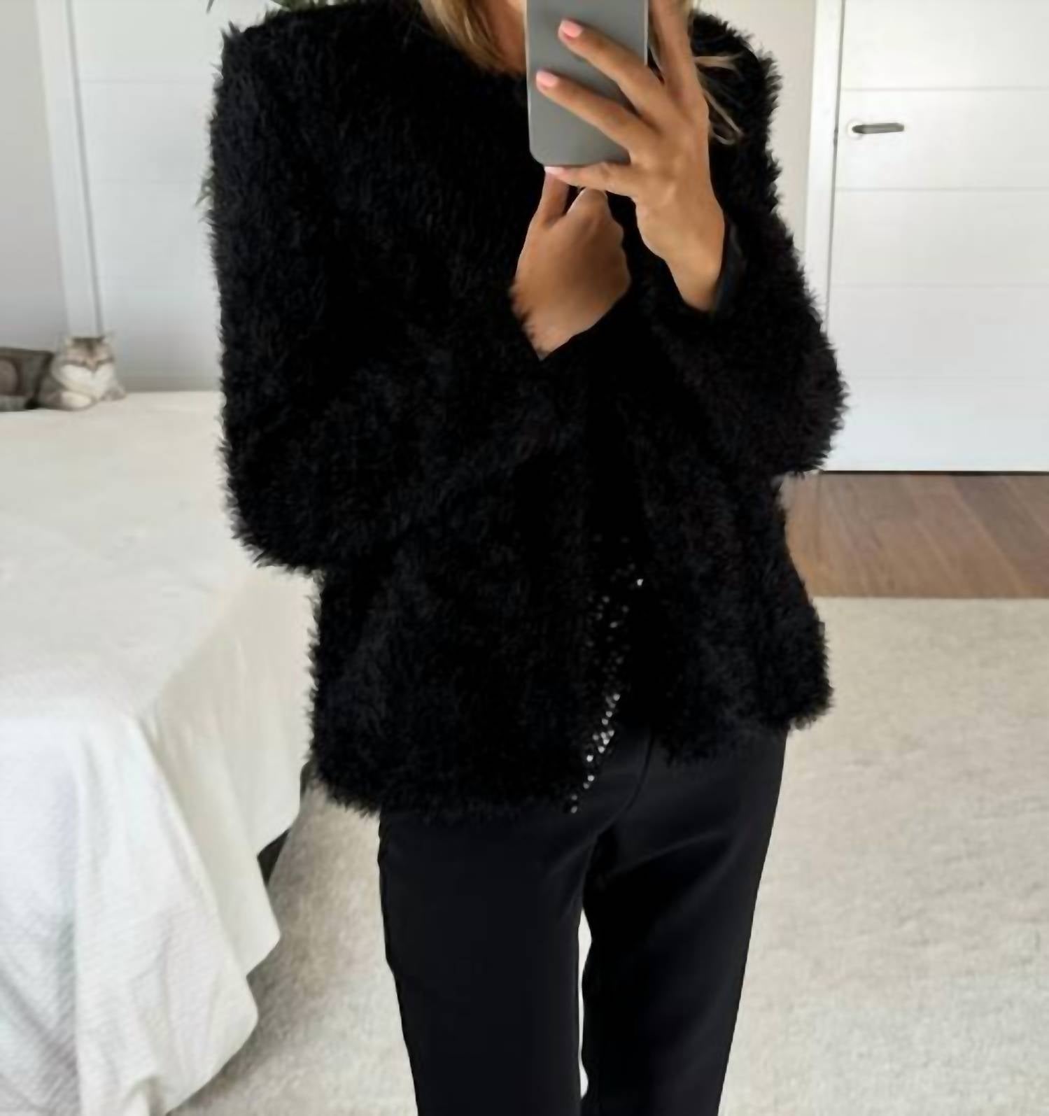 A blazer so versatile you can wear it to the office or pair it with jeans for a more casual look. Tana black fur jacket. Cut at the hip. Lined jacket. Hair effect. Without clasp.