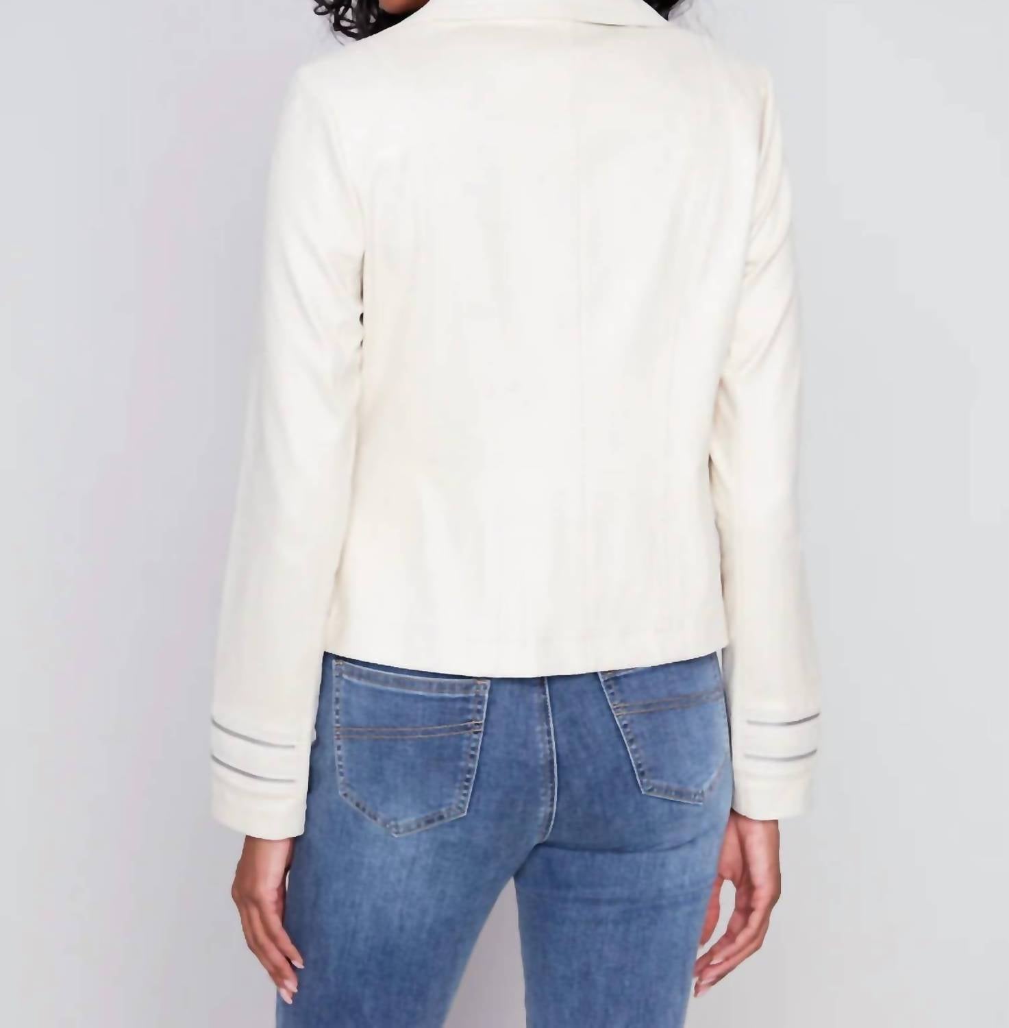 A blazer so versatile you can wear it to the office or pair it with jeans for a more casual look. Step out in style with the Vintage Faux Leather Jacket by CHARLIE B, a chic addition to any wardrobe. Designed in off-white, this solid-patterned piece features long sleeves and a classic collar neckline. Crafted from a blend of 92% polyester and 8% spandex, it offers comfort and a flattering fit with a back length of 22 1/4". Closure: Zip closure. Care: Hand wash, line dry.