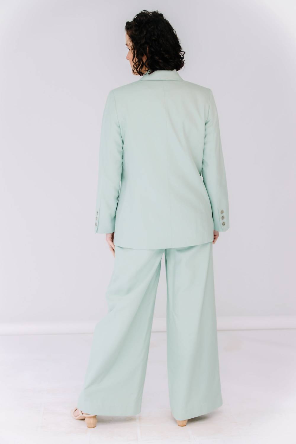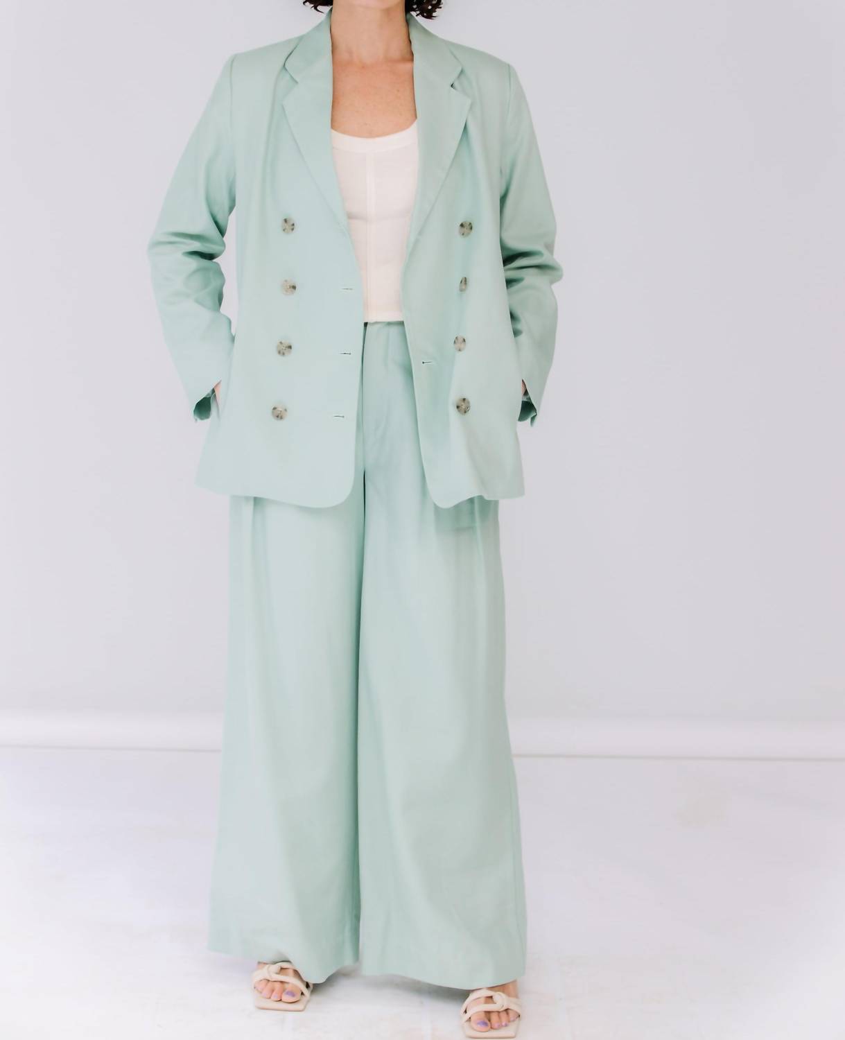 Tailored to perfection, this blazer will be your go-to jacket for years to come. Elevate your spring styling with the Freya Blazer by CHRISTY LYNN, a sophisticated piece in a light teal shade perfect for any dinner party or Thanksgiving gathering. Designed with long sleeves and a classic collar, this blazer is crafted from a luxurious linen blend, ensuring both comfort and elegance. Ethically made in Brooklyn, NYC, it features a practical button closure and pockets, adding functionality to its stylish silhouette. For optimal maintenance, we recommend dry cleaning. Val is 5'6" wearing a size 8, while Lacey is 5'5" wearing a size 4.