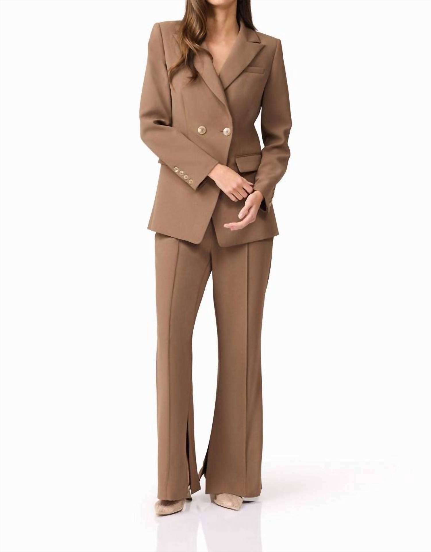 Introducing the Sandy Suit Blazer by Curaae, exuding both sophistication and modernity. This brown blazer features long sleeves and a V-neckline with a classic collar and lapel, adding a timeless elegance to any outfit. Made from high-quality woven fabric, its double-breasted design with button closure provides a tailored fit, while the front chest welt pocket and front flap pockets enhance its functionality. Care: Dry clean only, ensuring a polished and durable finish.
