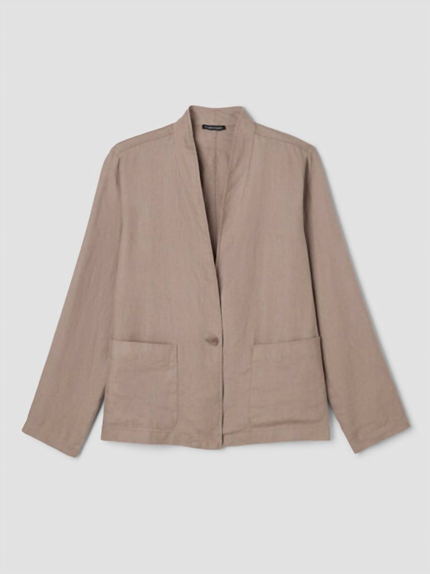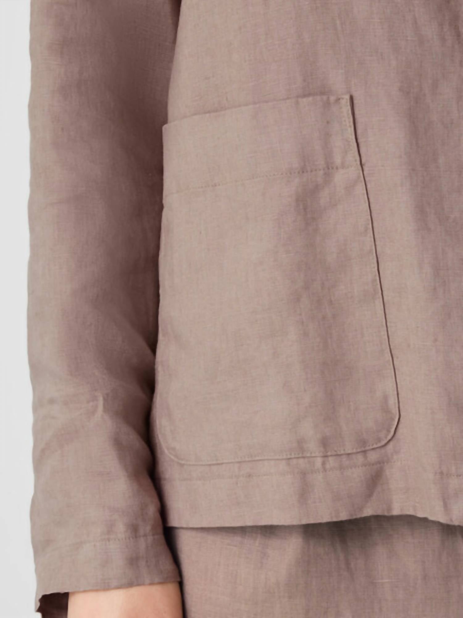 Relaxed and refined. A high collar jacket with patch pockets, in our signature Organic Linen