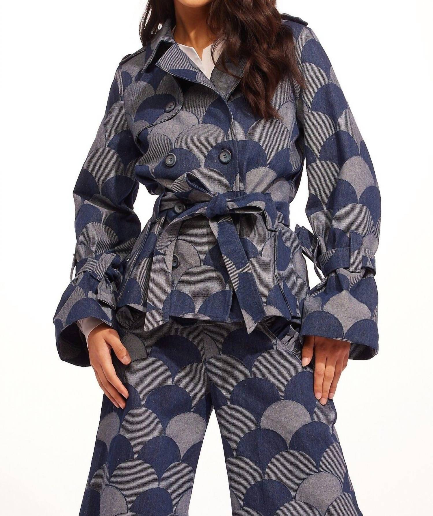 Esta elegante jaqueta jeans amarra na cintura para um ajuste confortável e elegante, com design trespassado.