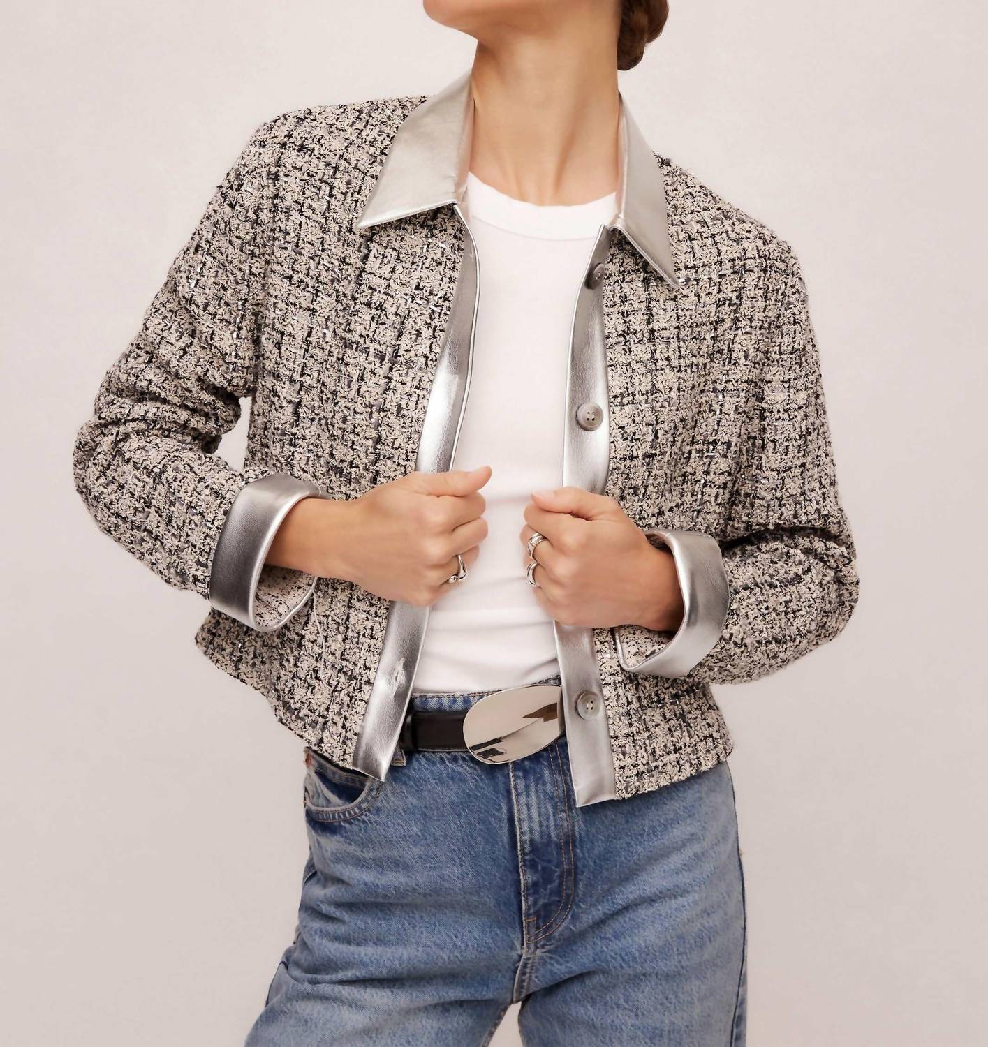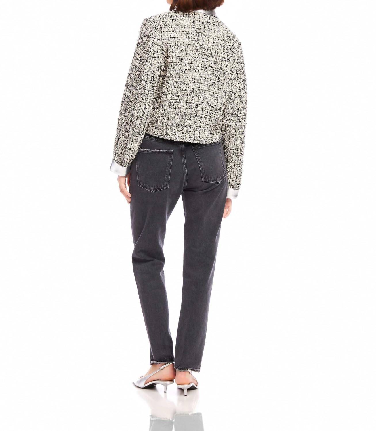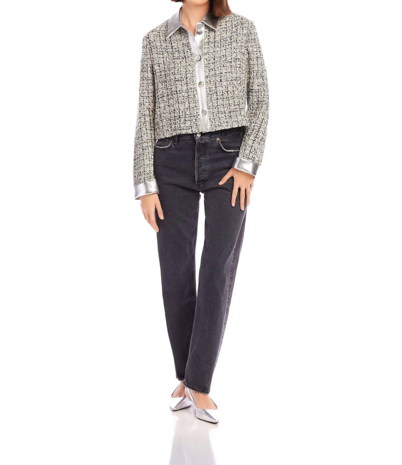 Um blazer tão versátil que você pode usá-lo no escritório ou combiná-lo com jeans para um visual mais casual. Apresentamos a Jaqueta Cropped Cher Boucle da Fifteen Twenty, uma adição luxuosa a qualquer guarda-roupa em preto com detalhes metálicos. Esta jaqueta possui mangas compridas e é habilmente confeccionada em uma mistura de bouclé metálico: 61% algodão, 20% poliéster, 10% acrílico, 5% lã e 4% viscose. Ela possui um comprimento cropped chique de 51 cm (tamanho P) e é feita nos EUA com tecido italiano. O fecho é um clássico estilo abotoado; as instruções de cuidado recomendam apenas lavagem a seco.