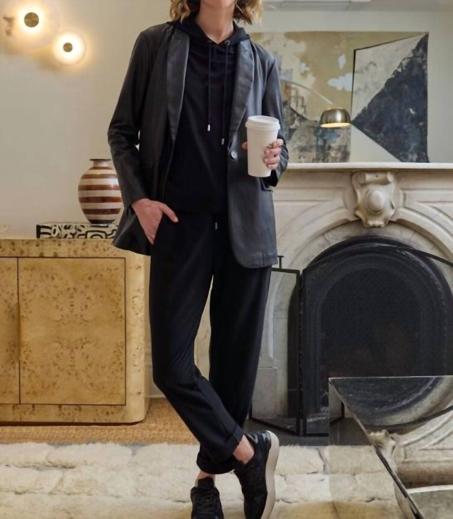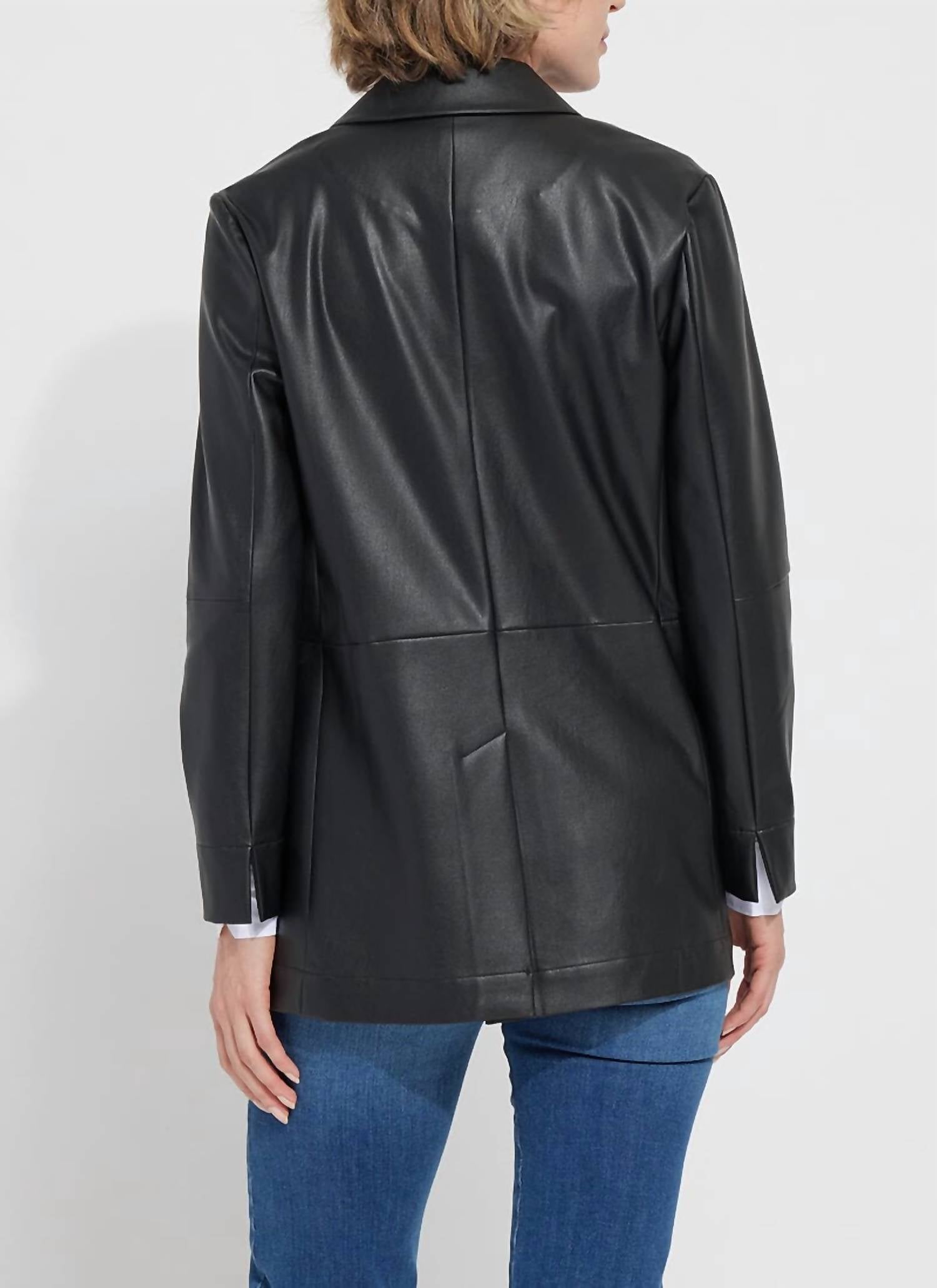 A blazer so versatile you can wear it to the office or pair it with jeans for a more casual look. Elevate your style with the Eira Vegan Leather Blazer by Lysse, a chic addition in solid black designed for women. Crafted from lightweight vegan leather, this blazer boasts long sleeves, flap pockets, and a tailored lapel collar with a flattering V-neckline. Material: 100% Polyurethane. Closure: Button closure. Versatile and comfortable with four-way stretch, it features a back vent, yoke, and wrist slits for easy rolling, making it ideal for a stylish streetwear look. Unlined and machine washable, this piece is perfect for travel and holiday occasions like Thanksgiving. Model is 5’10” and wearing size S.