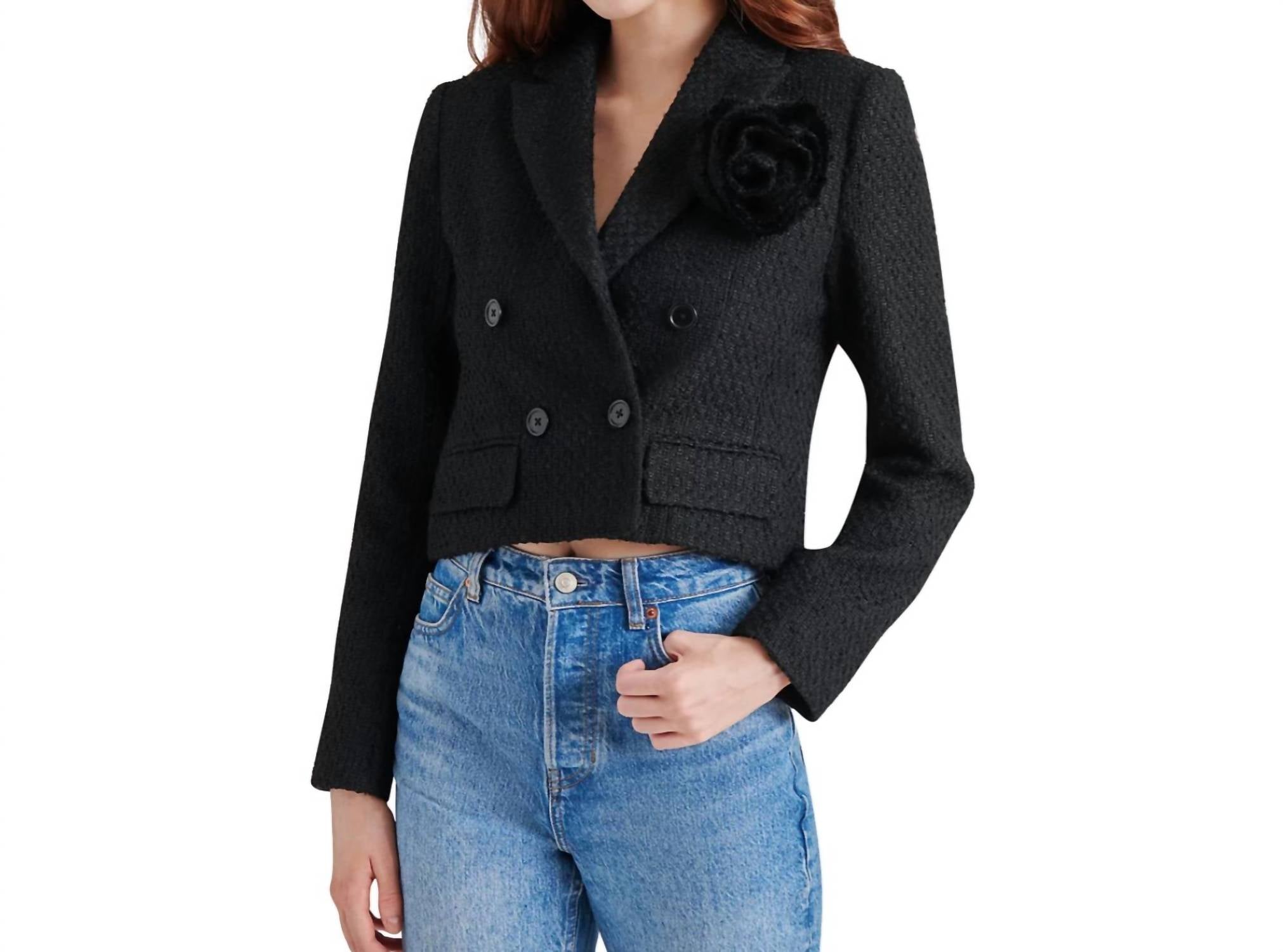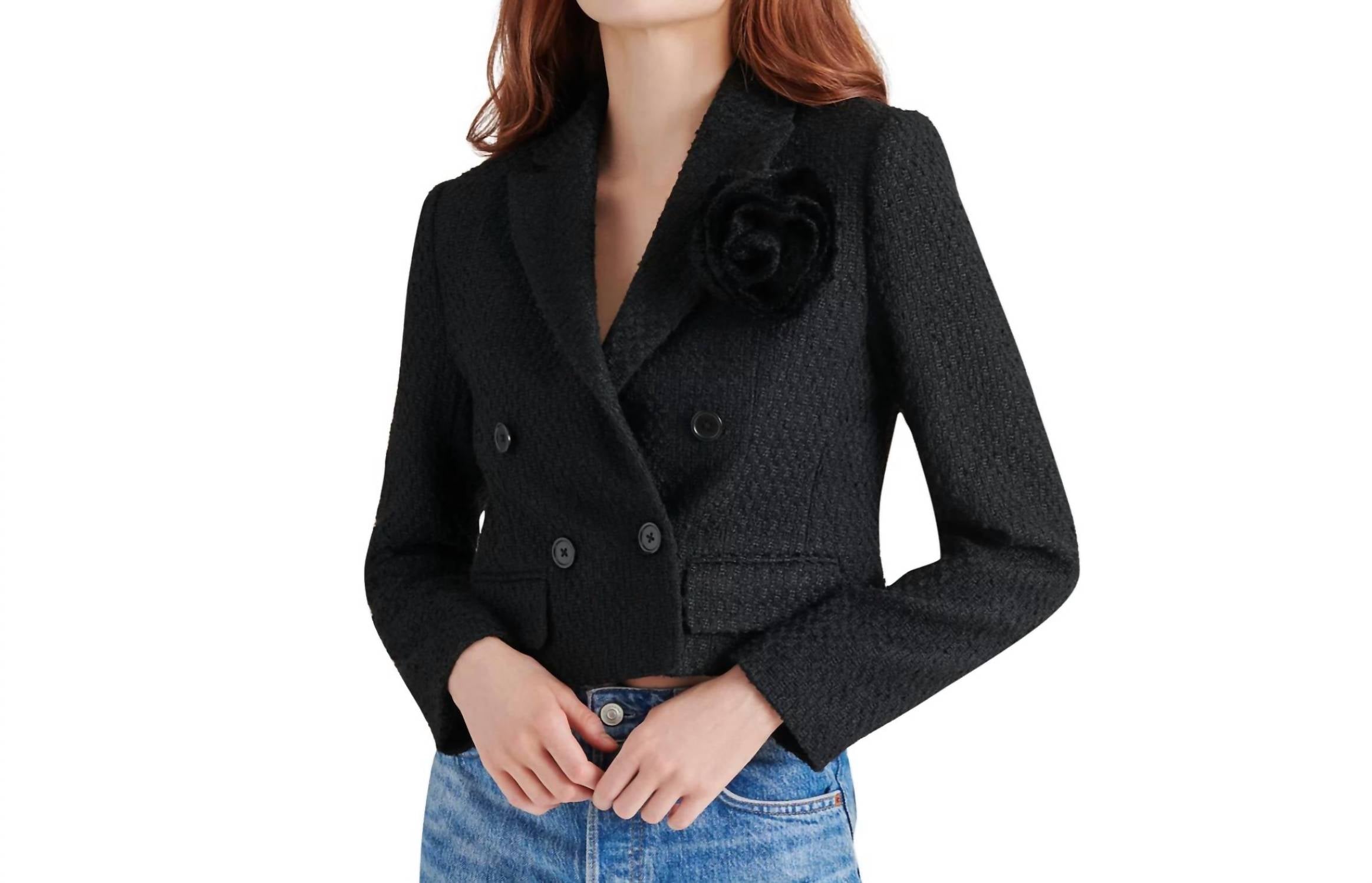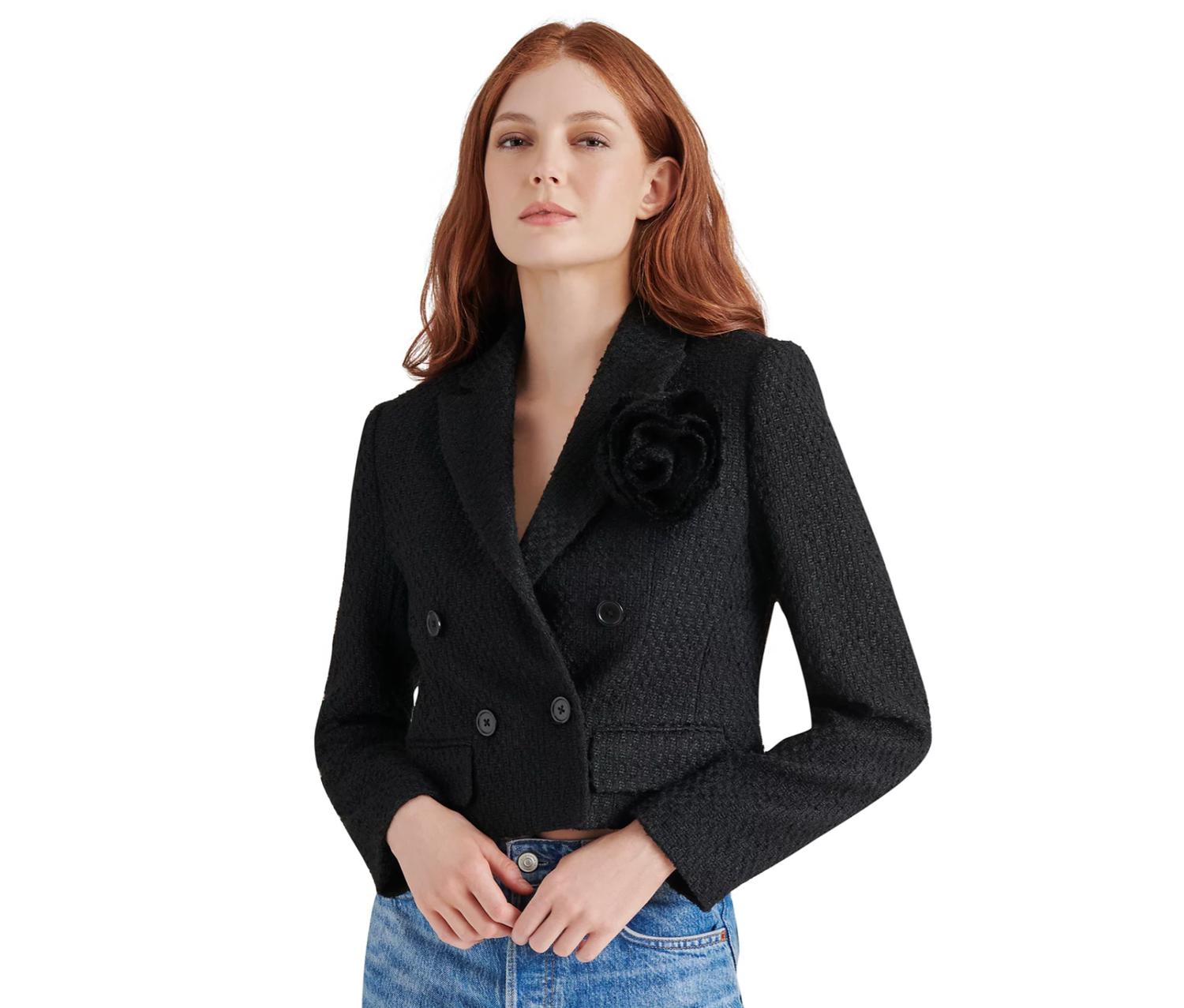 Um blazer tão versátil que você pode usá-lo no escritório ou combiná-lo com jeans para um visual mais casual. Eleve seu guarda-roupa com o Blazer Virginie da Steve Madden, uma escolha estilosa para um visual texturizado e sofisticado em preto. Este blazer feminino possui mangas longas e gola clássica, conferindo-lhe um toque atemporal. É confeccionado com uma mistura de 96% poliéster e 4% elastano no cabedal e 84% poliéster, 9% algodão e 7% outras fibras na parte inferior, garantindo conforto e durabilidade. Feita com fecho de botão, esta peça é fácil de cuidar, com instruções de lavagem à máquina e secagem no varal.