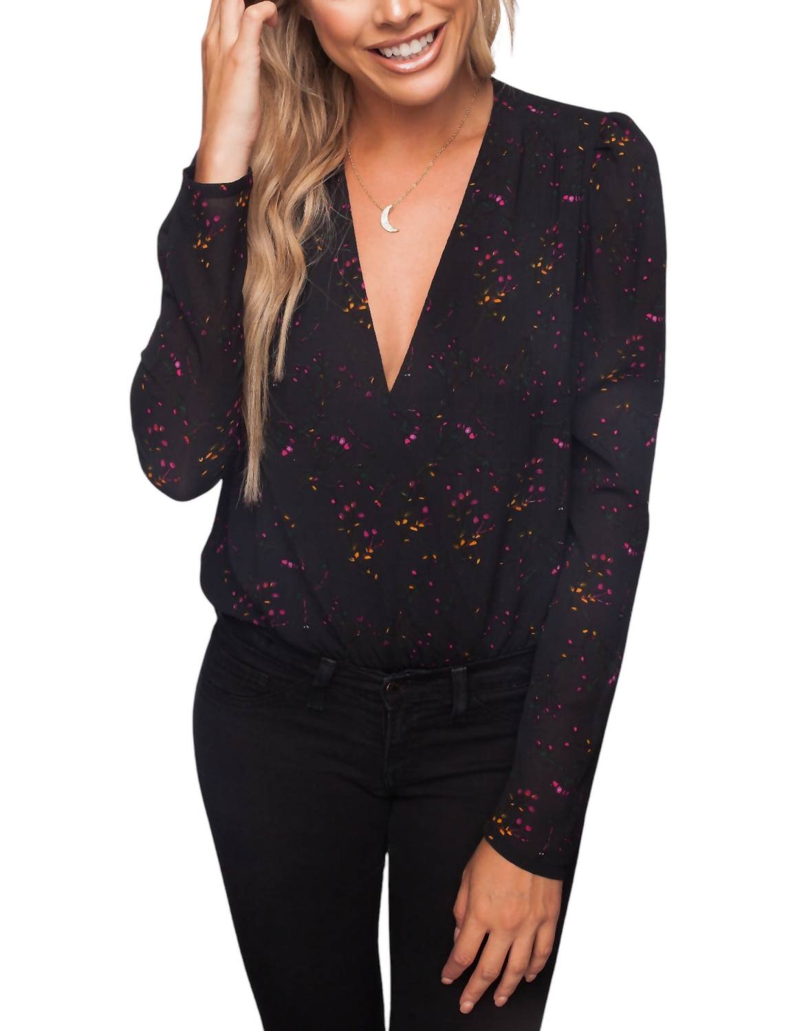 Form fitting and comfortable - this bodysuit check all of the boxes.This stylish outfit features a black long-sleeve bodysuit with a subtle colorful pattern, a deep V-neckline, and a relaxed yet flattering fit, paired with sleek black pants for a chic and polished look. Made from 100% Polyester.