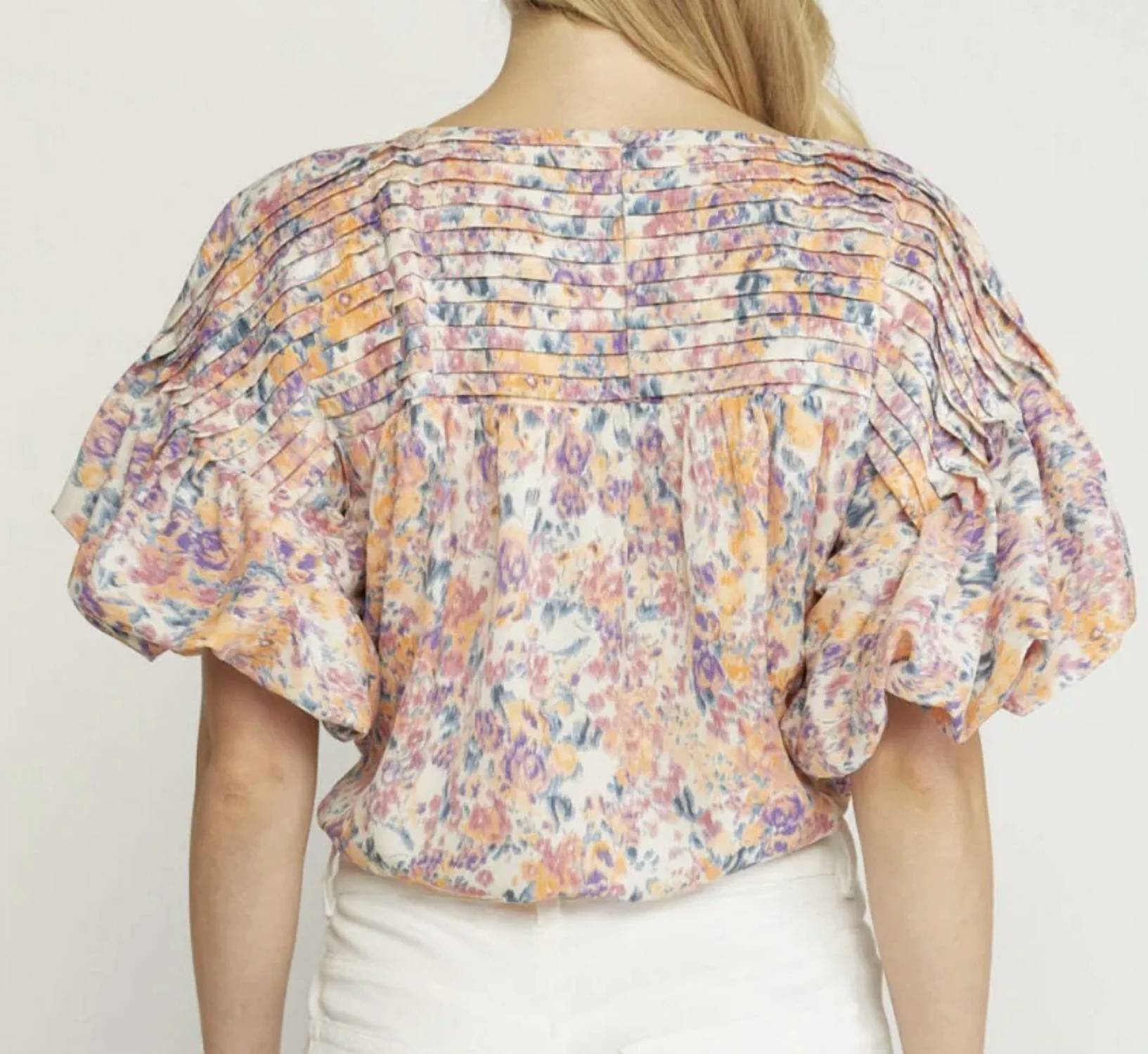 Introducing the Floral Pleated Bodysuit by Entro, crafted for chic summer elegance. With its short bubble sleeves and flattering boatneck, this bodysuit features a stylish floral pattern in a refreshing sherbet hue. The bodysuit offers both function and style with a convenient snap closure. Care is simple with hand wash and line dry instructions, making it a reliable choice for evening events.