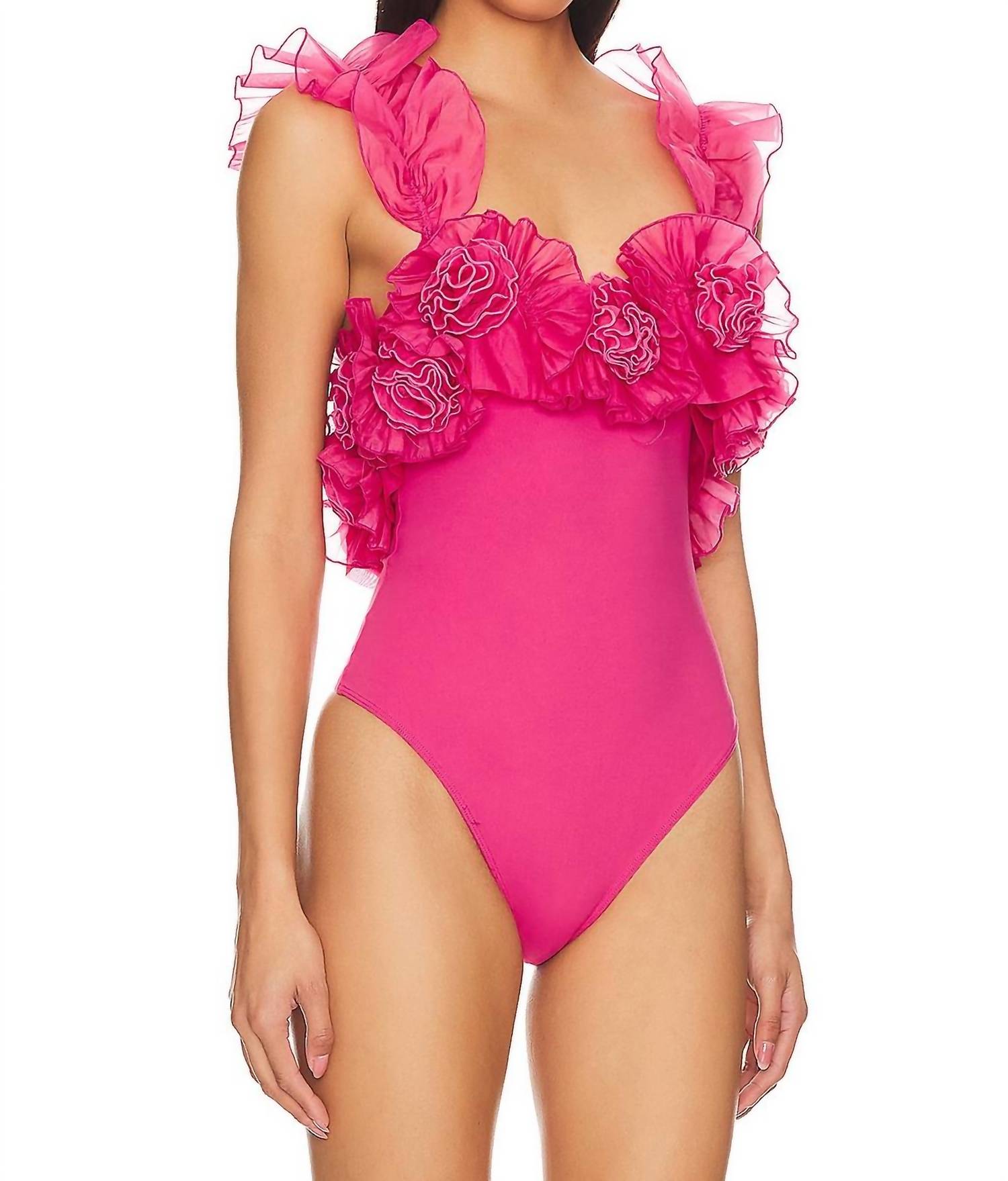 Discover the Until Next Time Bodysuit by Free People in a captivating Raspberry hue, designed to captivate with its playful flair. This sleeveless bodysuit combines a self composition of 88% nylon and 12% spandex with a contrast of 100% polyester. Made in China, it features a gusset snap button closure and a stretch jersey fabric bodice complemented by ruffled chiffon shoulder straps with rosette trim. For care, simply hand wash to maintain the garment's vibrant look and feel.