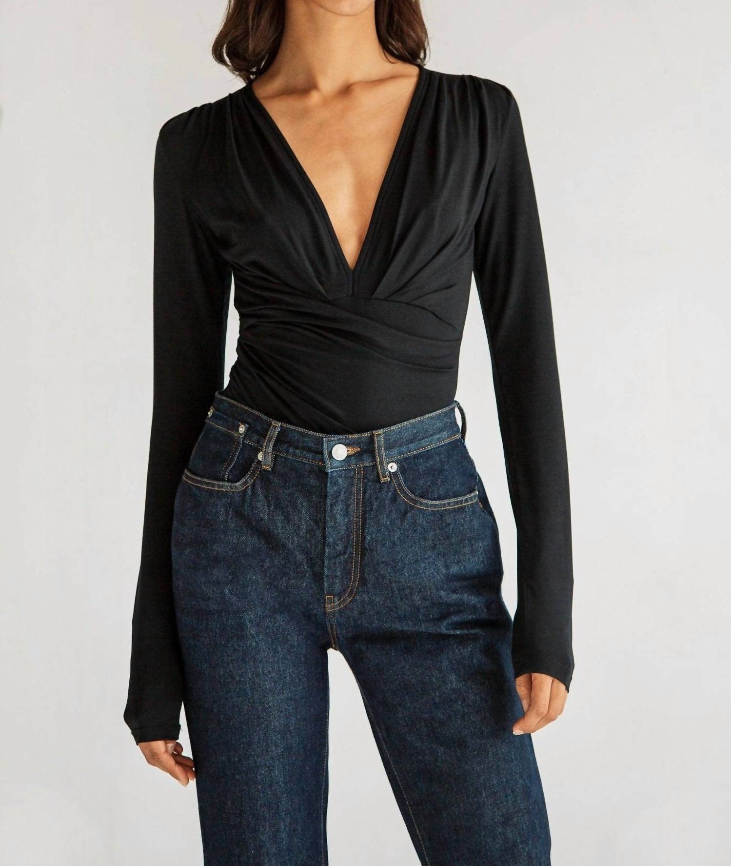 Introducing the Isla V-neck Bodysuit by The Line by K, designed for a chic monochrome look this fall. With slim long sleeves and hand-pleated detailing on the shoulder seams, this bodysuit is crafted from luxuriously soft micro-Modal jersey for a comfortable yet elegant fit. It exudes sophistication with its deep V-neck and full coverage bottom, making it perfect for layering under coats or blazers. Care is simple with machine wash and tumble dry instructions.