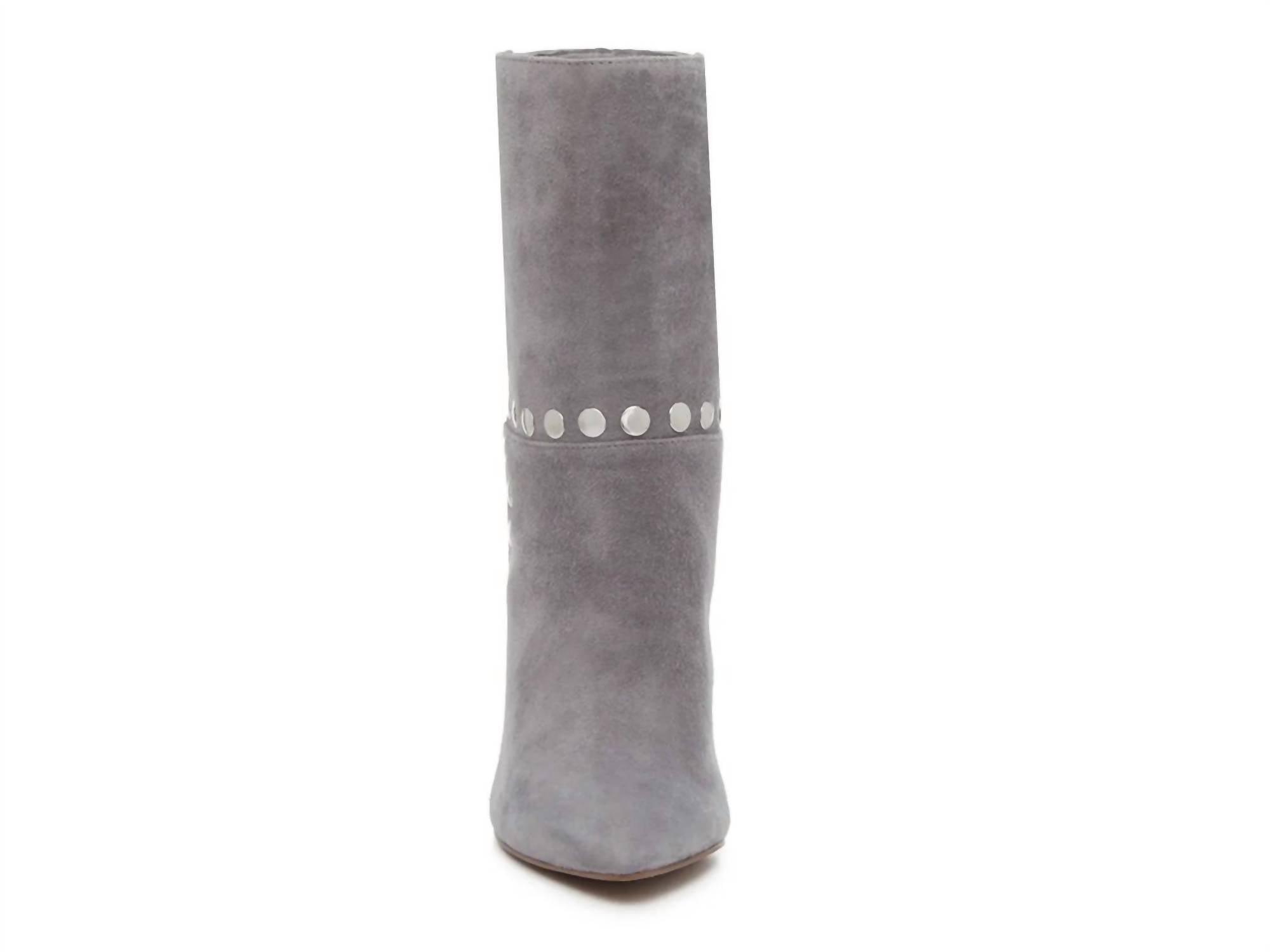 Eleve seu guarda-roupa com a Bota Feminina de Camurça Konnie da 42 Gold, com um elegante cabedal de camurça até a panturrilha em um sofisticado tom cinza. Desenhada com bico fino e salto cone coberto de 3,75", esta bota equilibra elegância e conforto perfeitamente. Importada com artesanato especializado, ela ostenta detalhes exclusivos de tachas prateadas e costuras aparentes para um toque ousado. Com fecho de pressão e solado sintético, oferece praticidade aliada ao seu design marcante.