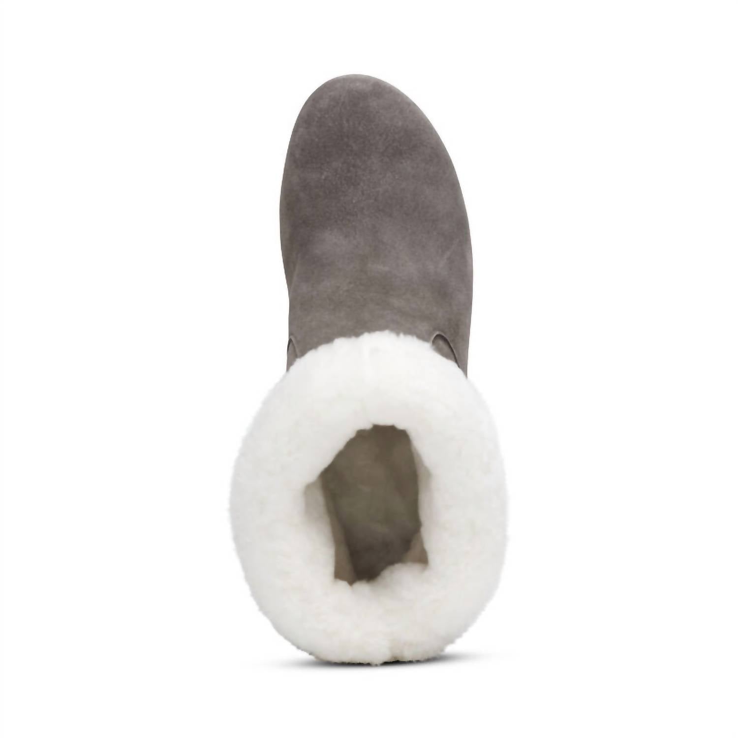 Puxadores para calçar e descalçar com facilidade. Cabedal em camurça genuína resistente às intempéries com forro de pele de carneiro. Entressola em cortiça ultraleve. Solado de borracha para maior durabilidade. Sola com travas para maior tração. Todos os materiais são tratados para ajudar a proteger contra chuva e poças d'água. Palmilha removível. Altura do salto: 8,1 cm.