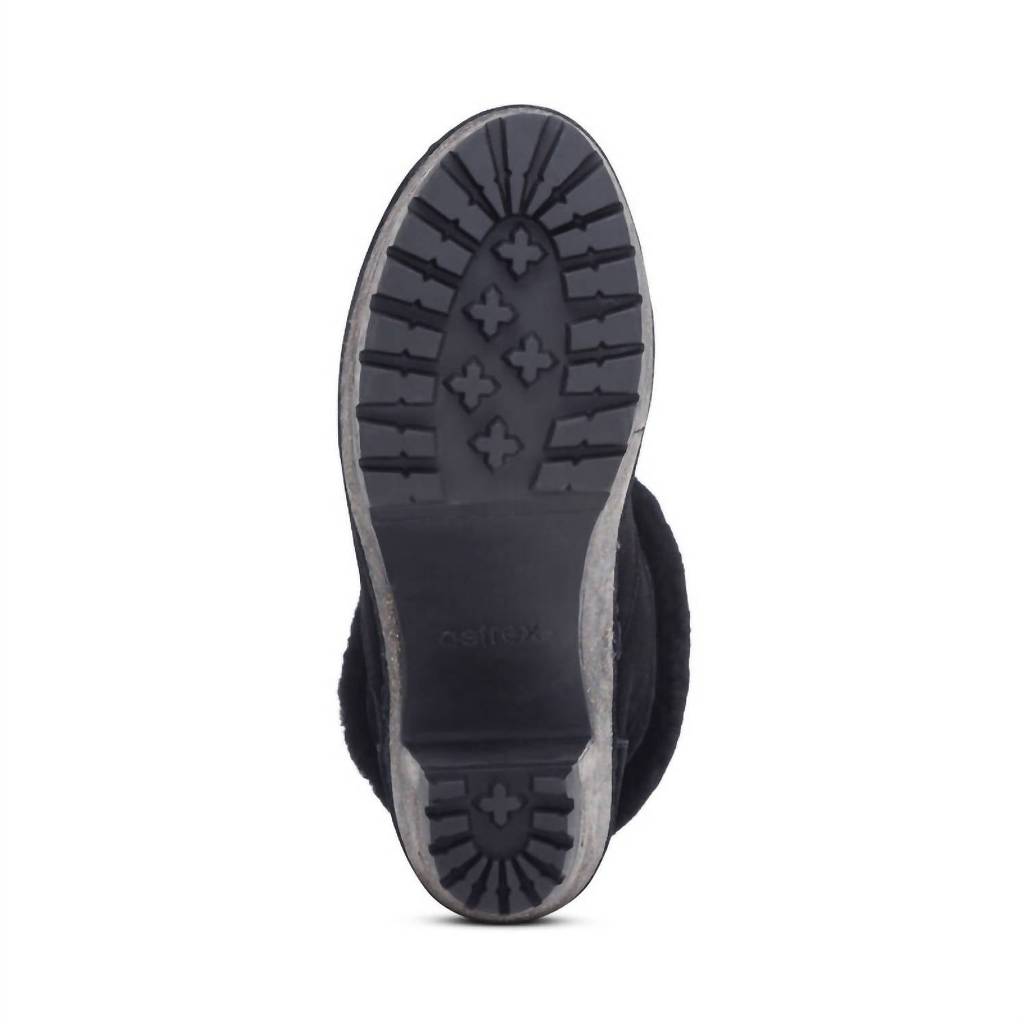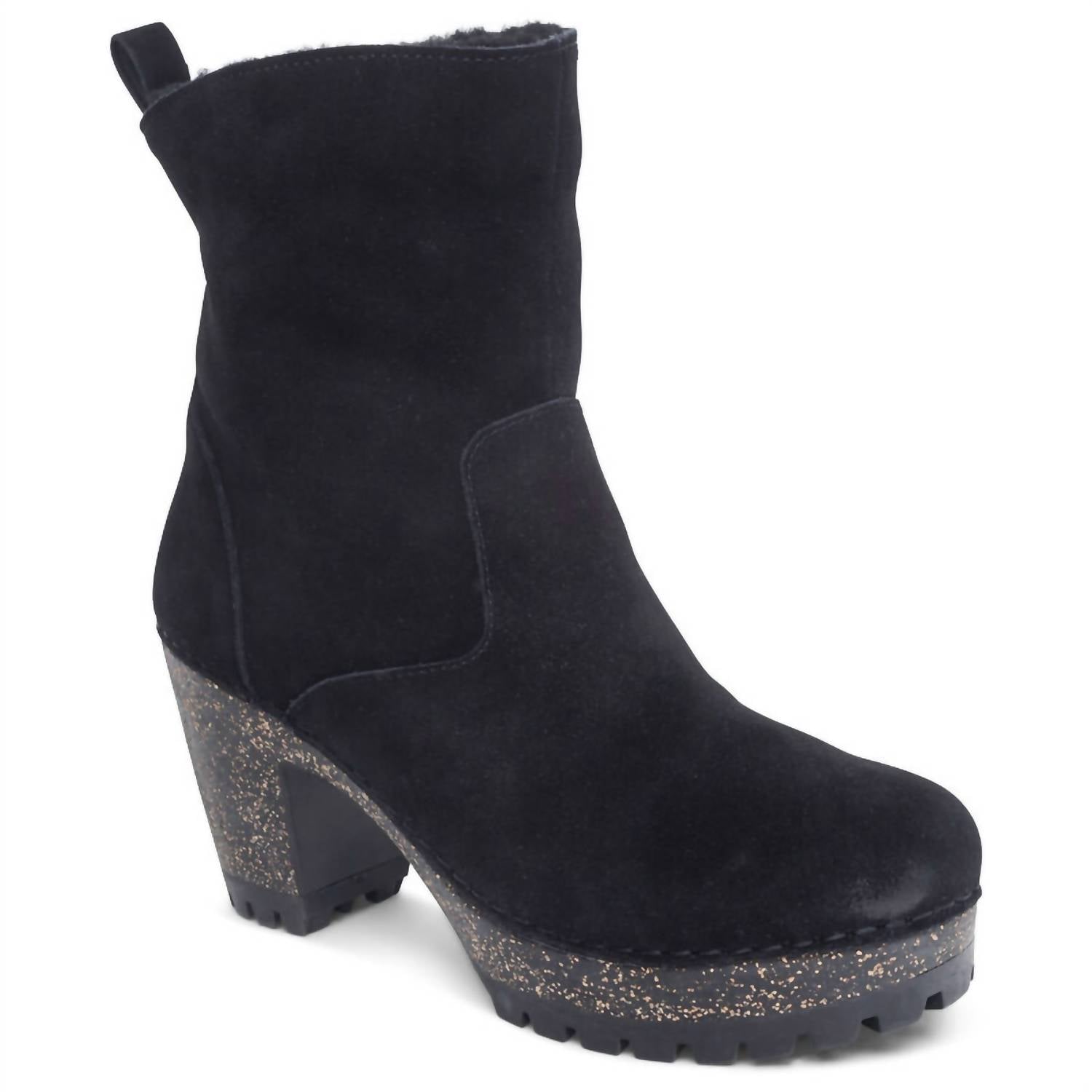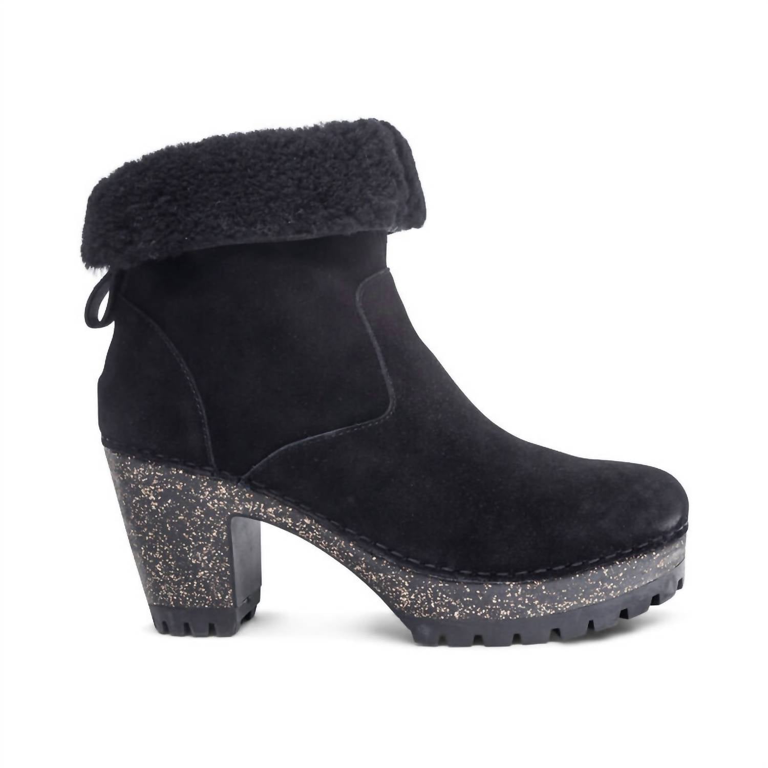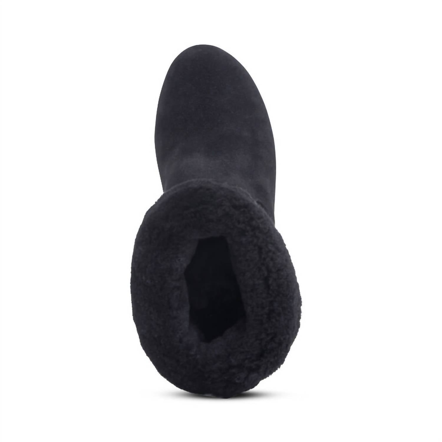 Puxadores para calçar e descalçar com facilidade. Cabedal em camurça genuína resistente às intempéries com forro de pele de carneiro. Entressola em cortiça ultraleve. Solado de borracha para maior durabilidade. Sola com travas para maior tração. Todos os materiais são tratados para ajudar a proteger contra chuva e poças d'água. Palmilha removível. Altura do salto: 8,1 cm.