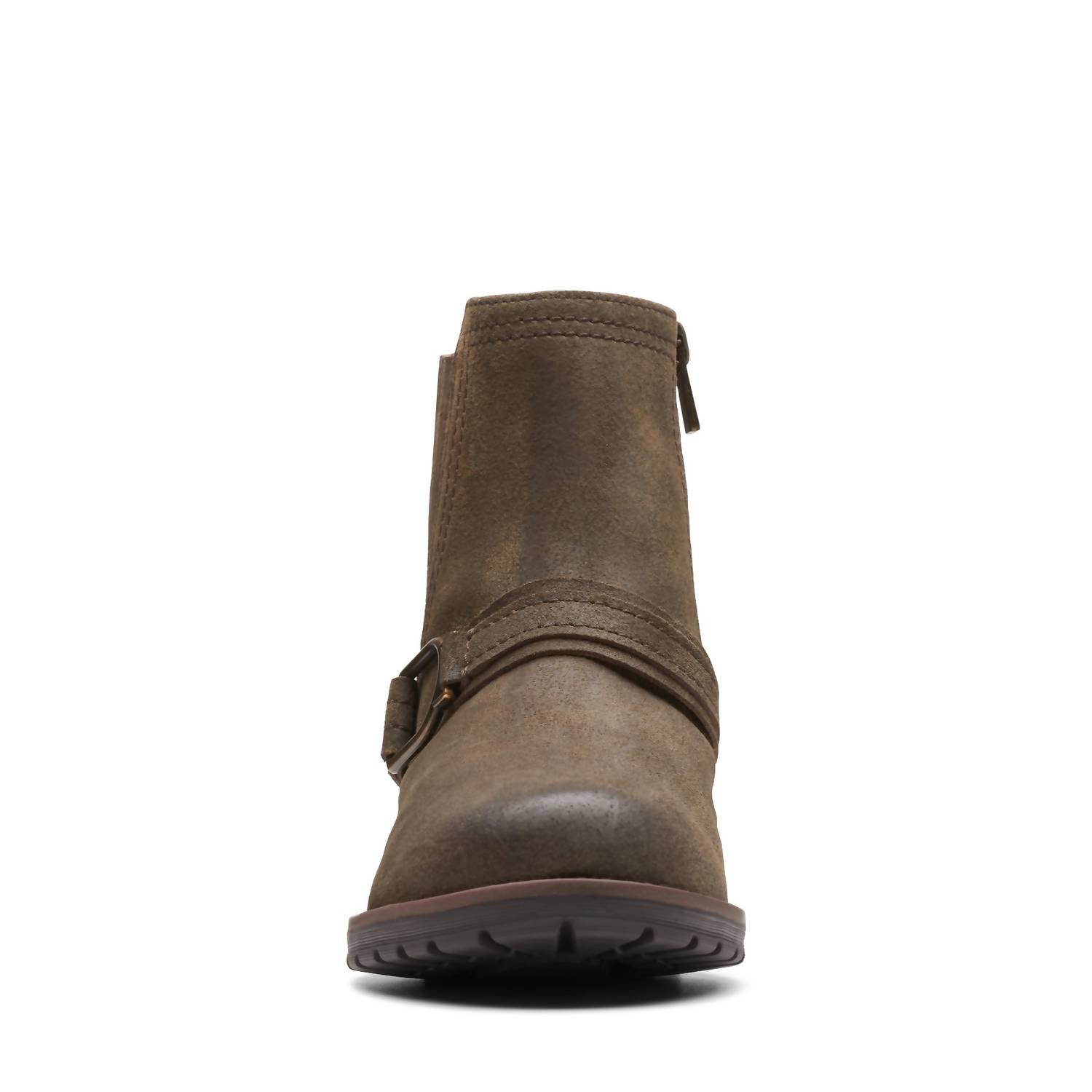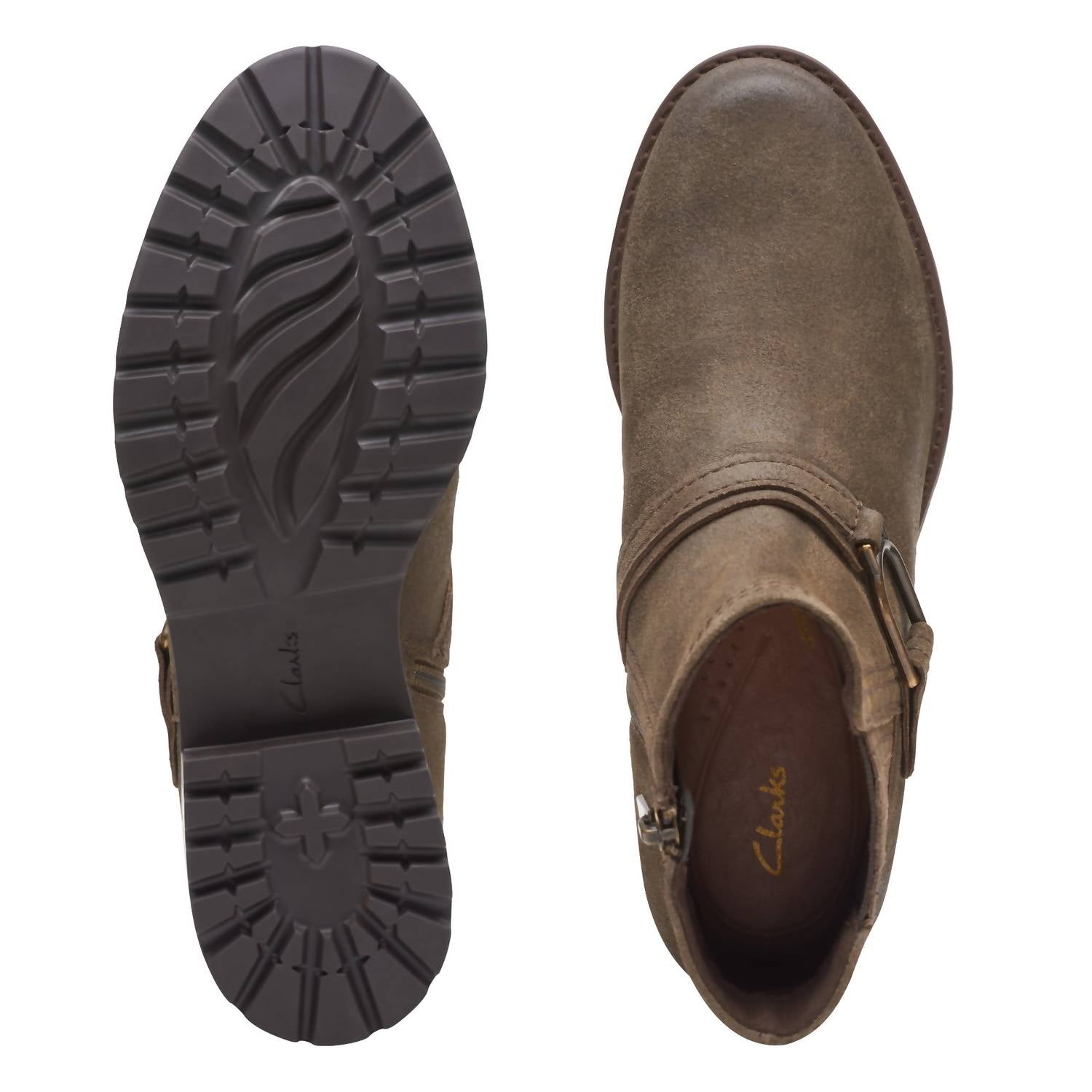 Say hello to the perfect, most versatile boot. The ankle height makes this style easily transition from day to night. Wear them with your favorite skinny jeans and tee for a more laid back look, or pair them with your favorite mini dress and jacket for a night out on the town. Step confidently through city streets with the Women's Aspra Buckle Ankle Boot by Clarks, crafted in dark olive suede for an elegant seasonal look. This design features a practical zip closure and a round toe shape, ensuring comfort and style. It boasts a suede upper, supported by a durable rubber outsole, and a cushioned foam footbed for all-day comfort. The standout buckle detail adds a sophisticated touch, with a heel height of 30mm.