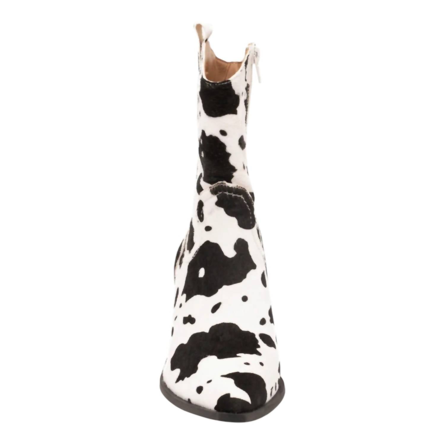 Uma escolha aventureira em botas de cano curto que ousa se destacar. Confeccionadas em couro e adornadas com uma impressionante estampa de vaca preta. Combinam estilo ousado com detalhes em couro sintético. Desenhadas com bico fino. Apresentam um salto bloco chique de 7,6 cm para elevar seu visual de inspiração western.