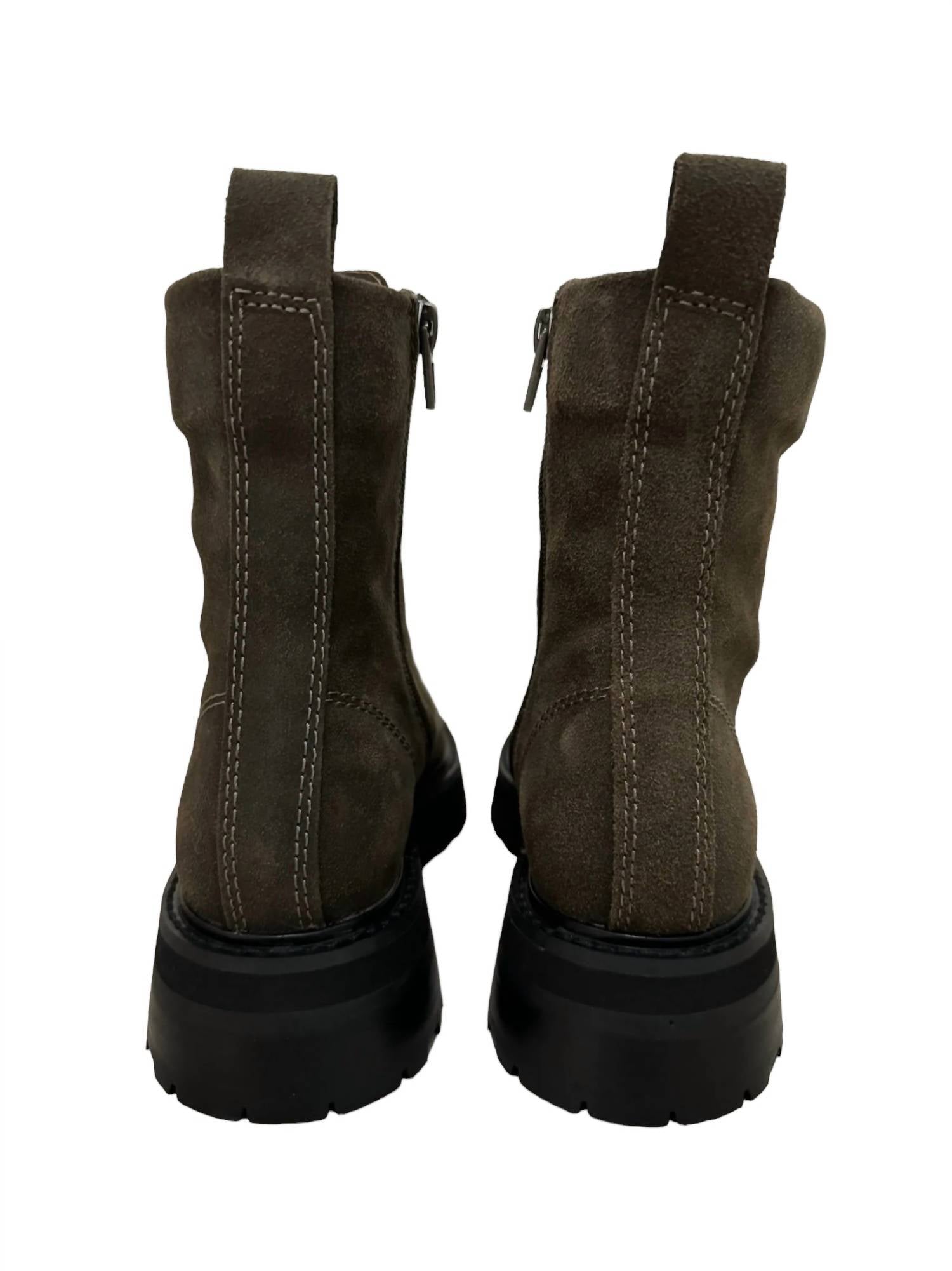 Diga olá à bota perfeita e mais versátil. A altura do tornozelo facilita a transição do dia para a noite. Use-a com sua calça jeans skinny favorita e camiseta para um look mais descontraído, ou combine-a com seu minivestido e jaqueta favoritos para uma saída à noite. Estas Rainer Boots apresentam cabedal de camurça com bico redondo e salto bloco, oferecendo uma versão estilosa da clássica bota de combate. Com cano de 15 cm de altura, circunferência da perna de 24 cm e solado de borracha para tração, elas proporcionam praticidade e elegância.