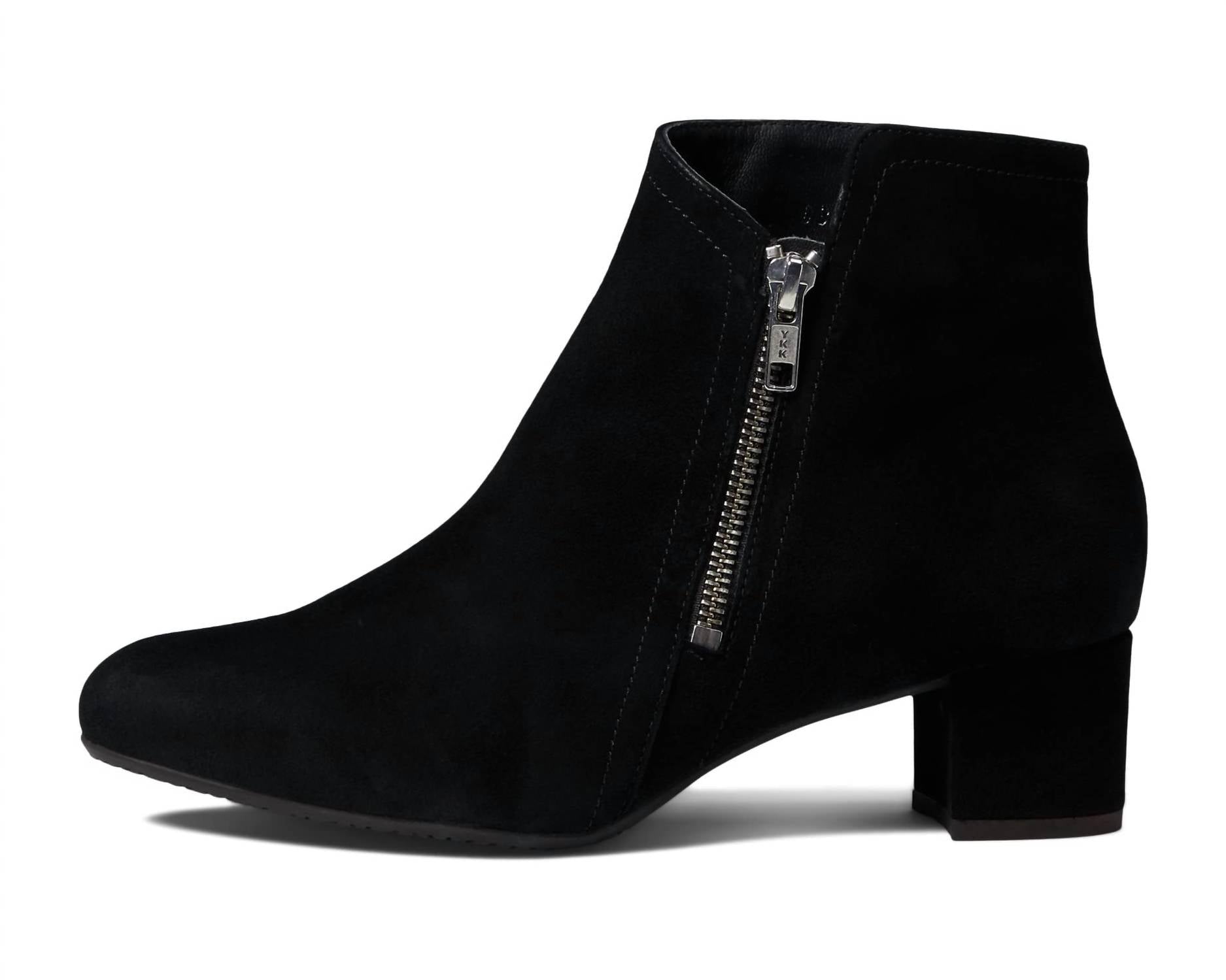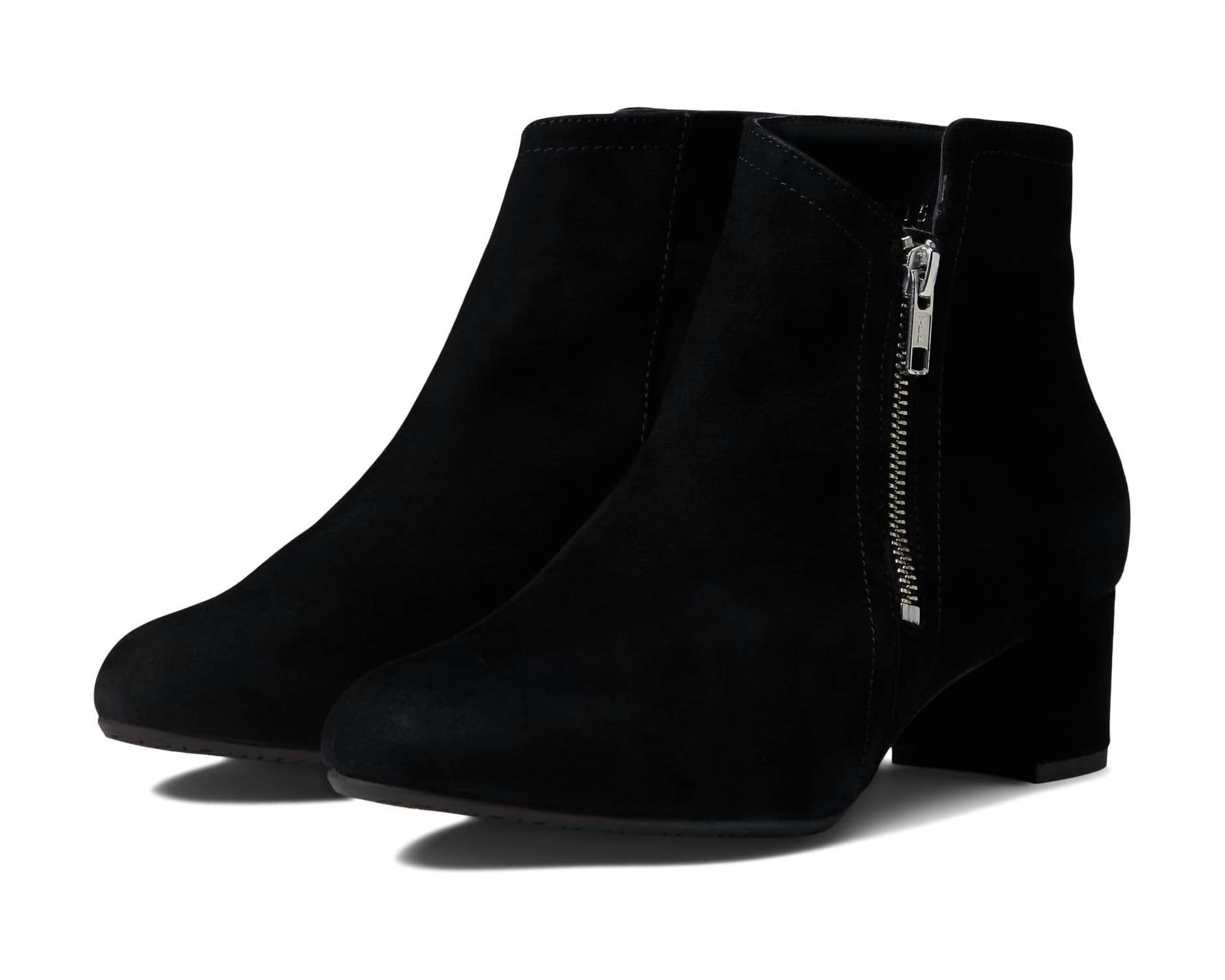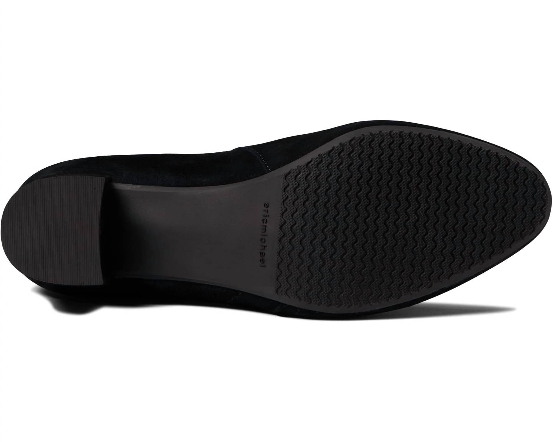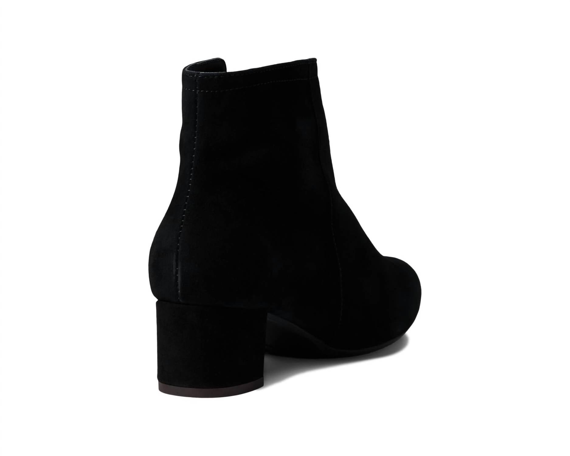 Say hello to the perfect, most versatile boot. The ankle height makes this style easily transition from day to night. Wear them with your favorite skinny jeans and tee for a more laid back look, or pair them with your favorite mini dress and jacket for a night out on the town. Discover understated elegance with the Eric Michael® Alexis Ankle Boots in Black Suede, crafted for the discerning minimalist. Made from premium leather, these boots feature a zippered closure for ease and a pointy toe silhouette that radiates sophistication. The block heel construction adds stability, with a heel height of 1.5 inches and a 5-inch shaft. Made in Portugal, these boots are designed for medium width and perfect for both daytime outings and dinner parties.