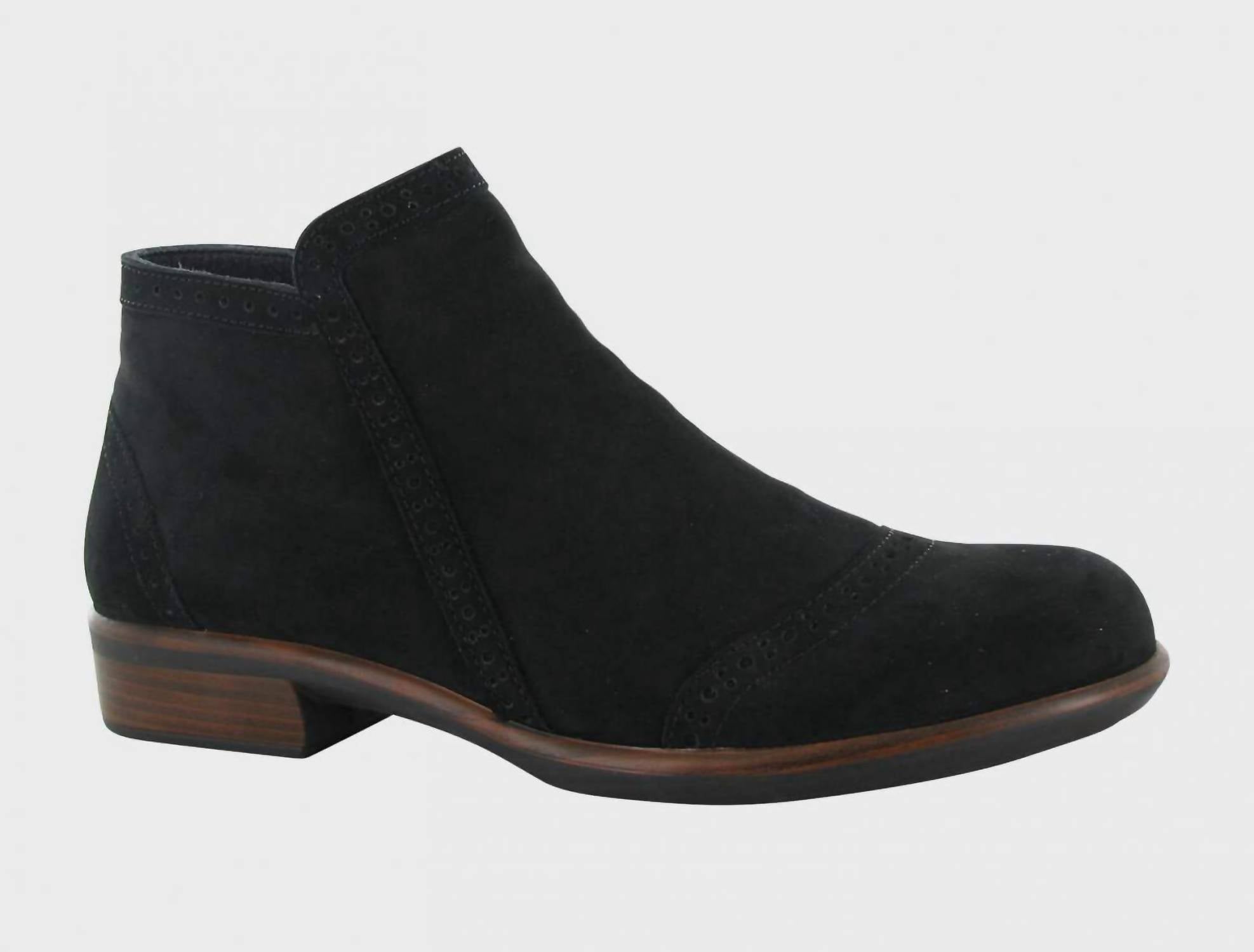 Introducing the Women's Nefasi Boot by NAOT, a menswear-inspired oxford silhouette that becomes a timeless wardrobe staple. Crafted from black velvet nubuck with a leather upper, this boot showcases perforated seams for added flair. Designed with a removable, anatomic cork and latex footbed wrapped in microfiber and leather, it molds to your foot shape over time. Complete with a slip-resistant polyurethane outsole and made in Israel, these boots offer style and comfort, perfect for a minimalist look at your next dinner party.