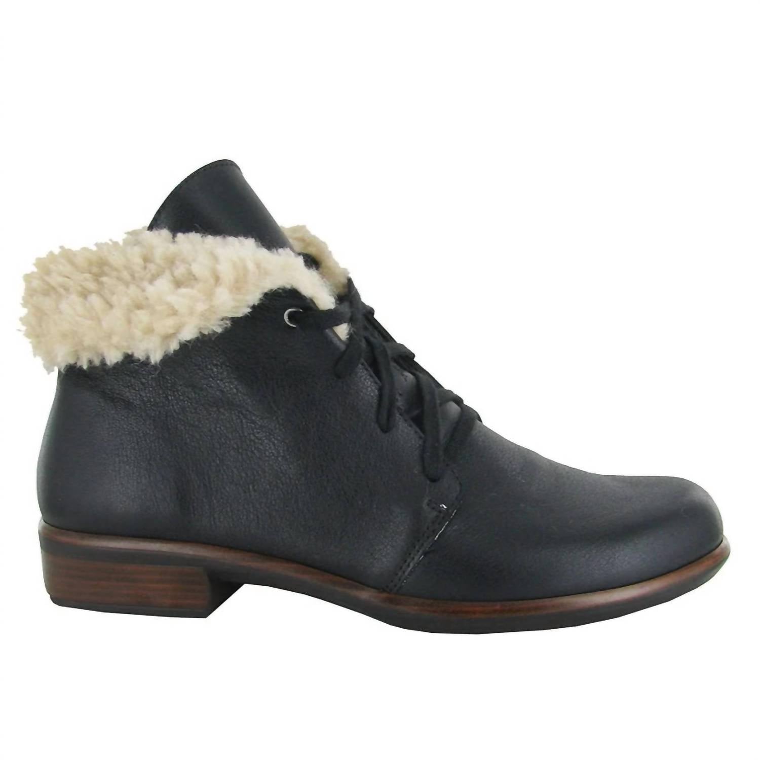 Smooth leather, faux shearling cuff and lace up closure. Stylish bootie and it features Naot's removable, anatomic cork & latex footbed for all day comfort. The Aura Collection features a 1.5" polyurethane sole with a metal shank which is extremely lightweight, durable & abrasive to prevent slipping. This collection uses a hand-sewn Strobel construction making it strong and extremely flexible.