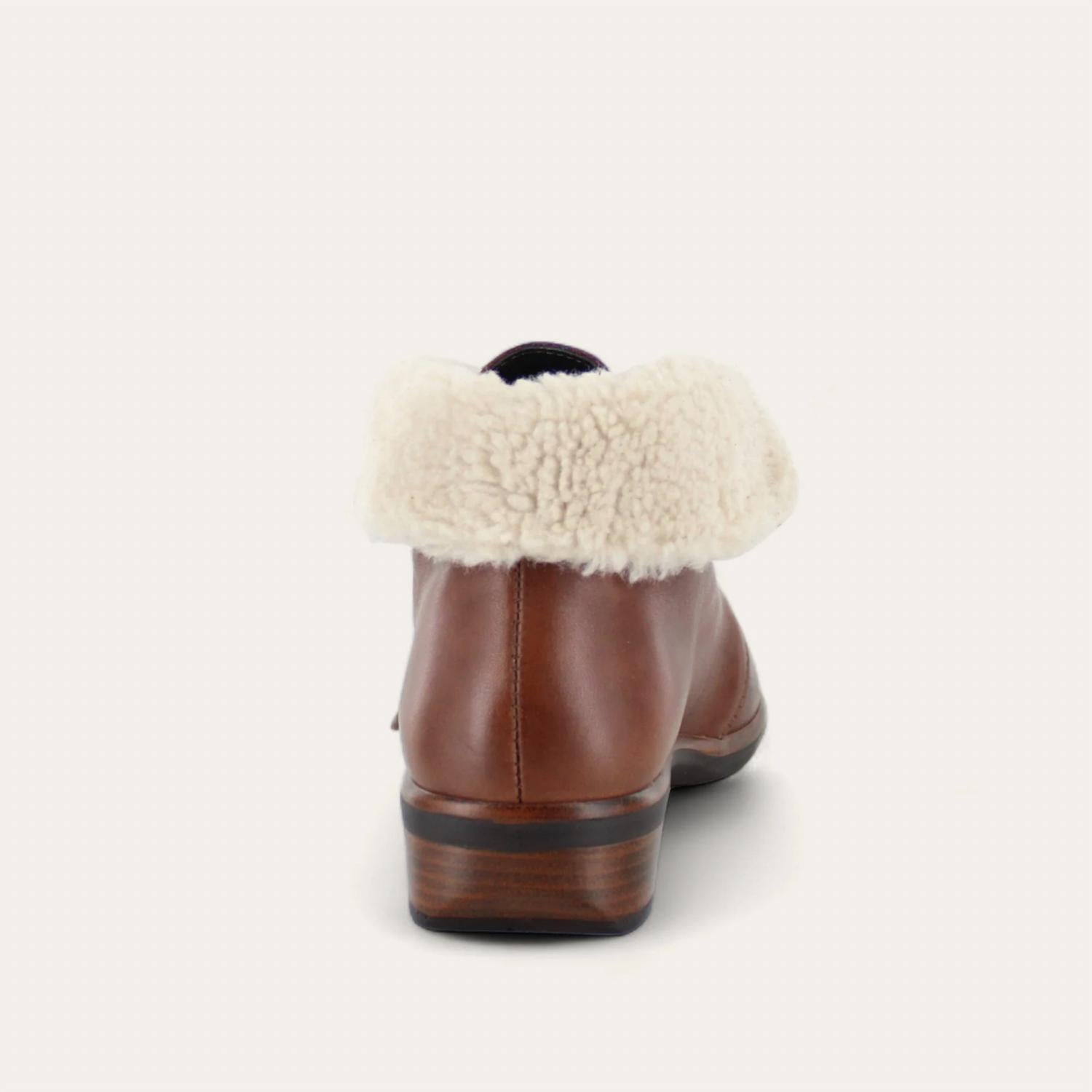 Featuring a faux shearling cuff and lace-up closure, these ankle boots are both fashionable and functional, offering a comfortable medium width and a round toe design. The removable cork and latex footbed ensures all-day comfort, and the 1.5" block heel on a slip-resistant polyurethane sole provides durability and support. Ideal for orthotic needs and constructed for strength and flexibility, these booties are true to size with a recommendation to size up for half sizes.