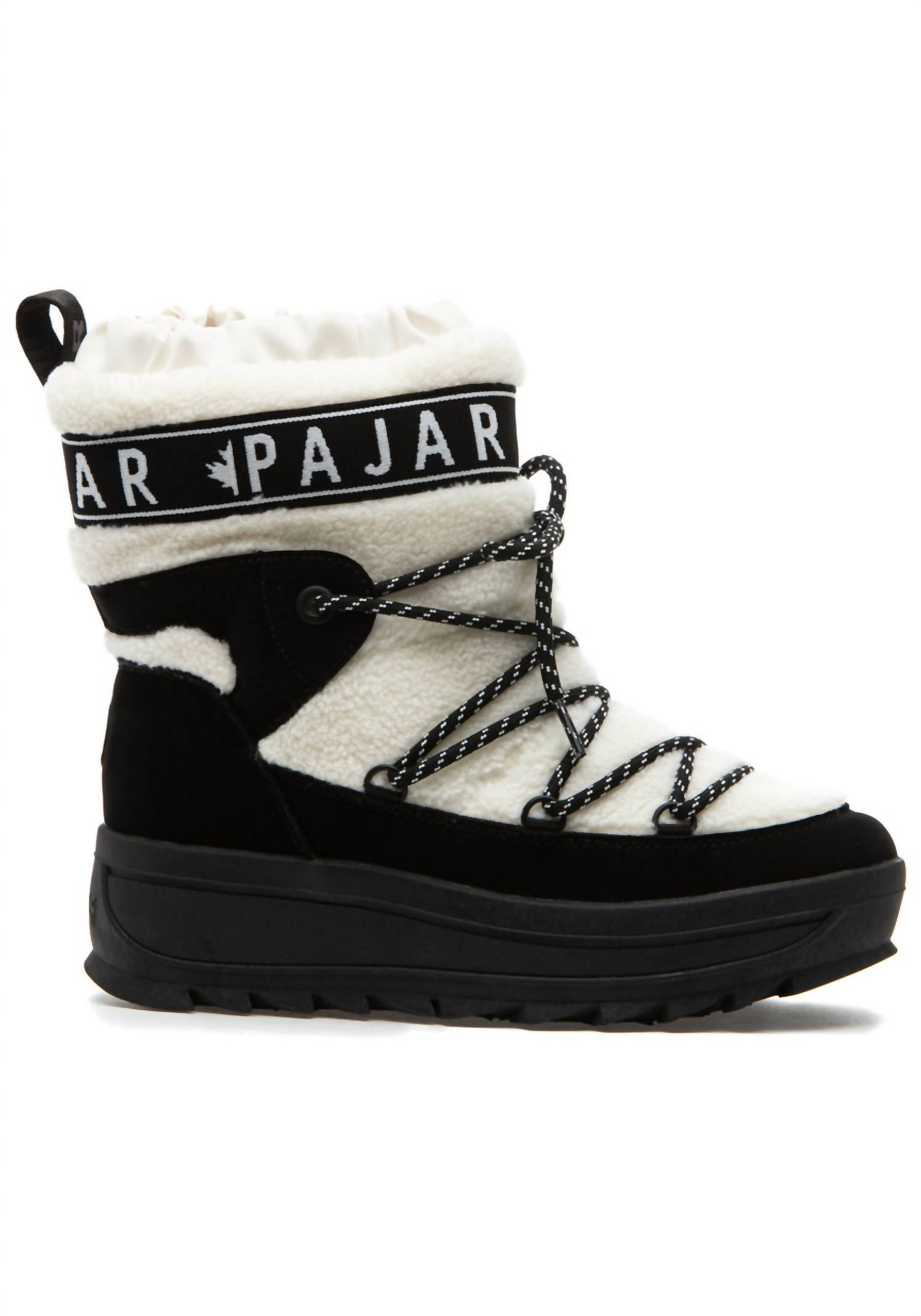 Say hello to the perfect, most versatile boot. The ankle height makes this style easily transition from day to night. Wear them with your favorite skinny jeans and tee for a more laid back look, or pair them with your favorite mini dress and jacket for a night out on the town. Introducing the Women's Galaxy Lama Boots by PAJAR, a perfect blend of style and functionality. These ankle boots feature a waterproof white sherpa and black vegan nubuck upper with a wool blend lining for added warmth and comfort. Designed with a cushioned footbed, they promise all-day comfort, while the rubber sole and lace-up closure provide stability and a secure fit. The boots are rounded off with a rear pull tab and an approx. 1.5" x 1" wedge platform, making them a chic and practical addition to your wardrobe.