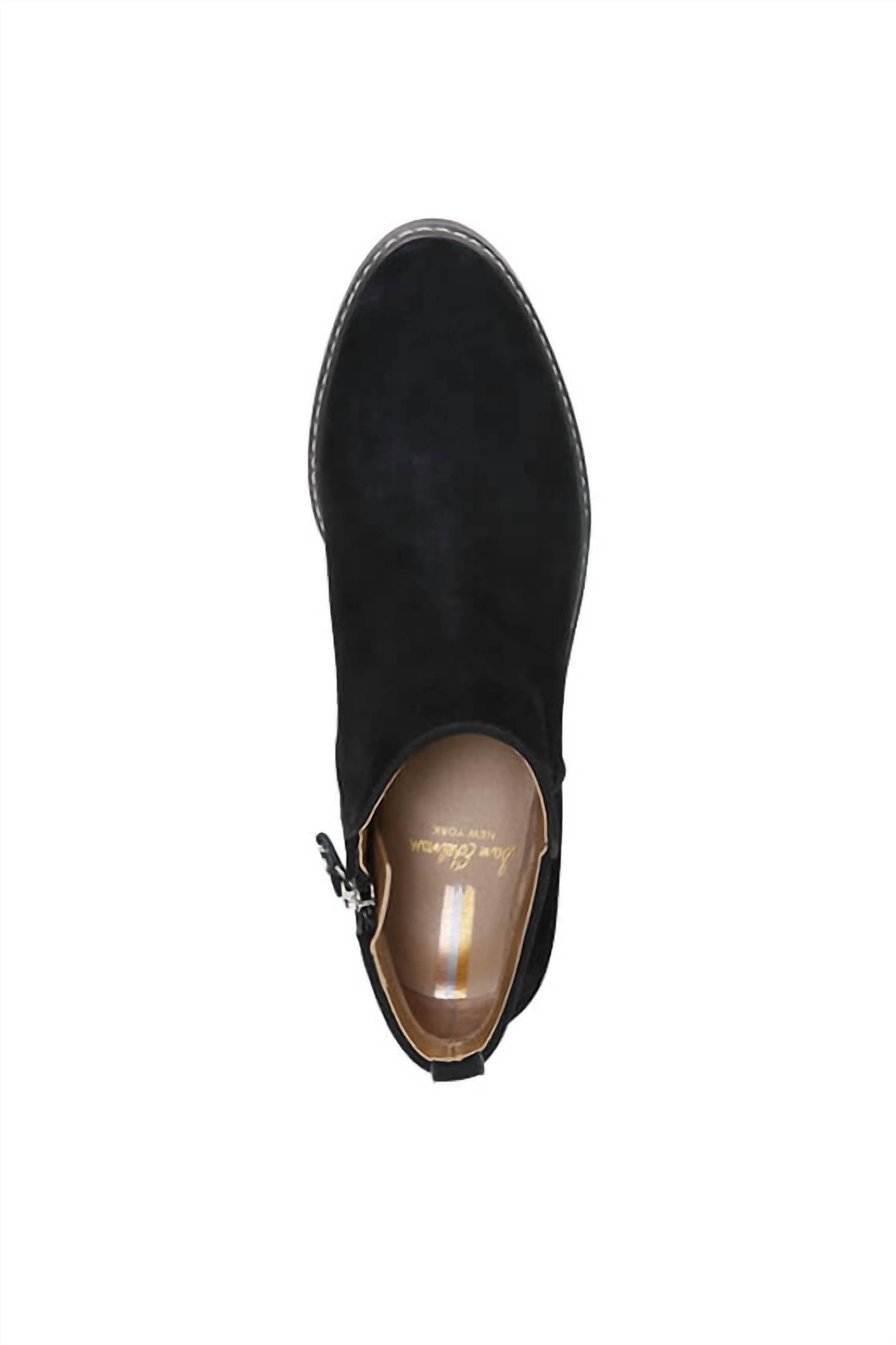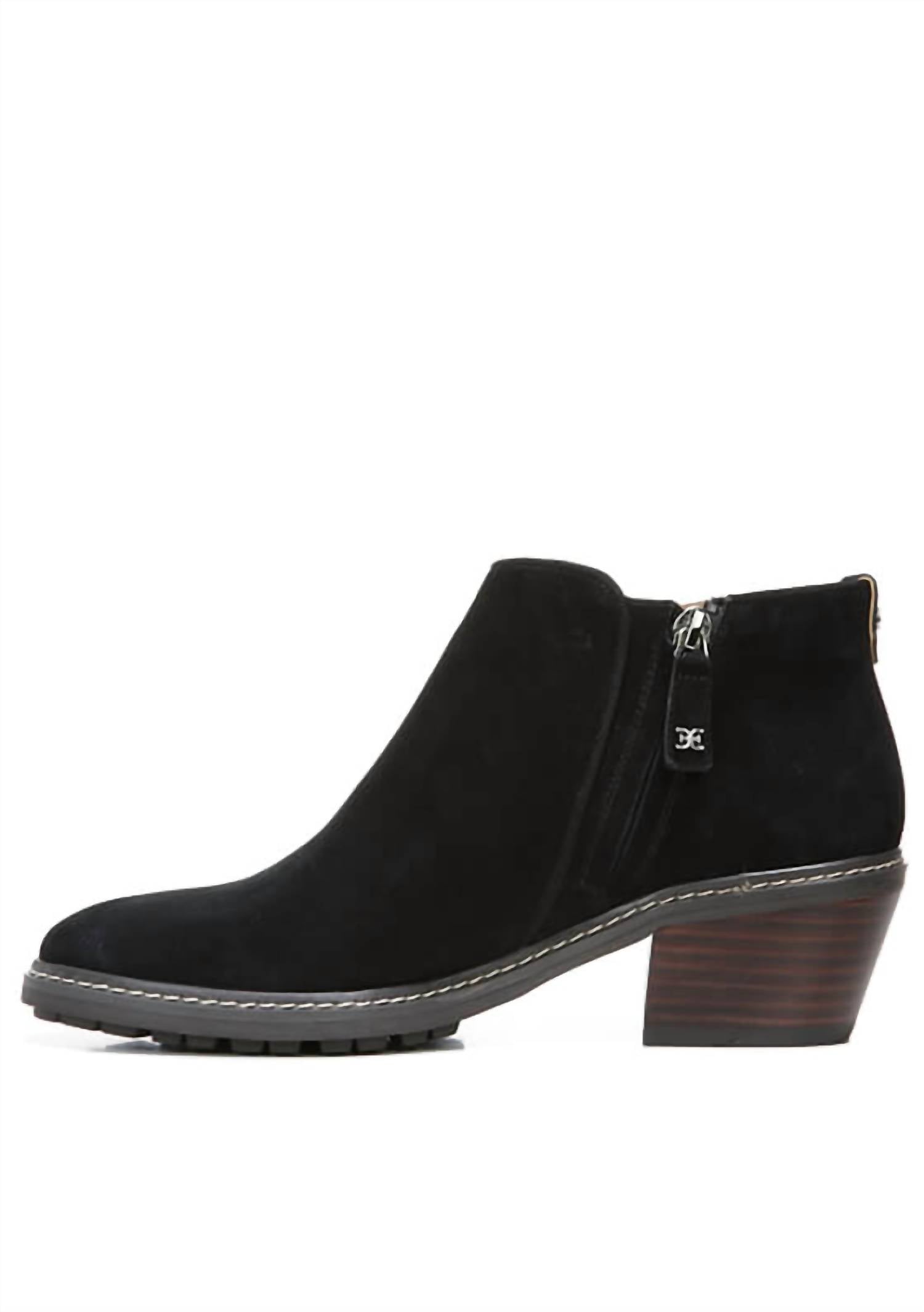 Diga olá à bota perfeita e mais versátil. A altura do tornozelo facilita a transição do dia para a noite. Use-a com sua calça jeans skinny favorita e camiseta para um look mais descontraído, ou combine-a com seu minivestido e jaqueta favoritos para uma saída à noite. Confeccionada em luxuoso couro camurça preto, esta bota possui um prático fecho de zíper e bico arredondado para um visual clássico. Com salto bloco baixo de 4,3 cm e cano de 7,8 cm, garante um ajuste confortável com 28 cm de circunferência da panturrilha. Abrace a praticidade e o estilo com sua palmilha sintética durável.