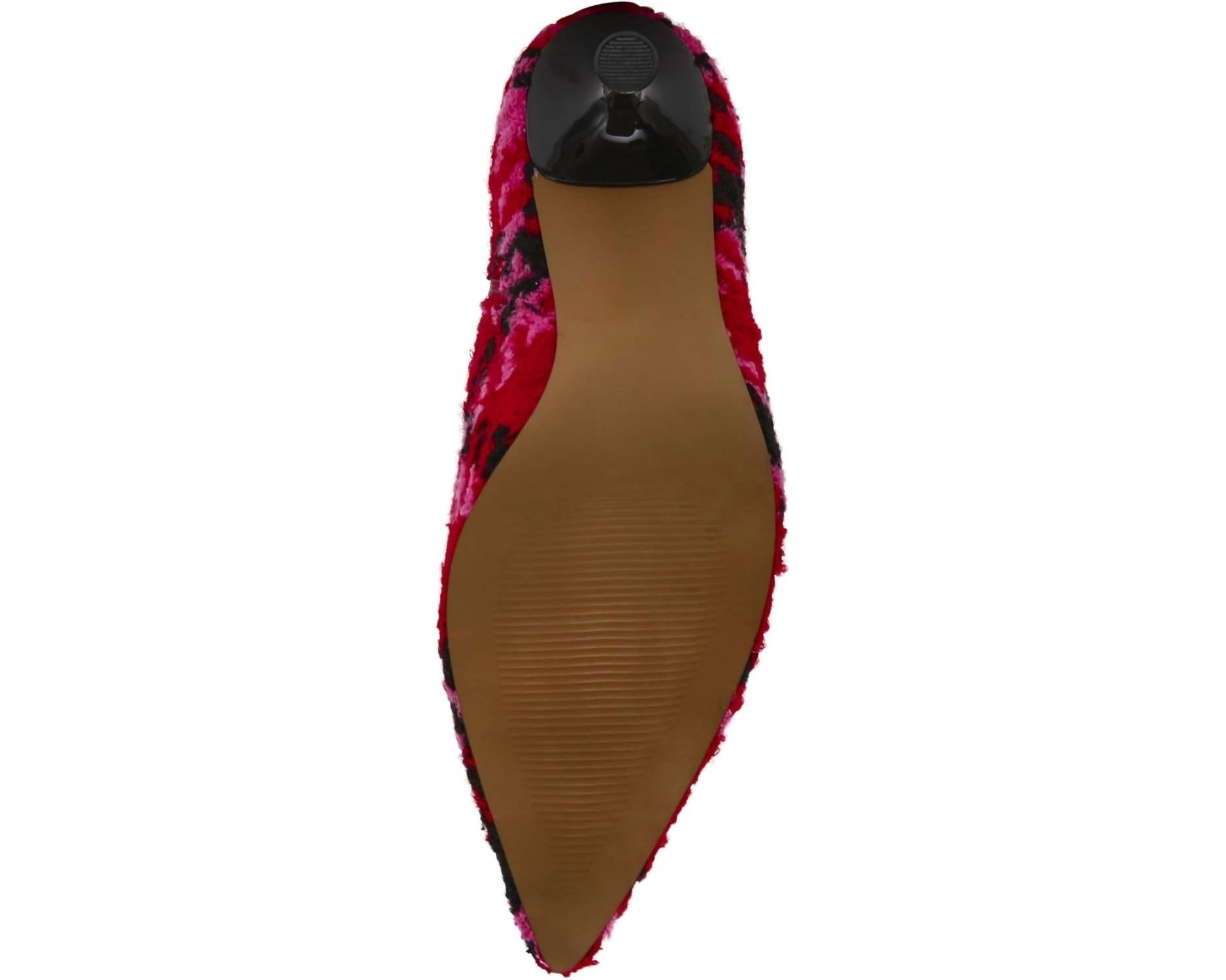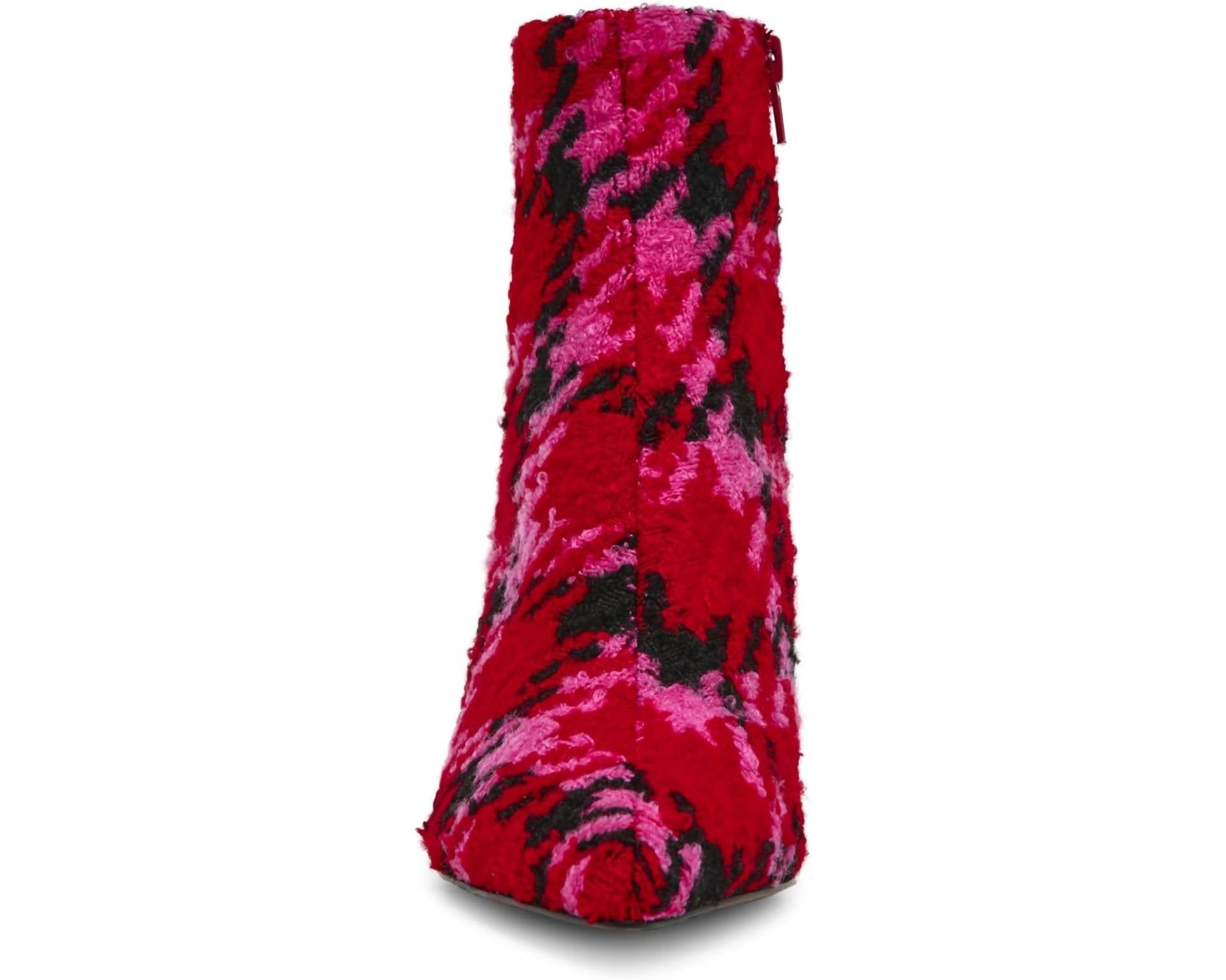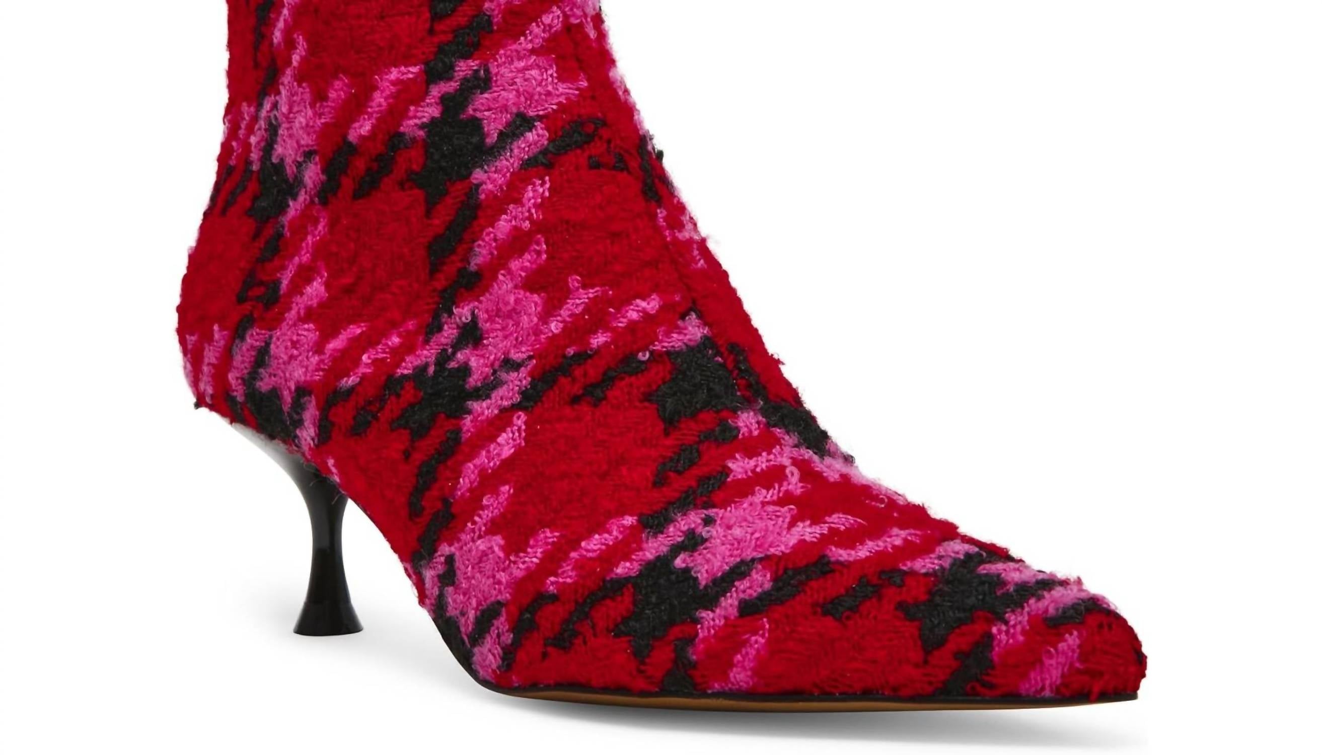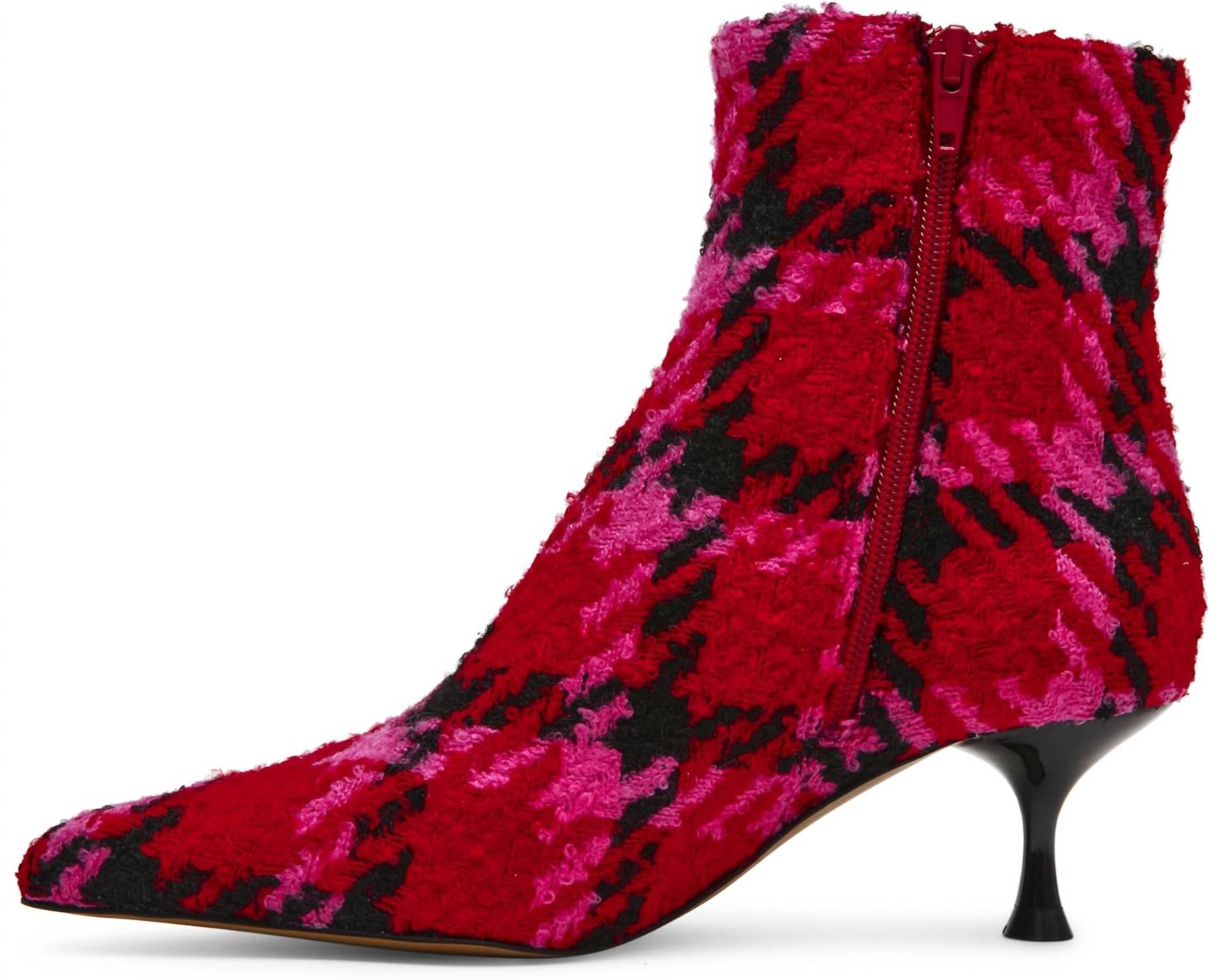 Introducing the Parkker Kitten Heel Booties by Betsey Johnson, a chic addition to your fall wardrobe in a striking red. These booties feature a 5.5" boot shaft height with a bold pointed toe design, a 10" shaft circumference, and a comfortably low 2" kitten heel. Fabric upper and synthetic lining ensure durability, while the side zipper closure offers ease of wear. Perfect for a vintage-inspired holiday party look.