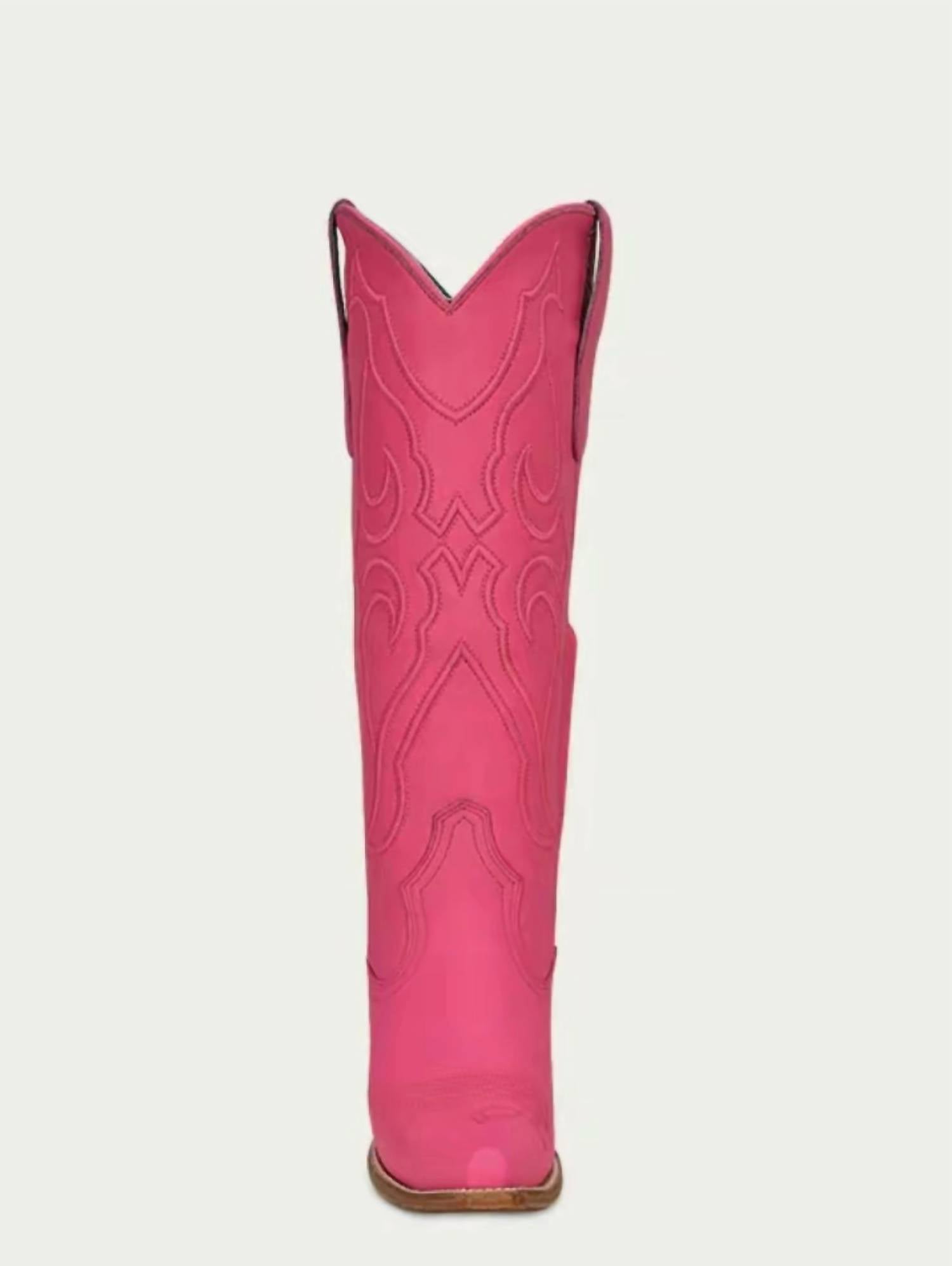 Step into style with the Women's Fuchsia Embroidery Snip Toe Western Boots by Corral. These knee-high boots in Corral Barbie Pink feature a stunning snip toe design, perfect for adding a pop of color to any outfit. The block heel and almond toe shape blend comfort with elegance, making them ideal for dinner parties and springtime celebrations like Cinco De Mayo. Crafted with attention to natural leather characteristics such as wrinkles and markings, these boots offer a unique, authentic look that favors the current western trend. Closure: Zipper detail.